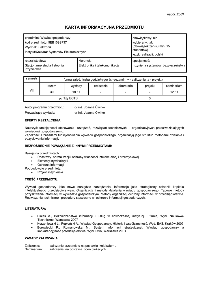 nabór_2009 KARTA INFORMACYJNA PRZEDMIOTU przedmiot: Wywiad gospodarczy kod przedmiotu: 5EB109S737 Wydział: Elektroniki Instytut/Katedra: Systemów Elektronicznych obowiązkowy: nie wybierany: tak (obowiązek zapisu min. 15 studentów) język realizacji: polski rodzaj studiów: Stacjonarne studia I stopnia inżynierskie specjalność: Inżynieria systemów bezpieczeństwa semestr kierunek: Elektronika i telekomunikacja forma zajęć, liczba godzin/rygor (x -egzamin, + - zaliczenia, # - projekt) VII razem wykłady ćwiczenia laboratoria projekt seminarium 30 18 / + - - - 12 / + punkty ECTS Autor programu przedmiotu: dr inż. Joanna Ćwirko Prowadzący wykłady: dr inż. Joanna Ćwirko 3 EFEKTY KSZTAŁCENIA: Nauczyć: umiejętności stosowania urządzeń, rozwiązań technicznych i organizacyjnych przeciwdziałających wywiadowi gospodarczemu. Zapoznać: z zasadami funkcjonowania wywiadu gospodarczego, organizacją jego struktur, metodami działania i pozyskiwania informacji. BEZPOŚREDNIE POWIĄZANIE Z INNYMI PRZEDMIOTAMI: Bazuje na przedmiotach: • Podstawy normalizacji i ochrony własności intelektualnej i przemysłowej • Elementy kryminalistyki • Ochrona informacji Podbudowuje przedmioty: • Projekt inżynierski TREŚĆ PRZEDMIOTU: Wywiad gospodarczy jako nowe narzędzie zarządzania. Informacja jako strategiczny składnik kapitału intelektualnego przedsiębiorstwem. Organizacja i metody działania wywiadu gospodarczego. Typowe metody pozyskiwania informacji w wywiadzie gospodarczym. Metody organizacji ochrony informacji w przedsiębiorstwie. Rozwiązania techniczne i procedury stosowane w ochronie informacji gospodarczych. LITERATURA: • • • Białas A., Bezpieczeństwo informacji i usług w nowoczesnej instytucji i firmie, Wyd. NaukowoTechniczne, Warszawa 2007 Korzeniowski L., Pepłoński A., Wywiad Gospodarczy. Historia i współczesność, Wyd. EAS, Kraków 2005 Borowiecki R., Romanowska M., System informacji strategicznej. Wywiad gospodarczy a konkurencyjność przedsiębiorstwa, Wyd. Difin, Warszawa 2001 ZASADY ZALICZANIA: Zaliczenie: Seminarium: zaliczenie przedmiotu na postawie kolokwium . zaliczenie na postawie ocen bieżących.
