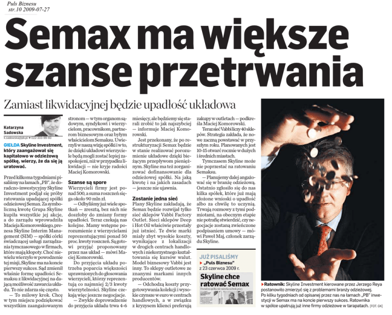 Puls Biznesu str.10 2009-07-27 Semax ma większe szanse przetrwania Zamiast likwidacyjnej będzie upadłość układowa Katarzyna Sadowska [email protected] ☎ 022-333-99-83 GIEŁDA Skyline Investment, który zaangażował się kapitałowo w odzieżową spółkę, wierzy, że da się ją uratować. Przed kilkoma tygodniami pisaliśmy nałamach „PB”, że doradczo-inwestycyjny Skyline Investment podjął się próby ratowania upadającej spółki odzieżowej Semax. Za symboliczną kwotę Grupa Skyline kupiła wszystkie jej akcje, a do zarządu wprowadziła Macieja Komorowskiego, prezesa Skyline Interim Management (SIM) — spółki córki świadczącej usługi zarządzania tymczasowego w firmach, które mają kłopoty. Choć niewielu wierzyło w powodzenie tej misji, Skyline ma na koncie pierwszy sukces. Sąd zmienił właśnie formę upadłości Semaksu z likwidacyjnej na dającą możliwość zawarcia układu. To nie zdarza się często. — To milowy krok. Chcę w tym miejscu podziękować wszystkim zaangażowanym stronom —wtym organom sądowym, syndykowi i wierzycielom, pracownikom, partnerom biznesowym oraz byłym właścicielom Semaksu. Uwierzyli wnaszą wizję spółki iwto, że dzięki układowi wierzyciele będą mogli zostać lepiej zaspokojeni, niż w przypadku likwidacji — nie kryje radości Maciej Komorowski. Szanse są spore Wierzycieli firmy jest ponad 500, a suma roszczeń sięga około 90 mln zł. — Odbyliśmy już wiele spotkań — zresztą, bez nich nie doszłoby do zmiany formy upadłości. Teraz czekają nas kolejne. Mamy wstępne porozumienie z wierzycielami reprezentującymi ponad 50 proc. kwoty roszczeń. Są gotowi przyjąć proponowany przez nas układ — mówi Maciej Komorowski. Do przyjęcia układu potrzeba poparcia większości uprawnionych do głosowania wierzycieli, którzy reprezentują co najmniej 2/3 kwoty wierzytelności. Skyline czekają więc jeszcze negocjacje. — Zwykle doprowadzenie do przyjęcia układu trwa 4-6 miesięcy, ale będziemy się starali zrobić to jak najszybciej — informuje Maciej Komorowski. Jest przekonany, że po restrukturyzacji Semax będzie w stanie realizować porozumienie układowe dzięki bieżącym przepływom pieniężnym. Skyline ma też zorganizować dofinansowanie dla odzieżowej spółki. Na jaką kwotę i na jakich zasadach — jeszcze nie ujawnia. Zostanie jedna sieć Plany Skyline zakładają, że Semax będzie rozwijał tylko sieć sklepów Vabbi Factory Outlet. Sieci sklepów Deep i Hot Oil właściwie przestały już istnieć. Te dwie marki miały zbyt wysokie koszty, wynikające z lokalizacji w drogich centrach handlowych i niekorzystnego kształtowania się kursów walut. Model biznesowy Vabbi jest inny. To sklepy outletowe ze znanymi markami innych producentów. — Odchodzą koszty przygotowywania kolekcji i wysokie czynsze w euro w centrach handlowych, a w związku z kryzysem klienci preferują zakupy w outletach — podkreśla Maciej Komorowski. Teraz sieć Vabbi liczy40 sklepów. Strategia zakłada, że nowe zaczną powstawać w przyszłym roku. Planowanych jest 10-15 otwarć rocznie wdużych i średnich miastach. Tymczasem Skyline może nie poprzestać na ratowaniu Semaksu. — Planujemy dalej angażować się w branżę odzieżową. Ostatnio zgłosiło się do nas kilka spółek, które już mają złożone wnioski o upadłość albo za chwilę to uczynią. Trwają rozmowy z tymi podmiotami, na obecnym etapie nie potrafię stwierdzić, czy negocjacje zostaną zwieńczone podpisaniem umowy — mówi Paweł Maj, członek zarządu Skyline. JUŻ PISALIŚMY „Puls Biznesu” z 23 czerwca 2009 r. Ratownik: Skyline Investment kierowane przez Jerzego Reya postanowiło zmierzyć się z problemami branży odzieżowej. Po kilku tygodniach od opisanej przez nas na łamach „PB” inwestycji w Semax ma na koncie pierwszy sukces. Ratownika w spółce upatrują już inne firmy odzieżowe w tarapatach. [FOT. GK]