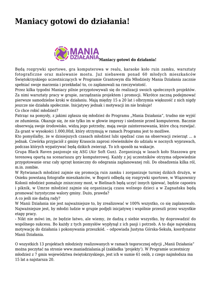 Maniacy gotowi do działania! Maniacy gotowi do działania! Będą rozgrywki sportowe, gra komputerowa w realu, karaoke koło ruin zamku, warsztaty fotograficzne oraz malowanie mostu. Już niebawem ponad 60 młodych mieszkańców Świętokrzyskiego uczestniczących w Programie Grantowym dla Młodzieży Mania Działania zacznie spełniać swoje marzenia i przekładać to, co zaplanowali na rzeczywistość. Przez kilka tygodni Maniacy pilnie przygotowywali się do realizacji swoich społecznych projektów. Za nimi warsztaty pracy w grupie, zarządzania projektem i promocji. Wkrótce zaczną podejmować pierwsze samodzielne kroki w działaniu. Mają między 15 a 20 lat i olbrzymia większość z nich nigdy jeszcze nie działała społecznie. Inicjatywy jednak i motywacji im nie brakuje! Co chce robić młodzież? Patrząc na pomysły, z jakimi zgłasza się młodzież do Programu „Mania Działania”, trudno nie wyjść ze zdumienia. Okazuje się, że nie tylko im w głowie imprezy i siedzenie przed komputerem. Bacznie obserwują swoje środowisko, widzą jego potrzeby, mają swoje zainteresowania, które chcą rozwijać. Za grant w wysokości 1.000,00zł, który otrzymują w ramach Programu jest to możliwe. Kto pomyślałby, że w dzisiejszych czasach młodzież lubi spędzać czas na obserwacji zwierząt … a jednak. Czwórka przyjaciół z gminy Krasocin zaprosi rówieśników do udziału w nocnych wyprawach, podczas których wypatrywać będą dzikich zwierząt. To ich sposób na wakacje. Grupa Black Raven pasjonuje się ASG (Air Soft Gun). Zorganizują w lasach koło Staszowa grę terenową opartą na scenariuszu gry komputerowej. Każdy z jej uczestników otrzyma odpowiednie przygotowanie oraz cały sprzęt konieczny do odegrania zaplanowanej roli. Do obsadzenia kilka ról, m.in. zombie. W Rytwianach młodzież zajmie się promocją ruin zamku i zorganizuje turniej dzikich drużyn, w Osieku powstaną fotografie mieszkańców, w Bogorii odbędą się rozgrywki sportowe, w Wiązownicy Kolonii młodzież pomaluje zniszczony most, w Bielinach będą uczyć innych śpiewać, będzie capoeira i piknik, w Umrze młodzież zajmie się organizacją czasu wolnego dzieci a w Zagnańsku będą promować turystyczne walory gminy. Dużo, prawda? A co jeśli nie dadzą rady? W Manii Działania nie jest najważniejsze to, by zrealizować w 100% wszystko, co się zaplanowało. Najważniejsze jest, by młodzi ludzie w grupie podjęli inicjatywę i wspólnie przeszli przez wszystkie etapy pracy. - Nikt nie mówi im, że będzie łatwo, ale wiemy, że dadzą z siebie wszystko, by doprowadzić do wspólnego sukcesu. Bo każdy z tych pomysłów wypłynął z ich pasji i potrzeb. A to daje największą motywację do działania i pokonywania przeszkód. – odpowiada Justyna Górska-Sekuła, koordynator Manii Działania. O wszystkich 13 projektach młodzieży realizowanych w ramach tegorocznej edycji „Manii Działania” można poczytać na stronie www.maniadzialania.pl (zakładka ‘projekty’). W Programie uczestniczy młodzież z 7 gmin województwa świętokrzyskiego, jest ich w sumie 61 osób, z czego najmłodsza ma 15 lat a najstarsza 20. Gmina Rytwiany - www.rytwiany.com.pl