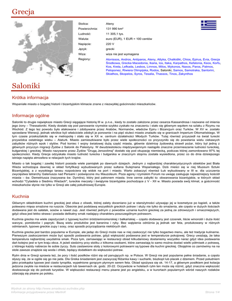 Grecja Stolica: Ateny Powierzchnia: 131 990 km² Ludność: 11 305,1 tys. Waluta: euro (EUR), 1 EUR = 100 centów Napięcie: 220 V Język: grecki Wiza: wiza nie jest wymagana Regiony: Alonissos, Andros, Antiparos, Ateny, Attyka, Chalkidiki, Chios, Epirus, Evia, Grecja Środkowa, Grecka Macedonia, Ikaria, Ios, Itaka, Karpathos, Kefalonia, Keos, Korfu, Kos, Kreta, Lefkada, Lesbos, Limnos, Milos, Mykonos, Naxos, Paros, Patmos, Peloponez, Riwiera Olimpijska, Rodos, Saloniki, Samos, Samotraka, Santorini, Skiathos, Skopelos, Syros, Tesalia, Thassos, Tinos, Zakynthos Saloniki Krótka informacja Wspaniałe miasto o bogatej historii i bizantyjskim klimacie znane z niezwykłej gościnności mieszkańców. Informacje ogólne Saloniki to drugie największe miasto Grecji sięgające historią III w. p.n.e., kiedy to zostało założone przez cesarza Kassandrosa i nazwane od imienia jego żony – Thessaloniki. Kiedy dostało się pod panowanie rzymskie szybko zyskało na znaczeniu i stało się głównym węzłem na szlaku z Rzymu na Wschód. Z tego tez powodu było atakowane i zdobywane przez Arabów, Normanów, władców Epiru i Bizancjum oraz Turków. W XV w. zostało sprzedane Wenecji, jednak wkrótce byli właściciele zdobyli je ponownie i na pięć stuleci miasto znalazło się w granicach Imperium Ottomańskiego. W tym czasie przekształciło się w metropolię i stało się w XX w. centrum działalności Młodych Turków. Tutaj również przyszedł na świat turecki przywódca ostatniego wieku – Ataturk. Miasto zamieszkiwane było przez wiele społeczności co przyczyniło się do powstania wielu ciekawych zabytków różnych epok i stylów. Pod koniec I wojny światowej dużą część miasta, głównie dzielnicę żydowską strawił pożar, który był jedną z głównych przyczyn migracji Żydów z Salonik do Palestyny. W dwudziestoleciu międzywojennym nastąpiło znaczne przemieszanie ludności tureckiej, bułgarskiej i greckiej. Miasto nazywane przez Żydów "Drugą Jerozolimą" dostało się pod okupację niemiecką, podczas której zamordowano 97% tej społeczności. Kiedy Grecja odzyskała miasto ludność turecka i bułgarska w znacznym stopniu została wysiedlona, przez co do dnia dzisiejszego istnieje napięta atmosfera w relacjach tych krajów. Miasto o tak bogatej i zawiłej historii posiada wiele pamiątek po dawnych dziejach. Jednym z najbardziej charakterystycznych obiektów jest Biała Wieża wchodząca dawniej w skład fortyfikacji wybudowanych przez sułtana Sulejmana Wspaniałego. Dziś mieści się w niej Muzeum Sztuki Bizantyjskiej, a z wysokiego tarasu rozpościera się widok na port i miasto. Warto zobaczyć również Łuk wybudowany w III w. dla uczczenia zwycięstwa tetrarchy Galeriusza nad Persami i poświęcone mu Mauzoleum. Poza agorą i rzymskim Forum na uwagę zasługuje najważniejszy kościół miasta – św. Demetriusza (nazywana św. Dymitra), który jest patronem miasta. Inne cenne zabytki to: obwarowania bizantyjskie, w których skład wchodzi "Cytadela o Siedmiu Wieżach", tureckie meczety i świątynie bizantyjskie pochodzące z V - XII w. Miasto posiada swój klimat, a gościnność mieszkańców słynie nie tylko w Grecji ale całej południowej Europie. Kuchnia Głównym składnikiem kuchni greckiej jest oliwa z oliwek, której zalety doceniano już w starożytności używając jej w kosmetyce po kąpieli, a także polewano mięsa smażone na ruszcie. Obecnie jest podstawą wszystkich greckich potraw i służy nie tylko do smażenia, ale często w dużych ilościach dodawana jest do sałatek, sosów a nawet zup. Jest również jednym z powodów uznania kuchni greckiej za jedną ze zdrowszych i smaczniejszych, gdyż oliwa jest lekko strawa i posiada delikatny smak nadający charakteru poszczególnym potrawom. Kuchnia grecka ma wiele zapożyczeń z typowej kuchni śródziemnomorskiej i bałkańskiej – często dodawany jest czosnek, liście winorośli i duża ilość warzyw, pomidorów i papryki. Bazą wielu produktów jest baranina i ryby. Bez wątpienia odróżnia ją jednak ser feta, produkowany w różnych odmianach, typowe greckie zupy i sosy, oraz sposób przyrządzania niektórych dań. Kuchnia grecka jest bardzo popularna w Europie, ale jadąc do Grecji może nas w niej zaskoczyć nie tylko bogactwo menu, ale też tradycje kulinarne. Pierwszym zaskoczeniem może być sposób podawania potraw, gdyż większość podawana jest w temperaturze pokojowej. Grecy uważają, że taka temperatura najbardziej uwydatnia smak. Poza tym, zamawiając w restauracji obiad kilkudaniowy dostaniemy wszystko naraz gdyż idea podawania dań kolejno jest w tym kraju obca. A jeżeli siedzimy przy stoliku z kilkoma osobami, które zamawiają to samo można dostać wielki półmisek z potrawą, z którego każdy nabierze ile sobie życzy. Suto zastawione stoły z kolorowymi potrawami są typowe dla kuchni greckiej. Obojętnie co zamówimy na na stole zawsze znajdzie się woda i chleb, będący dodatkiem do większości potraw. Rytm dnia w Grecji sprawia też, że pory i ilość posiłków różni się od panujących np. w Polsce. W Grecji nie jest popularne pełne śniadanie, a często słyszy się, że w ogóle się go nie jada. Dla Greka śniadaniem jest zazwyczaj filiżanka kawy i sucharki, biszkopt lub placek z dżemem. Przed południem jako przekąska typowe jest ciasto tyropitta, wypełnione gorącym płynnym serem feta. Obiad spożywa się ok. 14-17, a głównym posiłkiem jest kolacja jedzona zwykle na mieście w restauracjach lub tawernach ok. godz. 20-22. Oczywiście w hotelach rytm ten może się różnić, gdyż znaczna większość dostosowuje się do potrzeb turystów. W większości restauracji menu pisane jest po angielsku, a w kurortach popularnych wśród naszych rodaków zdarzają się pisane po polsku. Wydruk ze strony http://www.amadeusz.eu/index.php Informacje przygotowane przez MerlinX Strona 1/4 Jeżeli chcemy spróbować typowej greckiej k