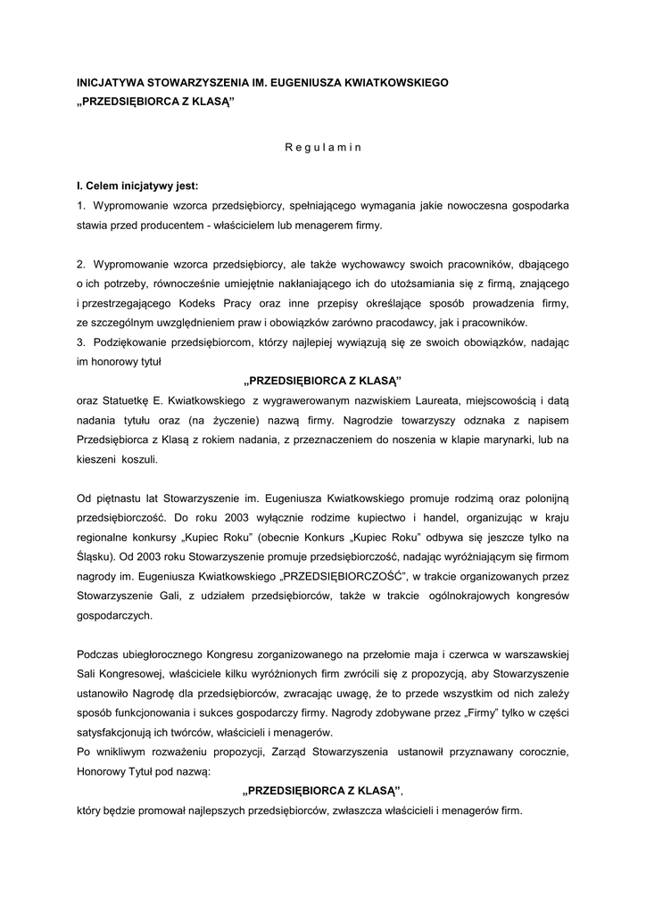 INICJATYWA STOWARZYSZENIA IM. EUGENIUSZA KWIATKOWSKIEGO „PRZEDSIĘBIORCA Z KLASĄ” Regulamin I. Celem inicjatywy jest: 1. Wypromowanie wzorca przedsiębiorcy, spełniającego wymagania jakie nowoczesna gospodarka stawia przed producentem - właścicielem lub menagerem firmy. 2. Wypromowanie wzorca przedsiębiorcy, ale także wychowawcy swoich pracowników, dbającego o ich potrzeby, równocześnie umiejętnie nakłaniającego ich do utożsamiania się z firmą, znającego i przestrzegającego Kodeks Pracy oraz inne przepisy określające sposób prowadzenia firmy, ze szczególnym uwzględnieniem praw i obowiązków zarówno pracodawcy, jak i pracowników. 3. Podziękowanie przedsiębiorcom, którzy najlepiej wywiązują się ze swoich obowiązków, nadając im honorowy tytuł „PRZEDSIĘBIORCA Z KLASĄ” oraz Statuetkę E. Kwiatkowskiego z wygrawerowanym nazwiskiem Laureata, miejscowością i datą nadania tytułu oraz (na życzenie) nazwą firmy. Nagrodzie towarzyszy odznaka z napisem Przedsiębiorca z Klasą z rokiem nadania, z przeznaczeniem do noszenia w klapie marynarki, lub na kieszeni koszuli. Od piętnastu lat Stowarzyszenie im. Eugeniusza Kwiatkowskiego promuje rodzimą oraz polonijną przedsiębiorczość. Do roku 2003 wyłącznie rodzime kupiectwo i handel, organizując w kraju regionalne konkursy „Kupiec Roku” (obecnie Konkurs „Kupiec Roku” odbywa się jeszcze tylko na Śląsku). Od 2003 roku Stowarzyszenie promuje przedsiębiorczość, nadając wyróżniającym się firmom nagrody im. Eugeniusza Kwiatkowskiego „PRZEDSIĘBIORCZOŚĆ”, w trakcie organizowanych przez Stowarzyszenie Gali, z udziałem przedsiębiorców, także w trakcie ogólnokrajowych kongresów gospodarczych. Podczas ubiegłorocznego Kongresu zorganizowanego na przełomie maja i czerwca w warszawskiej Sali Kongresowej, właściciele kilku wyróżnionych firm zwrócili się z propozycją, aby Stowarzyszenie ustanowiło Nagrodę dla przedsiębiorców, zwracając uwagę, że to przede wszystkim od nich zależy sposób funkcjonowania i sukces gospodarczy firmy. Nagrody zdobywane przez „Firmy” tylko w części satysfakcjonują ich twórców, właścicieli i menagerów. Po wnikliwym rozważeniu propozycji, Zarząd Stowarzyszenia ustanowił przyznawany corocznie, Honorowy Tytuł pod nazwą: „PRZEDSIĘBIORCA Z KLASĄ”, który będzie promował najlepszych przedsiębiorców, zwłaszcza właścicieli i menagerów firm. II. Pomysłodawcą i organizatorem corocznych edycji przyznawania tytułu „PRZEDSIĘBIORCA Z KLASĄ” jest Stowarzyszenie im. Eugeniusza Kwiatkowskiego, z siedzibą w Poznaniu. 1. Nominowanie odbywa się w sposób pisemny, poprzez złożenie do Biura Stowarzyszenia stosownego wniosku. Wzory nominacji można pobrać ze strony internetowej Stowarzyszenia www.ekwiatkowski.poznan.pl oraz z Biura Stowarzyszenia, organizatora Inicjatywy. 2. O nominowanie do tytułu Stowarzyszenie zwróci się do samorządów wszystkich szczebli, aby zwróciły się do poprzez: a. Związki Zawodowe, jeśli ilość zatrudnionych w firmie przekracza 100 osób; b. Radę Pracowniczą, w firmach, w których ilość zatrudnionych nie przekracza 100 osób; (o możliwościach nominowania zawiadamia nominujących dyrekcja Firmy) c. Dokumenty nominujące należy przesłać do Biura Stowarzyszenia niezwłocznie po zakończeniu procesu nominacyjnego. Wręczenie Tytułu nastąpi w trakcie najbliższej Gali „Przedsiębiorczość” organizowanej przez Stowarzyszenie im. Eugeniusza Kwiatkowskiego. O fakcie zostania laureatem oraz o terminie wręczenia tytułu, organizatorzy powiadamiają Laureatów na 2 tygodnie przed uroczystością nadania. d. Poszczególne wnioski rozpatrywane są przez Kapitułę, która nadaje Tytuł najbardziej zasłużonym przedsiębiorcom. Kapituła zostaje powołana przez Zarząd Stowarzyszenia na okres jednego roku. Kapituła decyduje także o ilości przyznanych Tytułów. e. Decyzje Kapituły są ostateczne. f. Do wniosku nominacyjnego należy dołączyć n/w dokumenty: - Uzasadnienie, które może stanowić osobny dokument, lub część Wniosku nominującego; - podpisane oświadczenie o znajomości i przestrzeganiu postanowień regulaminu; - zaświadczenie „o nie zaleganiu firmy” ( ZUS oraz Urząd Skarbowy); - oświadczenie o terminowym regulowaniu obowiązków firmy wobec kontrahentów, zgodnie z zawartymi umowami; - Zlecenie na udział w Katalogu „Z nimi warto robić interesy” należy przesłać po otrzymaniu zawiadomienia o zostaniu laureatem. Zawiadomienie wraz z drukiem zlecenia zostanie przesłane osobnym listem; W załączniku wniosek z uzasadnieniem) do nominacyjny, Biura który po wypełnieniu Stowarzyszenia im. E. należy Kwiatkowskiego, przesłać pod (wraz adresem: Stowarzyszenie im. Eugeniusza Kwiatkowskiego, ul. Bukowska 12, 60 – 810 Poznań z dopiskiem „Przedsiębiorca z klasą”. 3. „Plastyczna formuła Tytułu” a. Laureaci otrzymują mosiężną statuetkę Eugeniusza Kwiatkowskiego z napisem „Przedsiębiorca z Klasą”, nazwiskiem przedsiębiorcy oraz nazwą przedsiębiorstwa i datą nadania tytułu. b. Statuetce towarzyszy odznaka w kształcie mosiężnej, prostokątnej płytki o wymiarach 5 x 30 mm z napisem ”Przedsiębiorca z Klasą” z rokiem nadania. Płytka może być noszona na kieszeni koszuli, lub na wyłogu marynarki. c. O tytuł dla tego samego kandydata można występować corocznie przez 3 lata. Po tym okresie zdobywany tytuł (przez 3 krotnego laureata) będzie brzmiał: „PRZEDSIĘBIORCA NAJWYŻSZEJ KLASY”. Warunki zdobywania tytułu „Przedsiębiorca Najwyższej Klasy” zostaną opublikowane na stronach internetowych Stowarzyszenia do końca 2010 roku, wraz z warunkami jego zdobycia. Pierwsze wręczenie tytułu „Przedsiębiorca z Klasą” może nastąpić w trakcie uroczystości obchodów 15-lecia powstania Stowarzyszenia w maju 2010 roku. Fakt nadania tytułu zostanie ogłoszony w kolejnym Katalogu „Przedsiębiorczoś