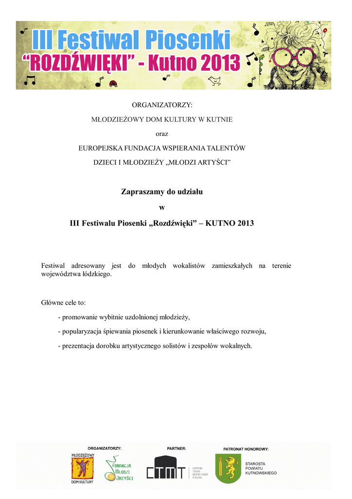 ORGANIZATORZY: MŁODZIEŻOWY DOM KULTURY W KUTNIE oraz EUROPEJSKA FUNDACJA WSPIERANIA TALENTÓW DZIECI I MŁODZIEŻY „MŁODZI ARTYŚCI” Zapraszamy do udziału w III Festiwalu Piosenki „Rozdźwięki” – KUTNO 2013 Festiwal adresowany jest do młodych wokalistów zamieszkałych na terenie województwa łódzkiego. Główne cele to: - promowanie wybitnie uzdolnionej młodzieży, - popularyzacja śpiewania piosenek i kierunkowanie właściwego rozwoju, - prezentacja dorobku artystycznego solistów i zespołów wokalnych. REGULAMIN I. ZASADY UCZESTNICTWA 1. W konkursie mogą uczestniczyć dzieci i młodzież w wieku od 7 do 21 lat w następujących grupach wiekowych (wg roku urodzenia): - I grupa - roczniki 2003-2006, - II grupa - roczniki 2000-2002, - III grupa - roczniki 1997-1999, - IV grupa - roczniki 1992-1996. 2. Uczestnikami konkursu mogą być soliści oraz zespoły wokalne (do 6 osób) z wyłączeniem laureatów nagród Grand Prix festiwali organizowanych przez Fundację „Młodzi Artyści”. II. REPERTUAR 1. Każdy wykonawca zobowiązany jest przygotować na eliminacje dwie piosenki: - jedną obowiązkową z pierwszej, drugiej, trzeciej, czwartej lub piątej płyty Fundacji, z serii „Młodzi Artyści Śpiewają”, - cegiełka wraz z płytą na rzecz fundacji do kupienia na stronie internetowej www.mlodziartysci.eu, w Młodzieżowym Domu Kultury w Kutnie - drugą dowolną piosenkę w języku polskim – mile widziane nowe interpretacje znanych piosenek. 2. Warunkiem uczestnictwa w festiwalu jest podanie na karcie zgłoszenia numeru identyfikacyjnego, który jest zamieszczony na piątej płycie – „Młodzi Artyści Śpiewają 2013”, bez względu na to z której płyty zgłaszana jest piosenka. Formularz karty zgłoszenia dostępny jest na stronach http://www.mlodziartysci.eu/zgloszenie, www.mdkkutno.pl www.piosenkakutno.pl Zgłoszenia przyjmujemy do dnia 03 kwietnia 2013 r. 3. Na płytach znajdują się również podkłady muzyczne do piosenek. 4. Nuty i słowa piosenek zamieszczone są na www.mlodziartysci.eu 5. Dopuszcza się przygotowanie obu piosenek z repertuaru, który znajduje się na płytach Fundacji. 6. Uczestnicy przygotowują piosenki z pełnym podkładem muzycznym (na płycie CD audio) lub przy akompaniamencie własnym (inst. klawiszowe, gitara, itp.) III. ELIMINACJE 1. Przesłuchania eliminacyjne do III Festiwalu Piosenki „Rozdźwięki” – Kutno 2013 odbędą się dnia 05 kwietnia 2013 r. od godz. 15.00 w Centrum Teatru Muzyki i Tańca w Kutnie, ul. Teatralna 1, 99-300 Kutno 2. Podczas przesłuchań Rada Artystyczna wybierze osoby zaproszone do udziału w Warsztatach Wokalnych oraz Koncercie Konkursowym. 3. Decyzje Rady Artystycznej są ostateczne. IV. WARSZTATY WOKALNE i KONCERT KONKURSOWY 1. Dnia 6 kwietnia 2013 roku w Centrum Teatru Muzyki i Tańca w Kutnie odbędą się Warsztaty Wokalne oraz Koncert Konkursowy III Festiwalu Piosenki „Rozdźwięki” – Kutno 2013, według poniższego planu: - godz. 11.00 - 14.00 Warsztaty wokalne z Anną Ozner - godz. 14.00 - 15.00 Próba akustyczna - godz. 17.00 Koncert Konkursowy 2. W Koncercie Konkursowym solista lub zespół wokalny wyłoniony w trakcie eliminacji prezentuje jeden utwór. 3. Rada Artystyczna festiwalu zastrzega sobie prawo wyboru tego utworu spośród dwóch prezentowanych podczas eliminacji. V. JURY i NAGRODY 1. Wszystkie prezentacje w koncercie konkursowym będą oceniane przez jury. 2. Ocenie podlegać będą: a) walory wokalne b) umiejętności warsztatowe c) interpretacja utworu d) dobór repertuaru i możliwości wykonawcy 3. Decyzje Jury są ostateczne. 4. NAGRODY Grand Prix III Festiwalu Piosenki „Rozdźwięki” – Kutno 2013 – 1.000 zł Nagrody rzeczowe oraz wyróżnienia. Jury ma prawo zaprosić jednego lub dwóch spośród głównych laureatów do udziału w Ogólnopolskim Festiwalu Piosenki Dziecięcej i Młodzieżowej FUMA –Zielona Góra 2013. Informacje ogólne - Uczestnicy eliminacji oraz koncertu dojeżdżają na koszt własny, - Niepełnoletnim uczestnikom konkursu musi towarzyszyć pełnoletni opiekun lub rodzic, - Uczestnik konkursu zezwala na wykorzystanie i przetwarzanie danych zawartych w karcie zgłoszenia, - Sprawy nie ujęte w regulaminie rozstrzyga organizator. - Decyzje Rady Artystycznej oraz Jury są ostateczne i nieodwołalne. - Organizatorzy zastrzegają sobie prawo do wielokrotnej rejestracji, wielokrotnego publicznego wykonania i odtwarzania, wielokrotnej publicznej emisji radiowej i telewizyjnej prezentacji artystycznych uczestników imprezy, bez wypłacania im honorariów. Wszelkich informacji organizacyjnych, programowych i technicznych udzielają: Młodzieżowy Dom Kultury w Kutnie Radosław Rojewski Tel. 603809685 Europejska Fundacja Wspierania Talentów Dzieci i Młodzieży „Młodzi Artyści” Paweł Słoniowski [email protected] tel. 602590776
