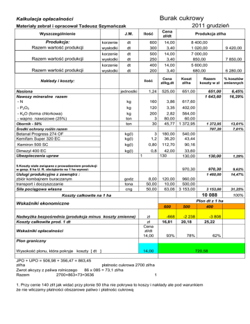 Burak cukrowy Kalkulacja opłacalności 2011 grudzień Materiały zebrał i opracował Tadeusz Szymańczak Wyszczególnienie J.M. Ilość Cena zł/dt Produkcja zł/ha Produkcja: Razem wartość produkcji korzenie wysłodki dt dt 600 300 14,00 3,40 8 400,00 1 020,00 9 420,00 Razem wartość produkcji korzenie wysłodki dt dt 500 250 14,00 3,40 7 000,00 850,00 7 850,00 Razem wartość produkcji korzenie wysłodki dt dt 400 200 14,00 3,40 5 600,00 680,00 6 280,00 Nakłady i koszty: Nasiona Nawozy mineralne razem -N Ilość Cena zł/kg,dt Koszt zł/ha jednostki 1,24 525,00 651,00 kg 160 3,86 617,60 - P2O5 kg 120 3,35 402,00 - K2O (forma chlorkowa) - wapno nawozowe (25%) kg ton ton 200 3 30 Betanal Progress 274 OF Kemifam Super 320 EC kg(l) kg(l) 3 1,2 180,00 36,20 540,00 43,44 Kemiron 500 SC kg(l) 0,80 112,70 90,16 Dimezyl 400 EC Ubezpieczenia upraw kg(l) 0,8 42,00 130 Obornik - 50% Środki ochrony roślin razem 1 godz tona cng 8,00 50,00 50,00 6,45% 16,29% 1 372,95 707,20 13,61% 7,01% 33,60 130,00 130,00 1,29% 970,30 970,30 1 460,00 9,62% 14,47% 3 153,00 31,25% 120,00 960,00 10,00 500,00 63,06 3 153,00 10 088 Koszty całkowite na 1 ha Wskaźniki ekonomiczne Nadwyżka bezpośrednia (produkcja minus koszty zmienne) Koszty całkowite prod. 1 dt Wskaźniki opłacalności 600 zł zł Cena zł/dt 14,00 500 Plon dt z 1 ha 400 -668 16,81 -2 238 20,18 -3 808 25,22 93% 78% 62% Plon graniczny Wysokość plonu, która pokryje koszty [ dt ] 14,00 % kosztów zmiennych 651,00 1 643,60 2,82 564,00 80,00 60,00 45,77 1 372,95 5.Koszty stałe związane z prowadzeniem produkcji w gosp. 8 ha U. R. obciążenie na 1 ha wynosi: Usługi produkcyjne z zewnątrz : zbiór kombajnem buraczanym transport i doczyszczanie Siła pociągowa własna Razem koszty w zł 720,58 JPO + UPO = 506,98 + 356,47 = 863,45 zł/ha płatnośc cukrowa 2700 zł/ha Zwrot akcyzy z paliwa rolniczego 86 x 085 = 73,1 zł/ha Razem 2700+863+73=3636 1 1. Przy cenie 140 zł/t jak widać przy plonie 50 t/ha nie pokrywa to koszy i nakłady ale pod warunkiem że nie wliczamy płatności obszarowe paliwo i płatnośc cukrową 100%
