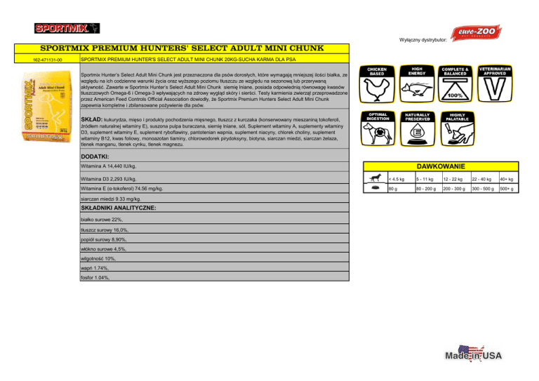 Wyłączny dystrybutor: SPORTMIX PREMIUM HUNTERS' SELECT ADULT MINI CHUNK 162-471131-00 SPORTMIX PREMIUM HUNTER'S SELECT ADULT MINI CHUNK 20KG-SUCHA KARMA DLA PSA Sportmix Hunter’s Select Adult Mini Chunk jest przeznaczona dla psów dorosłych, które wymagają mniejszej ilości białka, ze względu na ich codzienne warunki Ŝycia oraz wyŜszego poziomu tłuszczu ze względu na sezonową lub przerywaną aktywność. Zawarte w Sportmix Hunter’s Select Adult Mini Chunk siemię lniane, posiada odpowiednią równowagę kwasów tłuszczowych Omega-6 i Omega-3 wpływających na zdrowy wygląd skóry i sierści. Testy karmienia zwierząt przeprowadzone przez American Feed Controls Official Association dowiodły, Ŝe Sportmix Premium Hunters Select Adult Mini Chunk zapewnia kompletne i zbilansowane poŜywienie dla psów. SKŁAD: kukurydza, mięso i produkty pochodzenia mięsnego, tłuszcz z kurczaka (konserwowany mieszaniną tokoferoli, źródłem naturalnej witaminy E), suszona pulpa buraczana, siemię lniane, sól, Suplement witaminy A, suplementy witaminy D3, suplement witaminy E, suplement ryboflawiny, pantotenian wapnia, suplement niacyny, chlorek choliny, suplement witaminy B12, kwas foliowy, monoazotan tiaminy, chlorowodorek pirydoksyny, biotyna, siarczan miedzi, siarczan Ŝelaza, tlenek manganu, tlenek cynku, tlenek magnezu. DODATKI: DAWKOWANIE Witamina A 14,440 IU/kg, Witamina D3 2,293 IU/kg, < 4.5 kg 5 - 11 kg 12 - 22 kg 22 - 40 kg 40+ kg Witamina E (α-tokoferol) 74.56 mg/kg. 80 g 80 - 200 g 200 - 300 g 300 - 500 g 500+ g siarczan miedzi 9.33 mg/kg. SKŁADNIKI ANALITYCZNE: białko surowe 22%, tłuszcz surowy 16,0%, popiół surowy 8,90%, włókno surowe 4,5%, wilgotność 10%, wapń 1.74%, fosfor 1.04%,