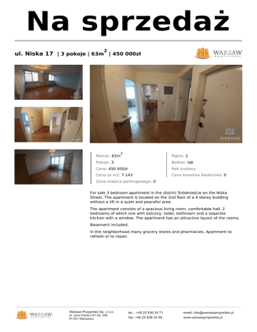 Na sprzedaż 2 ul. Niska 17 | 3 pokoje | 63m | 450 000zł Metraż: 63m 2 Piętro: 2 Pokoje: 3 Balkon: tak Cena: 450 000zł Rok budowy: Cena za m2: 7 143 Cena komórka lokatorska: 0 Cena miejsca parkingowego: 0 For sale 3 bedroom apartment in the district Śródmieście on the Niska Street. The apartment is located on the 2nd floor of a 4 storey building without a lift in a quiet and peaceful area. The apartment consists of a spacious living room, comfortable hall, 2 bedrooms of which one with balcony, toilet, bathroom and a separate kitchen with a window. The apartment has an attractive layout of the rooms. Basement included. In the neighborhood many grocery stores and pharmacies. Apartment to refresh or to repair.