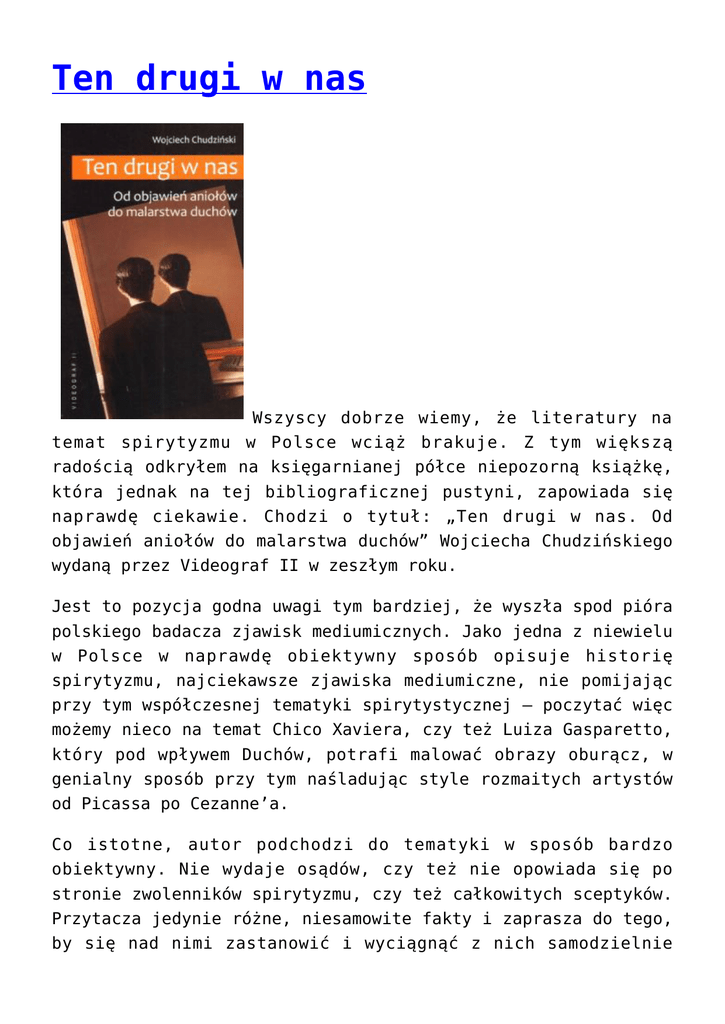 Ten drugi w nas Wszyscy dobrze wiemy, że literatury na temat spirytyzmu w Polsce wciąż brakuje. Z tym większą radością odkryłem na księgarnianej półce niepozorną książkę, która jednak na tej bibliograficznej pustyni, zapowiada się naprawdę ciekawie. Chodzi o tytuł: „Ten drugi w nas. Od objawień aniołów do malarstwa duchów” Wojciecha Chudzińskiego wydaną przez Videograf II w zeszłym roku. Jest to pozycja godna uwagi tym bardziej, że wyszła spod pióra polskiego badacza zjawisk mediumicznych. Jako jedna z niewielu w Polsce w naprawdę obiektywny sposób opisuje historię spirytyzmu, najciekawsze zjawiska mediumiczne, nie pomijając przy tym współczesnej tematyki spirytystycznej – poczytać więc możemy nieco na temat Chico Xaviera, czy też Luiza Gasparetto, który pod wpływem Duchów, potrafi malować obrazy oburącz, w genialny sposób przy tym naśladując style rozmaitych artystów od Picassa po Cezanne’a. Co istotne, autor podchodzi do tematyki w sposób bardzo obiektywny. Nie wydaje osądów, czy też nie opowiada się po stronie zwolenników spirytyzmu, czy też całkowitych sceptyków. Przytacza jedynie różne, niesamowite fakty i zaprasza do tego, by się nad nimi zastanowić i wyciągnąć z nich samodzielnie wnioski.