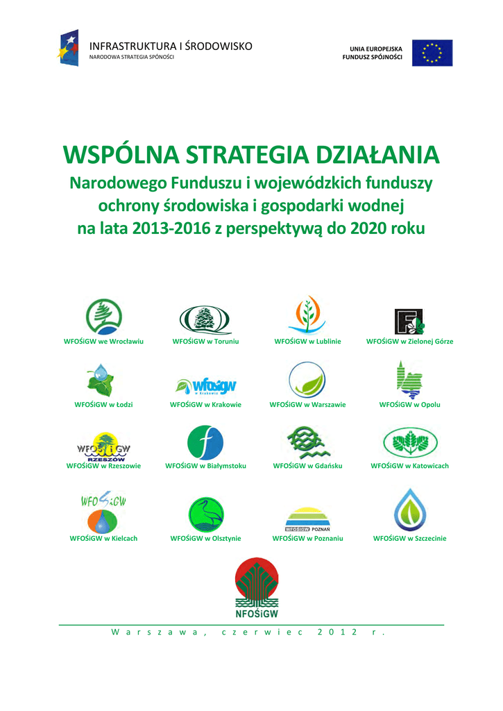 INFRASTRUKTURA I ŚRODOWISKO UNIA EUROPEJSKA FUNDUSZ SPÓJNOŚCI NARODOWA STRATEGIA SPÓNOŚCI WSPÓLNA STRATEGIA DZIAŁANIA Narodowego Funduszu i wojewódzkich funduszy ochrony środowiska i gospodarki wodnej na lata 2013-2016 z perspektywą do 2020 roku WFOŚiGW we Wrocławiu WFOŚiGW w Toruniu WFOŚiGW w Lublinie WFOŚiGW w Zielonej Górze WFOŚiGW w Łodzi WFOŚiGW w Krakowie WFOŚiGW w Warszawie WFOŚiGW w Opolu WFOŚiGW w Rzeszowie WFOŚiGW w Białymstoku WFOŚiGW w Gdańsku WFOŚiGW w Katowicach WFOŚiGW w Kielcach WFOŚiGW w Olsztynie WFOŚiGW w Poznaniu WFOŚiGW w Szczecinie W a r s z a w a , c z e r w i e c 2 0 1 2 r . WSPÓLNA STRATEGIA DZIAŁANIA Narodowego Funduszu i wojewódzkich funduszy ochrony środowiska i gospodarki wodnej na lata 2013-2016 z perspektywą do 2020 r. Zespół Roboczy ds. Wspólnej Strategii: Komitet Sterujący Projektu 1. Małgorzata Skucha, Z-ca Prezesa Zarządu NFOŚiGW, Przewodnicząca Komitetu, 2. Ryszard Ochwat, Z-ca Dyrektora Biura NFOŚiGW, 3. Dorota Comberska, Dyrektor Departamentu Planowania i Sprawozdawczości NFOŚiGW, 4. Gabriela Lenartowicz, Prezes Zarządu WFOŚiGW w Katowicach, 5. Hanna Grunt, Prezes Zarządu WFOŚiGW w Poznaniu, 6. Marek Mielczarek, Prezes Zarządu WFOŚiGW we Wrocławiu. Grupa Robocza 1. Janusz Bednarczyk, NFOŚiGW, Przewodniczący Grupy, 2. Dobrochna Derecka, Ministerstwo Środowiska, 3. Andrzej Żyłajtys, WFOŚiGW we Wrocławiu, 4. Krzysztof Mączkowski, WFOŚiGW w Poznaniu, 5. Agnieszka Wojtach, WFOŚiGW w Gdańsku, 6. Piotr Biernat, WFOŚiGW w Katowicach, 7. Lesław Puczniewski, NFOŚiGW, 8. Maria Urbowicz, NFOŚiGW, 9. Ryszard Jurczak, NFOŚiGW, 10. Ernest Hys, NFOŚiGW, 11. Maciej Grzelec, NFOŚiGW. Wsparcie doradcze w zakresie metodyki planowania strategicznego Wojciech Kłosowski 2 WSPÓLNA STRATEGIA DZIAŁANIA Narodowego Funduszu i wojewódzkich funduszy ochrony środowiska i gospodarki wodnej na lata 2013-2016 z perspektywą do 2020 r. 3 1. Streszczenie Strategii Narodowy Fundusz Ochrony Środowiska i Gospodarki Wodnej oraz wojewódzkie fundusze ochrony środowiska i gospodarki wodnej – zwane dalej Funduszami – stanowią siedemnaście wzajemnie niezależnych podmiotów, które wspólnie obsługują jedną spójną dziedzinę zadań publicznych: finansowe wspieranie ochrony środowiska i gospodarki wodnej w Polsce. Aby ich działania były skoordynowane i spójne, a przez to skuteczniejsze, ustawa z dnia 27 kwietnia 2001 r. Prawo ochrony środowiska (Dz. U z 2008 r. Nr 25 poz. 150 z późn. zm., zwanej dalej POŚ) wyposaża Fundusze w narzędzie, jakim jest ich Wspólna Strategia, sporządzana raz na 4 lata. Stanowi ona jednolitą podstawę dla strategii poszczególnych Funduszy. Niniejsza Wspólna Strategia obejmuje okres lat 2013-2016 z perspektywą do 2020 roku. W perspektywie strategicznej do 2020 r. system Funduszy współpracujących wzajemnie oraz z interesariuszami ochrony środowiska, skutecznie i elastycznie wspiera swoich beneficjentów w realizacji wysokiej jakości przedsięwzięć służących poprawie stanu środowiska i zrównoważonemu gospodarowaniu jego zasobami, stale podnosząc efektywność swoich działań. Realizacji tej wizji służyć będzie wdrażanie misji Funduszy brzmiącej: skutecznie wspieramy działania na rzecz środowiska oraz wypełnienie celu generalnego, którym jest: poprawa stanu środowiska i zrównoważone gospodarowanie jego zasobami przez stabilne, skuteczne i efektywne wspieranie przedsięwzięć i inicjatyw służących środowisku. Podstawę do działań sformułowanych w misji i celu generalnym stanowi wynik diagnozy strategicznej kończącej się następującymi wnioskami: 1. Kluczową mocną stroną systemu Funduszy jest obecnie: • zdolność do generowania wypłat środków na finansowanie ochrony środowiska i gospodarki wodnej w kwocie przekraczającej wpływy uzyskiwane z tytułu opłat i kar środowiskowych (w latach 2009-2011 wypłacono o 4,6 mld zł więcej niż uzyskano z opłat i kar środowiskowych), • wiarygodność finansowa, dotychczasowa skuteczność i doświadczenie w finansowaniu ochrony środowiska i gospodarki wodnej, na które składają się: kompetencje i kwalifikacje ludzi, bezstronne i zobiektywizowane procedury, niekomercyjne kryteria oraz znaczna zdolność do dodatkowego mobilizowania środków z innych źródeł (efekt dźwigni finansowej). WSPÓLNA STRATEGIA DZIAŁANIA Narodowego Funduszu i wojewódzkich funduszy ochrony środowiska i gospodarki wodnej na lata 2013-2016 z perspektywą do 2020 r. • 4 zdolność do wdrażania i współkreowania krajowych i regionalnych polityk i programów środowiskowych, wynikająca z umocowanej prawnie samodzielności przy jednoczesnym zachowaniu systemowej spójności celów Funduszy. 2. Słabości systemu, które mogą stać się jeszcze dotkliwsze w najbliższych latach, to: niejednolity w skali kraju systemu ewidencji i raportowania efektów ekologicznych, wymagający stałej poprawy proces konsultacji z beneficjentami zamierzeń m.in. co do planowanych nowych zasad i kierunków działalności Funduszy, słabość cyfrowej obsługi współpracy i wymiany doświadczeń między Funduszami oraz niedoskonały system współpracy w finansowaniu zadań o charakterze ponadregionalnym dla zapewnienia systemowej komplementarności finansowania. 3. Spodziewany, znaczny strumień środków unijnych na zadania ochrony środowiska, nowe instrumenty finansowe, zwiększająca się świadomość ekologiczna społeczeństwa, nowe obszary rozwoju gospodarczego: innowacje i nowe technologie są dla Funduszy szansą na rozwój kompetencji instytucjonalnych. Istotnymi szansami są również zwiększenie i optymalizacja dystrybucji wpływów środowiskowych przy zachowaniu wydajnego zdecentralizowanego systemu ich pobierania. 4. Główne zagrożenia to wprowadzenie niekorzystnych dla Funduszy zmian w przepisach prawa m.in. likwidujących lub centralizujących Fundusze, ograniczających wpływy finansowe i
