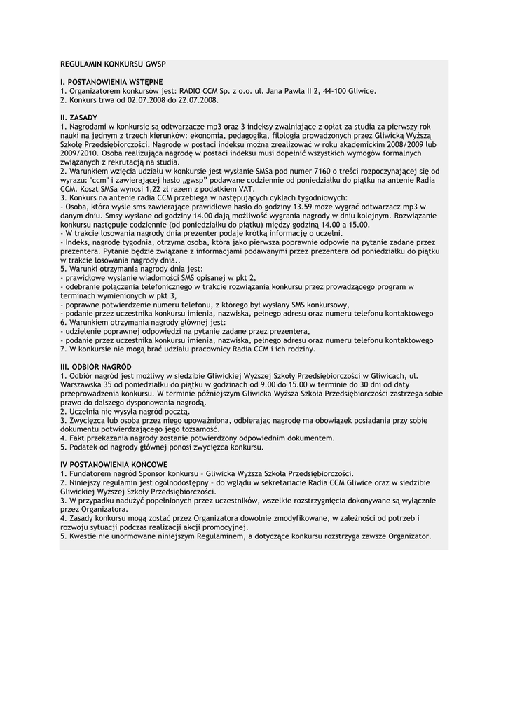 REGULAMIN KONKURSU GWSP I. POSTANOWIENIA WSTĘPNE 1. Organizatorem konkursów jest: RADIO CCM Sp. z o.o. ul. Jana Pawła II 2, 44-100 Gliwice. 2. Konkurs trwa od 02.07.2008 do 22.07.2008. II. ZASADY 1. Nagrodami w konkursie są odtwarzacze mp3 oraz 3 indeksy zwalniające z opłat za studia za pierwszy rok nauki na jednym z trzech kierunków: ekonomia, pedagogika, filologia prowadzonych przez Gliwicką Wyższą Szkołę Przedsiębiorczości. Nagrodę w postaci indeksu można zrealizować w roku akademickim 2008/2009 lub 2009/2010. Osoba realizująca nagrodę w postaci indeksu musi dopełnić wszystkich wymogów formalnych związanych z rekrutacją na studia. 2. Warunkiem wzięcia udziału w konkursie jest wysłanie SMSa pod numer 7160 o treści rozpoczynającej się od wyrazu: "ccm" i zawierającej hasło „gwsp” podawane codziennie od poniedziałku do piątku na antenie Radia CCM. Koszt SMSa wynosi 1,22 zł razem z podatkiem VAT. 3. Konkurs na antenie radia CCM przebiega w następujących cyklach tygodniowych: - Osoba, która wyśle sms zawierające prawidłowe hasło do godziny 13.59 może wygrać odtwarzacz mp3 w danym dniu. Smsy wysłane od godziny 14.00 dają możliwość wygrania nagrody w dniu kolejnym. Rozwiązanie konkursu następuje codziennie (od poniedziałku do piątku) między godziną 14.00 a 15.00. - W trakcie losowania nagrody dnia prezenter podaje krótką informację o uczelni. - Indeks, nagrodę tygodnia, otrzyma osoba, która jako pierwsza poprawnie odpowie na pytanie zadane przez prezentera. Pytanie będzie związane z informacjami podawanymi przez prezentera od poniedziałku do piątku w trakcie losowania nagrody dnia.. 5. Warunki otrzymania nagrody dnia jest: - prawidłowe wysłanie wiadomości SMS opisanej w pkt 2, - odebranie połączenia telefonicznego w trakcie rozwiązania konkursu przez prowadzącego program w terminach wymienionych w pkt 3, - poprawne potwierdzenie numeru telefonu, z którego był wysłany SMS konkursowy, - podanie przez uczestnika konkursu imienia, nazwiska, pełnego adresu oraz numeru telefonu kontaktowego 6. Warunkiem otrzymania nagrody głównej jest: - udzielenie poprawnej odpowiedzi na pytanie zadane przez prezentera, - podanie przez uczestnika konkursu imienia, nazwiska, pełnego adresu oraz numeru telefonu kontaktowego 7. W konkursie nie mogą brać udziału pracownicy Radia CCM i ich rodziny. III. ODBIÓR NAGRÓD 1. Odbiór nagród jest możliwy w siedzibie Gliwickiej Wyższej Szkoły Przedsiębiorczości w Gliwicach, ul. Warszawska 35 od poniedziałku do piątku w godzinach od 9.00 do 15.00 w terminie do 30 dni od daty przeprowadzenia konkursu. W terminie późniejszym Gliwicka Wyższa Szkoła Przedsiębiorczości zastrzega sobie prawo do dalszego dysponowania nagrodą. 2. Uczelnia nie wysyła nagród pocztą. 3. Zwycięzca lub osoba przez niego upoważniona, odbierając nagrodę ma obowiązek posiadania przy sobie dokumentu potwierdzającego jego tożsamość. 4. Fakt przekazania nagrody zostanie potwierdzony odpowiednim dokumentem. 5. Podatek od nagrody głównej ponosi zwycięzca konkursu. IV POSTANOWIENIA KOŃCOWE 1. Fundatorem nagród Sponsor konkursu – Gliwicka Wyższa Szkoła Przedsiębiorczości. 2. Niniejszy regulamin jest ogólnodostępny – do wglądu w sekretariacie Radia CCM Gliwice oraz w siedzibie Gliwickiej Wyższej Szkoły Przedsiębiorczości. 3. W przypadku nadużyć popełnionych przez uczestników, wszelkie rozstrzygnięcia dokonywane są wyłącznie przez Organizatora. 4. Zasady konkursu mogą zostać przez Organizatora dowolnie zmodyfikowane, w zależności od potrzeb i rozwoju sytuacji podczas realizacji akcji promocyjnej. 5. Kwestie nie unormowane niniejszym Regulaminem, a dotyczące konkursu rozstrzyga zawsze Organizator.