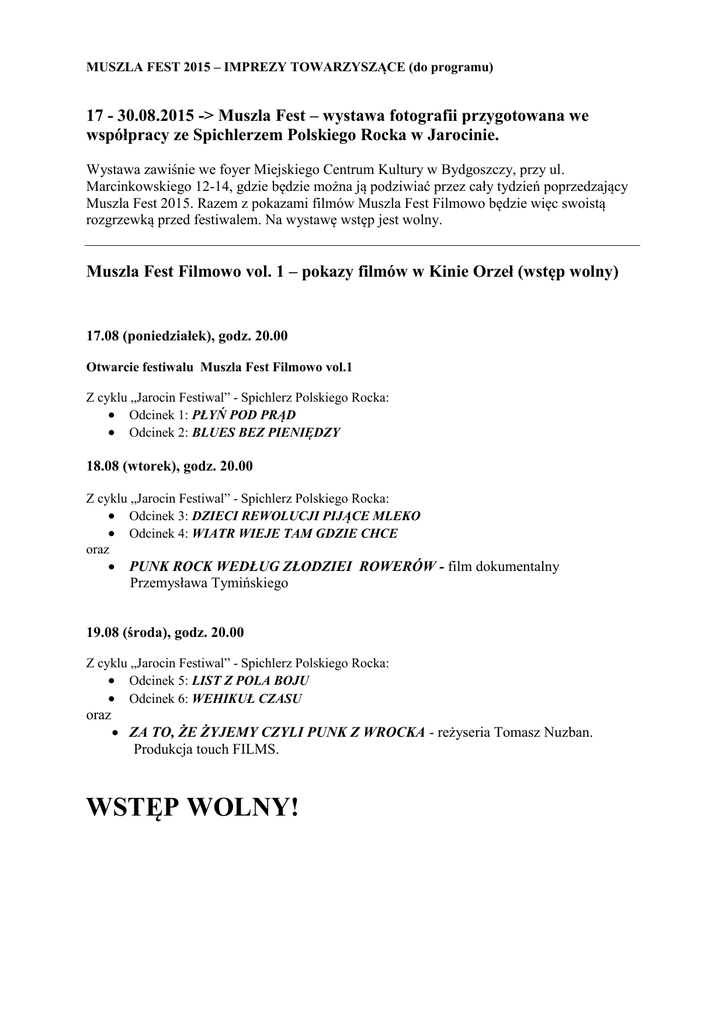 MUSZLA FEST 2015 – IMPREZY TOWARZYSZĄCE (do programu) 17 - 30.08.2015 -> Muszla Fest – wystawa fotografii przygotowana we współpracy ze Spichlerzem Polskiego Rocka w Jarocinie. Wystawa zawiśnie we foyer Miejskiego Centrum Kultury w Bydgoszczy, przy ul. Marcinkowskiego 12-14, gdzie będzie można ją podziwiać przez cały tydzień poprzedzający Muszla Fest 2015. Razem z pokazami filmów Muszla Fest Filmowo będzie więc swoistą rozgrzewką przed festiwalem. Na wystawę wstęp jest wolny. Muszla Fest Filmowo vol. 1 – pokazy filmów w Kinie Orzeł (wstęp wolny) 17.08 (poniedziałek), godz. 20.00 Otwarcie festiwalu Muszla Fest Filmowo vol.1 Z cyklu „Jarocin Festiwal” - Spichlerz Polskiego Rocka: Odcinek 1: PŁYŃ POD PRĄD Odcinek 2: BLUES BEZ PIENIĘDZY 18.08 (wtorek), godz. 20.00 Z cyklu „Jarocin Festiwal” - Spichlerz Polskiego Rocka: Odcinek 3: DZIECI REWOLUCJI PIJĄCE MLEKO Odcinek 4: WIATR WIEJE TAM GDZIE CHCE oraz PUNK ROCK WEDŁUG ZŁODZIEI ROWERÓW - film dokumentalny Przemysława Tymińskiego 19.08 (środa), godz. 20.00 Z cyklu „Jarocin Festiwal” - Spichlerz Polskiego Rocka: Odcinek 5: LIST Z POLA BOJU Odcinek 6: WEHIKUŁ CZASU oraz ZA TO, ŻE ŻYJEMY CZYLI PUNK Z WROCKA - reżyseria Tomasz Nuzban. Produkcja touch FILMS. WSTĘP WOLNY!