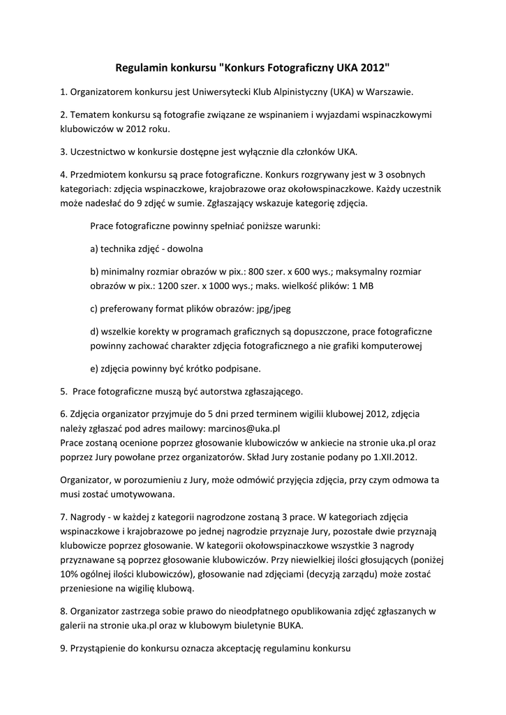 Regulamin konkursu "Konkurs Fotograficzny UKA 2012" 1. Organizatorem konkursu jest Uniwersytecki Klub Alpinistyczny (UKA) w Warszawie. 2. Tematem konkursu są fotografie związane ze wspinaniem i wyjazdami wspinaczkowymi klubowiczów w 2012 roku. 3. Uczestnictwo w konkursie dostępne jest wyłącznie dla członków UKA. 4. Przedmiotem konkursu są prace fotograficzne. Konkurs rozgrywany jest w 3 osobnych kategoriach: zdjęcia wspinaczkowe, krajobrazowe oraz okołowspinaczkowe. Każdy uczestnik może nadesład do 9 zdjęd w sumie. Zgłaszający wskazuje kategorię zdjęcia. Prace fotograficzne powinny spełniad poniższe warunki: a) technika zdjęd - dowolna b) minimalny rozmiar obrazów w pix.: 800 szer. x 600 wys.; maksymalny rozmiar obrazów w pix.: 1200 szer. x 1000 wys.; maks. wielkośd plików: 1 MB c) preferowany format plików obrazów: jpg/jpeg d) wszelkie korekty w programach graficznych są dopuszczone, prace fotograficzne powinny zachowad charakter zdjęcia fotograficznego a nie grafiki komputerowej e) zdjęcia powinny byd krótko podpisane. 5. Prace fotograficzne muszą byd autorstwa zgłaszającego. 6. Zdjęcia organizator przyjmuje do 5 dni przed terminem wigilii klubowej 2012, zdjęcia należy zgłaszad pod adres mailowy: [email protected] Prace zostaną ocenione poprzez głosowanie klubowiczów w ankiecie na stronie uka.pl oraz poprzez Jury powołane przez organizatorów. Skład Jury zostanie podany po 1.XII.2012. Organizator, w porozumieniu z Jury, może odmówid przyjęcia zdjęcia, przy czym odmowa ta musi zostad umotywowana. 7. Nagrody - w każdej z kategorii nagrodzone zostaną 3 prace. W kategoriach zdjęcia wspinaczkowe i krajobrazowe po jednej nagrodzie przyznaje Jury, pozostałe dwie przyznają klubowicze poprzez głosowanie. W kategorii okołowspinaczkowe wszystkie 3 nagrody przyznawane są poprzez głosowanie klubowiczów. Przy niewielkiej ilości głosujących (poniżej 10% ogólnej ilości klubowiczów), głosowanie nad zdjęciami (decyzją zarządu) może zostad przeniesione na wigilię klubową. 8. Organizator zastrzega sobie prawo do nieodpłatnego opublikowania zdjęd zgłaszanych w galerii na stronie uka.pl oraz w klubowym biuletynie BUKA. 9. Przystąpienie do konkursu oznacza akceptację regulaminu konkursu