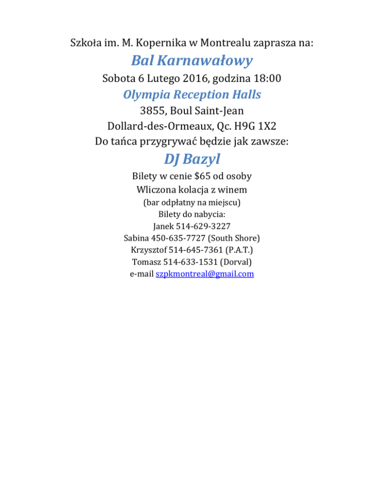 Szkoła im. M. Kopernika w Montrealu zaprasza na: Bal Karnawałowy Sobota 6 Lutego 2016, godzina 18:00 Olympia Reception Halls 3855, Boul Saint-Jean Dollard-des-Ormeaux, Qc. H9G 1X2 Do tańca przygrywać będzie jak zawsze: DJ Bazyl Bilety w cenie $65 od osoby Wliczona kolacja z winem (bar odpłatny na miejscu) Bilety do nabycia: Janek 514-629-3227 Sabina 450-635-7727 (South Shore) Krzysztof 514-645-7361 (P.A.T.) Tomasz 514-633-1531 (Dorval) e-mail [email protected]