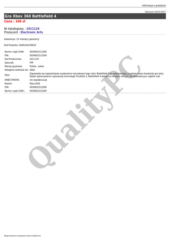 Informacje o produkcie Utworzono 08-03-2017 Gra Xbox 360 Battlefield 4 Cena : 106 zł Nr katalogowy : 1011124 Producent : Electronic Arts Gwarancja: 12 miesięcy gwarancji Numer części EAN: 5030932112200 P/N: 5030932112200 Kod Producenta: 1011124 Gatunek: FPP Wersja językowa: Polska - pełna Kategoria wiekowa od:: 18lat C Kod Produktu: GIAELSGX30032 Zapowiada się najważniejsze wydarzenie rozrywkowe tego roku! Battlefield 4 to ustanawiająca zupełnie nowe standardy gra akcji. Dzięki wykorzystaniu najnowszej technologii Frostbite 3, Battlefield 4 dostarcza wrażeń, których nie doświadczysz nigdzie indz KINECT/MOVE: nie współpracuje Nośnik: Płyta DVD P/N:: 5030932112200 Numer części EAN:: 5030932112200 Q ua lit yP Opis: Wygenerowano w programie www.oscGold.com