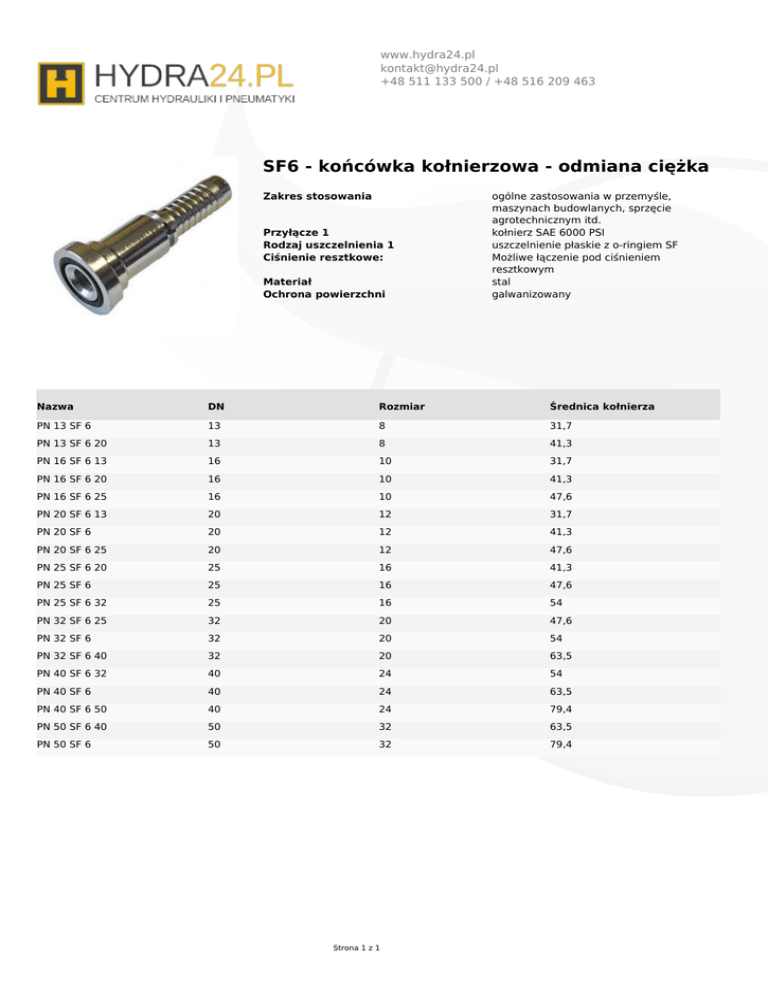 www.hydra24.pl [email protected] +48 511 133 500 / +48 516 209 463 SF6 - końcówka kołnierzowa - odmiana ciężka Zakres stosowania Przyłącze 1 Rodzaj uszczelnienia 1 Ciśnienie resztkowe: Materiał Ochrona powierzchni ogólne zastosowania w przemyśle, maszynach budowlanych, sprzęcie agrotechnicznym itd. kołnierz SAE 6000 PSI uszczelnienie płaskie z o-ringiem SF Możliwe łączenie pod ciśnieniem resztkowym stal galwanizowany Nazwa DN Rozmiar Średnica kołnierza PN 13 SF 6 13 8 31,7 PN 13 SF 6 20 13 8 41,3 PN 16 SF 6 13 16 10 31,7 PN 16 SF 6 20 16 10 41,3 PN 16 SF 6 25 16 10 47,6 PN 20 SF 6 13 20 12 31,7 PN 20 SF 6 20 12 41,3 PN 20 SF 6 25 20 12 47,6 PN 25 SF 6 20 25 16 41,3 PN 25 SF 6 25 16 47,6 PN 25 SF 6 32 25 16 54 PN 32 SF 6 25 32 20 47,6 PN 32 SF 6 32 20 54 PN 32 SF 6 40 32 20 63,5 PN 40 SF 6 32 40 24 54 PN 40 SF 6 40 24 63,5 PN 40 SF 6 50 40 24 79,4 PN 50 SF 6 40 50 32 63,5 PN 50 SF 6 50 32 79,4 Strona 1 z 1