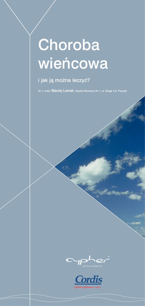 Choroba wieƒcowa i jak jà mo˝na leczyç? Dr n. med. Maciej Lesiak, Szpital Kliniczny Nr 1, ul. D∏uga 1/2, Poznaƒ Choroba wieƒcowa. Jej przyczyny i skutki. Choroba wieƒcowa stanowi, bez wàtpienia, najwi´kszy problem zdrowotny wÊród doros∏ych osób w naszym spo∏eczeƒstwie. Jej bezpoÊrednià przyczynà sà zw´˝enia w naczyniach, które od˝ywiajà serce, czyli t´tnicach wieƒcowych. Do powstania tych zw´˝eƒ prowadzi wieloletni proces mia˝d˝ycowy, polegajàcy na powstawaniu i powolnym narastaniu tzw. blaszek mia˝d˝ycowych, zmniejszajàcych Êwiat∏o t´tnicy. Zw´˝one miejsce stanowi swoiste utrudnienie dla przep∏ywu krwi, szczególnie wtedy, gdy potrzeby serca rosnà (wysi∏ek, stres i inne). Na skutek niedostatecznego dop∏ywu ˝yciodajnej krwi fragment serca ulega niedokrwieniu, co objawia si´ rozlanym bólem w klatce piersiowej. Im bardziej zw´˝one naczynie, tym mniejszy wysi∏ek prowadzi do niedokrwienia i cz´Êciej dochodzi do bólu. Niezwykle groênà cechà blaszki mia˝d˝ycowej jest jej podatnoÊç na p´kanie. Gdy do tego dojdzie to w uszkodzonym miejscu szybko tworzy si´ zakrzep, który z jednej strony goi uraz, ale z drugiej cz´sto prowadzi do ca∏kowitego zamkni´cia chorego naczynia. Krew przestaje wtedy p∏ynàç. Taka sytuacja prawie zawsze prowadzi do martwicy niedokrwionej cz´Êci serca, zwanej zawa∏em. Nie znamy dziÊ bezpoÊrednich przyczyn wystàpienia choroby wieƒcowej. Wiemy jednak, ˝e pewne osoby sà bardziej podatne od innych ze wzgl´dów genetycznych (choroba wyst´powa∏a, bàdê wyst´puje u osób z nimi spokrewnionych). Do innych czynników ryzyka nale˝à mi´dzy innymi palenie papierosów, dieta bogata w t∏uszcze nasycone (zwierz´ce), nadwaga, brak ruchu (tzw. siedzàcy tryb ˝ycia) oraz takie choroby jak nadciÊnienie i cukrzyca. M´˝czyêni chorujà cz´Êciej od kobiet i w m∏odszym wieku. Jak wykryç chorob´ wieƒcowà? Podstawowym objawem jest rozlany ból zamostkowy, cz´sto promieniujàcy do gard∏a i ramion. Ból najcz´Êciej pojawia si´ w trakcie wykonywania wysi∏ku i ust´puje szybko po jego zaprzestaniu. Znanych jest wiele testów pomagajàcych w rozpoznaniu choroby, np. próba wysi∏kowa polegajàca na ciàg∏ym zapisie ekg w trakcie wysi∏ku wykonywanego przez pacjenta. Niewàtpliwie najlepszà metodà postawienia ostatecznej diagnozy jest koronarografia. Daje ona odpowiedê nie tylko na pytanie czy sà zmiany w naczyniach serca, ale tak˝e w ilu, w których oraz jak ciasne sà zw´˝enia. Koronarografia jest badaniem inwazyjnym, wymagajàcym odpowiedniego przygotowania pacjenta. Wykonuje jà doÊwiadczony lekarz, a polega na wprowadzeniu do naczyƒ wieƒcowych (osobno do lewej i prawej t´tnicy) tzw. cewników, przez które wstrzykiwany jest Êrodek cieniujàcy, czyli kontrast. Aby tego zaopatrzony jest w zastawk´ uniemo˝liwiajàcà cofanie si´ krwi, dokonaç potrzebne jest wczeÊniejsze nak∏ucie którejÊ z t´tnic aby jej utrata by∏a minimalna. Przez koszulk´ wprowadzany jest obwodowych, najcz´Êciej t´tnicy udowej w pachwinie. tzw. cewnik prowadzàcy, którego koƒcówk´ umieszcza si´ Znieczulenie miejscowe pachwiny zupe∏nie wystarczy aby badanie w ujÊciu w∏aÊciwej t´tnicy wieƒcowej. Nast´pnie, przez ten cewnik by∏o niebolesne. Wstrzykni´ty kontrast wype∏nia Êwiat∏o t´tnic wprowadza si´ cienki drucik do chorego naczynia, tak aby jego wieƒcowych uwidaczniajàc, w promieniach rentgenowskich ich koniec znalaz∏ si´ poza zw´˝eniem. Drucik ten stanowi prowad- przebieg i pokazujàc lokalizacj´ oraz nasilenie ewentualnych nic´, po której wsuwa si´ w∏aÊciwy cewnik zakoƒczony zw´˝eƒ. Zapisany ruchomy film stanowi dokument, na podstawie balonikiem. Balonik umieszcza si´ w miejscu zw´˝enia i wype∏nia którego lekarz dokona wyboru najlepszej metody leczenia. Samo na kilkadziesiàt sekund rozcieƒczonym kontrastem pod ciÊnieniem badanie trwa zazwyczaj kilkanaÊcie minut. BezpoÊrednio po nim kilku, kilkunastu atmosfer. Balon otwiera si´ i zgniata blaszk´ chory pozostaje przez kilka, kilkanaÊcie godzin w pozycji le˝àcej mia˝d˝ycowà. Blaszka ulega rozp∏aszczeniu, a naczynie poszerza z unieruchomionà koƒczynà, w której dokonano nak∏ucia si´, uzyskujàc wi´ksze Êwiat∏o. Po zabiegu pozostaje tylko i opuszcza szpital nast´pnego dnia. niewielkie zw´˝enie nie przekraczajàce zwykle 30%. Jak mo˝na leczyç chorob´ wieƒcowà? Co to sà stenty? Nie ma obecnie leków, które powodowa∏yby cofni´cie si´ Poniewa˝ Êciana naczynia wieƒcowego, oraz sama blaszka niekorzystnych zmian w t´tnicach wieƒcowych. JeÊli ju˝ dojdzie mia˝d˝ycowa posiada wiele elementów elastycznych to w krótkim do istotnych zw´˝eƒ to ˝adne „tabletki” ich nie usunà. Wi´kszoÊç czasie po zabiegu angioplastyki mo˝e dojÊç do tzw. „spr´˝ystego Êrodków dzia∏a bardziej na objawy choroby ni˝ na jej przyczyn´. odbicia” i ponownego nasilenia zw´˝enia. Jest to jedna z wa˝nych Znane sà natomiast leki, które skutecznie hamujà jej post´p przyczyn nawrotu zw´˝enia czyli restenozy. Aby temu zapobiec i zmniejszajà ryzyko nag∏ego pogorszenia. Sà to przede wszystkim wi´kszoÊç zabiegów koƒczy si´ obecnie implantacjà stentu. leki obni˝ajàce poziom cholesterolu we krwi, a wÊród nich Przypomina on ma∏à stalowà spr´˝ynk´ i po wszczepieniu tworzy najwa˝niejsze to statyny. Bardzo wa˝ne jest przy tym zaprzestanie sztywne rusztowanie przeciwstawiajàce si´ elastycznym si∏om palenia, pozbycie si´ nadwagi, odpowiednia dieta oraz sumienne powodujàcym zapadanie si´ naczynia. Raz wszczepiony pozostaje leczenie chorób wspó∏istniejàcych. Wspó∏czesna medycyna ma w naczyniu na zawsze. Jego si∏a skutecznie przeciwstawia si´ jednak skuteczne sposoby walki z tà chorobà. Jednym z nich jest spr´˝ystoÊci naczynia wieƒcowego wi´c nie musimy si´ obawiaç, angioplastyka wieƒcowa, wykonywana bez otwierania kl