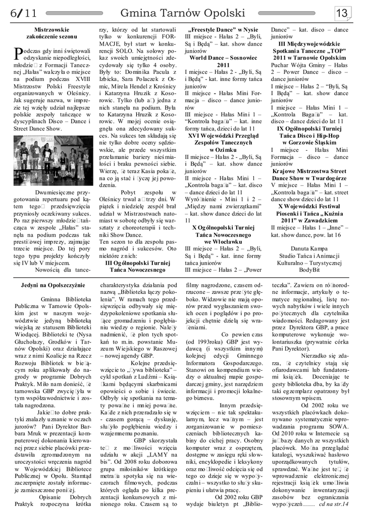 6 11 Mistrzowskie zakończenie sezonu P odczas gdy inni świętowali odzyskanie niepodległości, młodzież z Formacji Tanecznej „Hałas” walczy ła o miejsce na podium podczas XVIII Mistrzostw Polski Freestyle organizowanych w Oleśnicy. Jak sugeruje nazwa, w imp rezie tej wzięły udział najlepsze polskie zespoły tańczące w dyscyplinach Disco – Dance i Street Dance Show. Dwu miesięczne przygotowania repertuaru pod kątem tegoż przedsięwzięcia przyniosły oczekiwany sukces. Po raz pierwszy młodzież tańcząca w zespole „Hałas” stanęła na podium podczas tak prestiżowej imp rezy, zajmu jąc trzecie miejsce. Do tej pory tego typu projekty kończyły się IV lub V miejscem. Nowością dla tanceJedyni na Opolszczyźnie Gminna Biblioteka Publiczna w Tarnowie Opolskim jest w naszym wo jewództwie jedyną biblioteką wiejską ze statusem Bib lioteki Wiodącej. Biblioteki te (Nysa Głuchołazy, Grodkó w i Tarnów Opolski) oraz działające wraz z nimi Koalicje na Rzecz Rozwoju Bibliotek w b ieżącym roku ap likowały do nagrody w programie Dobrych Praktyk. M iło nam donieść, że tarnowska GBP zwyciężyła w tym współzawodnictwie i została nagrodzona. Jakież to dobre praktyki znalazły u znanie w oczach jurorów? Pan i Dyrektor Barbara Mruk w prezentacji ko mputerowej dokonania kiero wanej przez siebie placówki przedstawiła zgro mad zonym na uroczystości wręczenia nagród w Wojewódzkiej Bibliotece Publicznej w Opolu. Stamtąd zaczerpnięte zostały informacje zamieszczone poniżej. Opisanie Dobrych Praktyk ro zpoczyna krótka Gmina Tarnow Opolski 13 rzy, którzy od lat startowali tylko w konkurencji FORMACJE, był start w konkurencji SOLO. Na solowy pokaz swoich umiejętności zdecydowały się tylko 4 osoby. Były to: Do min ika Pacula z Izb icka, Sara Po laczek z Otmic, M irela Hendel z Krośnicy i Katarzyna Hru zik z Kosorowic. Tylko (lub aż) jedna z nich stanęła na podium. Była to Katarzyna Hruzik z Kosorowic. W mo jej ocenie osiągnęła ona zdecydowany sukces. Na sukces ten składają się nie tylko dobre oceny sędziowskie, ale przede wszystkim przełamanie bariery nieś miałości i braku pewności siebie. Wierzę, że teraz Kasia pokaże, na co ją stać i życzę jej powodzenia. Pobyt zespołu w Oleśnicy trwał aż trzy dni. W piątek i n iedzielę zespół brał udział w Mistrzostwach natomiast w sobotę odbyły się warsztaty z choreoterapii i techniki Show Dance. Ten sezon to dla zespołu pasmo nagród i sukcesów. Oto niektóre z n ich: III Og ólnopolski Turniej Tańca Nowoczesnego „Freestyle Dance” w Nysie III miejsce - Hałas 2 – „Byli, Są i Będą” – kat. show dance juniorów Worl d Dance – Sosnowiec 2011 I miejsce – Hałas 2 - „By li, Są i Będą” - kat. inne formy tańca juniorów II miejsce - Hałas Mini Formacja – disco – dance juniorów III miejsce - Hałas Min i 1 – “Kontrola bagażu” – kat. inne formy tańca, dzieci do lat 11 XVI Wojewódzki Przegląd Zespołów Tanecznych w Ozi mku II miejsce – Hałas 2 - „Byli, Są i Będą” – kat. show dance juniorów II miejsce - Hałas Mini 1 – „Kontrola bagażu” – kat. disco – dance dzieci do lat 11 Wyróżnienie - M ini 1 i 2 – „Międ zy nami zwierzątkami” – kat. show dance dzieci do lat 11 X Og ólnopolski Turniej Tańca Nowoczesnego we Wł ocławku III miejsce – Hałas 2 – „Byli, Są i Będą” - kat. inne formy tańca juniorów III miejsce – Hałas 2 – „Power Dance” – kat. disco – dance juniorów III Międzywojewódzkie Spotkani a Taneczne „TOP” 2011 w Tarnowie Opolskim Puchar Wójta Gminy – Hałas 2 – Po wer Dance – disco – dance juniorów I miejsce – Hałas 2 – “Byli, Są I Będą” – kat. show dance juniorów I miejsce – Hałas Mini 1 – „Kontrola Bagażu” – kat. disco – dance dzieci do lat 11 IX Ogólnopolski Turniej Tańca Disco i Hi p-Hop w Gorzowie Śląskim I miejsce - Hałas Mini Formacja – disco – dance juniorów Krajowe Mistrzostwa Street Dance Show w Twardog órze V miejsce – Hałas Mini 1 – „Kontrola bagażu” – kat. street dance show dzieci do lat 11 X Wojewódzki Festiwal Piosenki i Tańca „ Kuźni a 2011” w Zawadzkiem II miejsce – Hałas 1 – „Inne” – kat. show dance, pow. lat 16 charakterystyka działania pod nazwą „Biblioteka łączy pokolenia”. W ramach tego przedsięwzięcia odbywały się międzypokoleniowe spotkania służące gromad zeniu i pogłębianiu wied zy o regionie. Należy nadmien ić, że plon tych spotkań to m.in. powstanie Muzeu m Wiejskiego w Raszowej – nowej agendy GBP. Ko lejne przedsięwzięcie to „Żywa biblioteka” – cykl spotkań z Lud źmi – Książkami będącymi skarbnicami opowieści o sobie i świecie. Odbyły się spotkania na tematy poważne i mn iej poważne. Każde z nich p rzeradzało się w - czasem gorącą – dyskusję, służyło pogłębieniu wied zy i wzajemnemu po znaniu. GBP skorzystała też z mo żliwości wzięcia udziału w akcji „LAM Y na bis”. Od 2008 ro ku doborowa grupa miłośnikó w krótkiego metrażu spotyka się na wieczorach filmo wych, podczas których ogląda po kilka prezentacji konkursowych z minionego roku. Czasem są to filmy nagrodzone, czasem odrzucone – zawsze przeżyte głęboko. Widzowie nie mają oporów przed wygłaszaniem swoich ocen i poglądów i po projekcji chętnie dzielą się wrażeniami. Co pewien czas (od 1993roku) GBP jest wydawcą (i wszystkim inny m) kolejnej edycji Gminnego Informatora Gospodarczego. Stanowi on ko mpendiu m wiedzy o aktualnej mapie gospodarczej gminy, jest narzędziem informacji i pro mocji lokalnego biznesu. Innym przedsięwzięciem – n ie tak spektakularny m, lecz ważny m – jest zorganizowan ie w po mieszczeniach bib liotecznych kabiny do cichej pracy. Osobny ko mputer wraz z osprzętem, dostępne w zasięgu ręki sło wniki, encyklopedie i leksykony oraz mo żliwość odcięcia się od tego co dzieje si