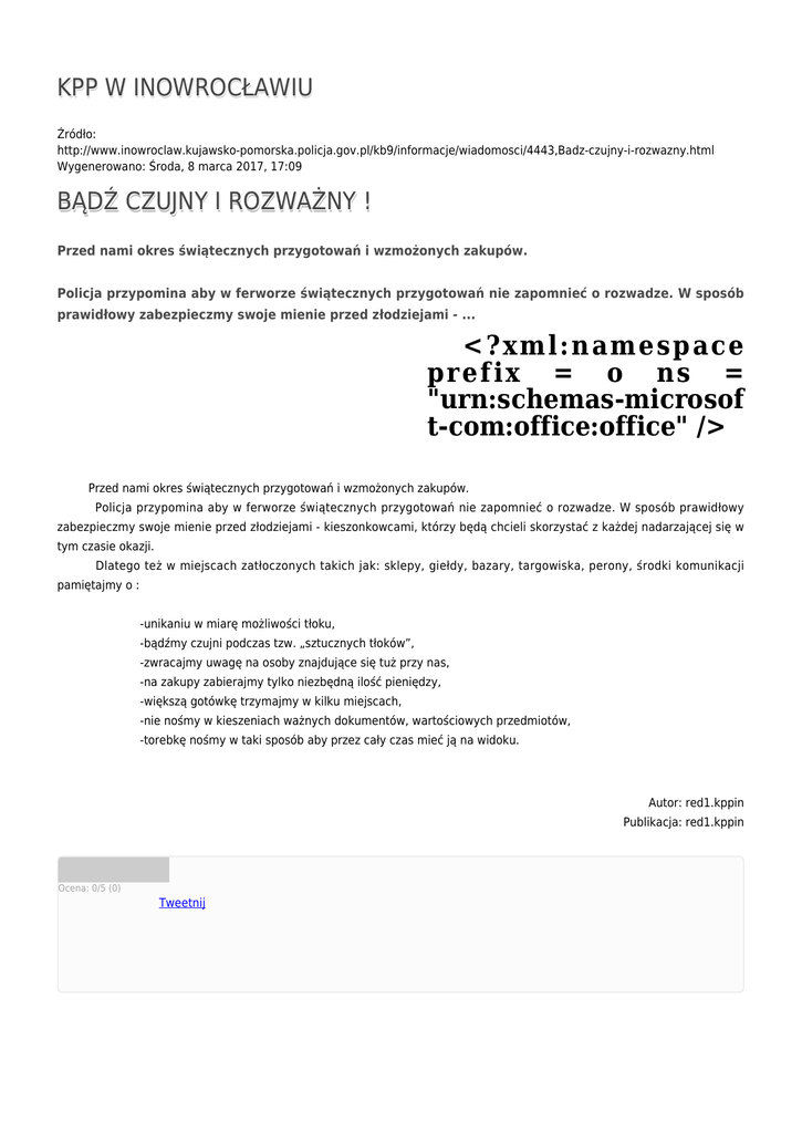 KPP W INOWROCŁAWIU Źródło: http://www.inowroclaw.kujawsko-pomorska.policja.gov.pl/kb9/informacje/wiadomosci/4443,Badz-czujny-i-rozwazny.html Wygenerowano: Środa, 8 marca 2017, 17:09 BĄDŹ CZUJNY I ROZWAŻNY ! Przed nami okres świątecznych przygotowań i wzmożonych zakupów. Policja przypomina aby w ferworze świątecznych przygotowań nie zapomnieć o rozwadze. W sposób prawidłowy zabezpieczmy swoje mienie przed złodziejami - ... <?xml:namespace prefix = o ns = "urn:schemas-microsof t-com:office:office" /> Przed nami okres świątecznych przygotowań i wzmożonych zakupów. Policja przypomina aby w ferworze świątecznych przygotowań nie zapomnieć o rozwadze. W sposób prawidłowy zabezpieczmy swoje mienie przed złodziejami - kieszonkowcami, którzy będą chcieli skorzystać z każdej nadarzającej się w tym czasie okazji. Dlatego też w miejscach zatłoczonych takich jak: sklepy, giełdy, bazary, targowiska, perony, środki komunikacji pamiętajmy o : -unikaniu w miarę możliwości tłoku, -bądźmy czujni podczas tzw. „sztucznych tłoków”, -zwracajmy uwagę na osoby znajdujące się tuż przy nas, -na zakupy zabierajmy tylko niezbędną ilość pieniędzy, -większą gotówkę trzymajmy w kilku miejscach, -nie nośmy w kieszeniach ważnych dokumentów, wartościowych przedmiotów, -torebkę nośmy w taki sposób aby przez cały czas mieć ją na widoku. Autor: red1.kppin Publikacja: red1.kppin Ocena: 0/5 (0) Tweetnij