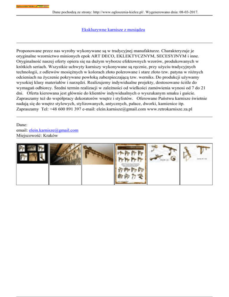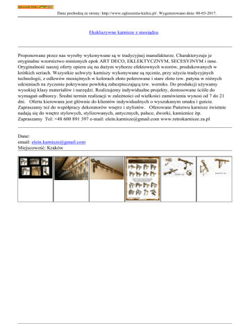 Dane pochodzą ze strony: http://www.ogloszenia-kielce.pl/. Wygenerowano dnia: 08-03-2017. Ekskluzywne karnisze z mosiądzu Proponowane przez nas wyroby wykonywane są w tradycyjnej manufakturze. Charakteryzuje je oryginalne wzornictwo minionych epok ART DECO, EKLEKTYCZNYM, SECESYJNYM i inne. Oryginalność naszej oferty opiera się na dużym wyborze efektownych wzorów, produkowanych w krótkich seriach. Wszystkie uchwyty karniszy wykonywane są ręcznie, przy użyciu tradycyjnych technologii, z odlewów mosiężnych w kolorach złoto polerowane i stare złoto tzw. patyna w różnych odcieniach na życzenie pokrywane powłoką zabezpieczającą tzw. werniks. Do produkcji używamy wysokiej klasy materiałów i narzędzi. Realizujemy indywidualne projekty, dostosowane ściśle do wymagań odbiorcy. Średni termin realizacji w zależności od wielkości zamówienia wynosi od 7 do 21 dni. Oferta kierowana jest głównie do klientów indywidualnych o wyszukanym smaku i guście. Zapraszamy też do współpracy dekoratorów wnętrz i stylistów. Oferowane Państwu karnisze świetnie nadają się do wnętrz stylowych, stylizowanych, antycznych, pałace, dworki, kamienice itp. Zapraszamy Tel: +48 600 891 397 e-mail: [email protected] www.retrokarnisze.za.pl Dane: email: [email protected] Miejscowość: Kraków