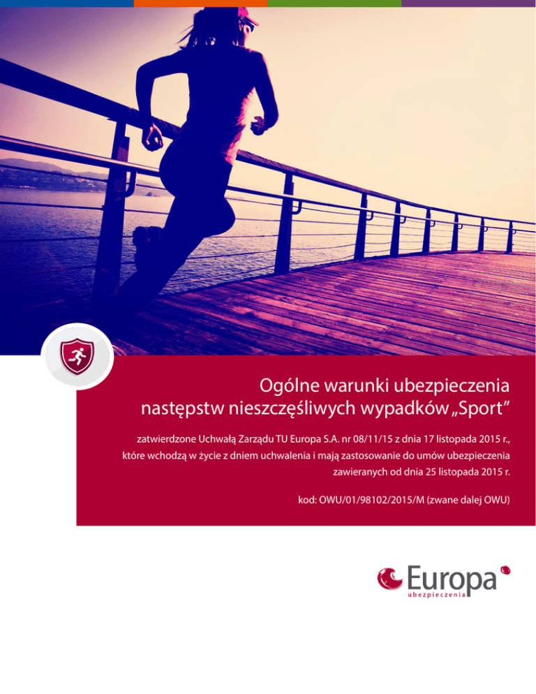 Ogólne warunki ubezpieczenia następstw nieszczęśliwych wypadków „Sport” zatwierdzone Uchwałą Zarządu TU Europa S.A. nr 08/11/15 z dnia 17 listopada 2015 r., które wchodzą w życie z dniem uchwalenia i mają zastosowanie do umów ubezpieczenia zawieranych od dnia 25 listopada 2015 r. kod: OWU/01/98102/2015/M (zwane dalej OWU) Informacja na podstawie Rozporządzenia Ministra Finansów w sprawie sposobu sporządzania informacji zamieszczanych we wzorcach umów. 1.Przesłanki wypłaty odszkodowania i innych świadczeń lub wartość wykupu ubezpieczenia opisane są w § 3 OWU oraz dodatkowo: w § 3 klauzuli nr 1; w § 3 klauzuli nr 2; w § 3 klauzuli nr 3; w § 4 klauzuli nr 4; w § 3 klauzuli nr 5; w § 2 klauzuli nr 6; w § 2 klauzuli nr 7; w § 3 klauzuli nr 8; w § 3 klauzuli nr 9; w § 3 klauzuli nr 10. 2.Ograniczenia oraz wyłączenia odpowiedzialności zakładu ubezpieczeń uprawniające do odmowy wypłaty odszkodowania i innych świadczeń lub ich obniżenia opisane są w § 10 OWU, oraz dodatkowo w § 3 ust. 6 – 10 klauzuli nr 1; w § 3 ust. 3 – 5 klauzuli nr 2; w § 3 ust. 6 i 7 klauzuli nr 3; w § 3 ust. 3 i 4 klauzuli nr 4; w § 3 ust. 4 i 5 klauzuli nr 5; w § 2 ust. 3 klauzuli nr 6; w § 2 ust. 2 klauzuli nr 7; w § 4 klauzuli nr 8; w § 4 klauzuli nr 9; w § 4 klauzuli nr 10. Spis treści I. Postanowienia wstępne 4 II. Definicje 4 III. Podmiot, przedmiot i zakres ubezpieczenia 5 IV. Umowa ubezpieczenia 5 V. Okres odpowiedzialności 6 VI. Składka 6 VII. Suma ubezpieczenia 7 VIII. Ustalenie wysokości świadczenia ubezpieczeniowego 7 IX. Wyłączenia i ograniczenia odpowiedzialności 8 X. Obowiązki ubezpieczającego i ubezpieczonego 9 XI. Postępowanie w przypadku zajścia zdarzenia ubezpieczeniowego 9 XII. Czynności podejmowane przez ubezpieczyciela w przypadku zgłoszenia roszczenia oraz zasady ustalania wysokości świadczenia ubezpieczeniowego 10 XIII. Regres ubezpieczeniowy 11 XIV. Postanowienia końcowe 12 Klauzule dodatkowe 13 Klauzula numer 1 13 Klauzula numer 2 15 Klauzula numer 3 17 Klauzula numer 4 17 Klauzula numer 5 19 Klauzula numer 6 20 Klauzula numer 7 21 Klauzula numer 8 21 Klauzula numer 9 25 Klauzula numer 10 27 Towarzystwo Ubezpieczeń Europa S.A. ul. Gwiaździsta 62 53-413 Wrocław [email protected] www.tueuropa.pl tel. 71 36 92 887, fax 71 36 92 707 Biuro Obsługi Klienta 801 500 300 (dla telefonów stacjonarnych) lub 71 36 92 887 (dla telefonów kom.) koszt połączenia zgodny z taryfą operatora TU Europa S.A. Sąd Rejonowy dla Wrocławia-Fabrycznej we Wrocławiu, KRS 0000002736, NIP 895-10-07-276, kapitał zakładowy zarejestrowany i opłacony 37 800 000 zł posiadająca zezwolenie Ministra Finansów nr DU/2849/A/CG/94 z dnia 7 listopada 1994 r. na prowadzenie działalności ubezpieczeniowej 3 I. Postanowienia wstępne §1 1. Na podstawie OWU, Towarzystwo Ubezpieczeń Europa S.A., zwane dalej ubezpieczycielem, zawiera umowy ubezpieczenia z osobami fizycznymi lub prawnymi, lub jednostkami organizacyjnymi nieposiadającymi osobowości prawnej, posiadającymi zdolność do czynności prawnych, zwanymi dalej ubezpieczającymi. 2. OWU mają zastosowanie do zawierania umów ubezpieczenia przy wykorzystaniu środków porozumiewania się na odległość oraz z zastosowaniem przepisów o świadczeniu usług drogą elektroniczną. 3. Różnicę pomiędzy treścią umowy ubezpieczenia a OWU ubezpieczyciel przedstawi ubezpieczającemu na piśmie przed zawarciem umowy ubezpieczenia. W przypadku niedopełnienia tego obowiązku ubezpieczyciel nie może powoływać się na różnicę niekorzystną dla ubezpieczającego. 4. Na wniosek ubezpieczającego, pod warunkiem zapłacenia dodatkowej składki zakres ubezpieczenia może zostać rozszerzony o ryzyka opisane w dodatkowych klauzulach. II. Definicje §2 Poniższe określenia w rozumieniu OWU mają następujące znaczenie: 1. amatorskie uprawianie sportu – uprawianie sportu, który nie został zakwalifikowany do grupy wyczynowego uprawia sportu i zawodowego uprawiania sportu oraz z wyłączeniem sportów ekstremalnych oraz sportów powietrznych, 2. wyczynowe uprawianie sportu – uprawianie dyscyplin sportowych w ramach sekcji lub klubów sportowych, polegające na regularnym uczestniczeniu w treningach, obozach sportowych, imprezach i zawodach sportowych, nie związane z otrzymywaniem wynagrodzenia lub innych gratyfikacji finansowych, 3. zawodowe uprawianie sportu – forma aktywności fizycznej, polegająca na uprawianiu dyscyplin sportowych przez osoby uprawnione na podstawie umowy o pracę lub umowy cywilnoprawnej do otrzymywania w związku z uprawianiem sportu wynagrodzenia w dowolnej formie, w tym także stypendium niezależnie od tego, czy sport jest uprawiany indywidualnie, czy w ramach gier zespołowych, 4. choroba – schorzenie powodujące zaburzenia w funkcjonowaniu układów lub narządów ciała ubezpieczonego, niezależne od woli ubezpieczonego, powstałe w wyniku patologii możliwej do zdiagnozowania przez lekarza, wymagające leczenia, diagnostyki lub rehabilitacji, 5. choroby przewlekłe – wszelkie choroby, które mają jedną lub więcej z następujących cech charakterystycznych: są trwałe, pozostawiają po sobie inwalidztwo, spowodowane są nieodwracalnymi zmianami patologicznymi, oraz wymagają specjalnego postępowania rehabilitacyjnego albo według wszelkich oczekiwań wymagać będą długiego okresu nadzoru, obserwacji czy opieki, 6. dzień roboczy – każdy dzień tygodnia od poniedziałku do piątku z wyłączeniem dni ustawowo wolnych od pracy przypadających w tych dniach, 7. dzień zapłaty składki – dzień uznania rachunku bankowego ubezpieczyciela pełną kwotą należnej składki, 8. nieszczęśliwy wypadek – nagłe i niezależne od woli ubezpieczonego zdarzenie, mające miejsce w okresie odpowiedzialności ubezpieczyciela, wywołane przyczyną zewnętrzną, niezależne od jakiejkolwiek choroby, będące bezpośrednią i wyłączną przyczyną zajścia z