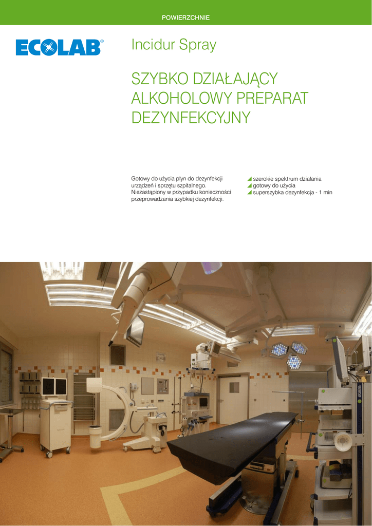POWIERZCHNIE Incidur Spray SZYBKO DZIAŁAJĄCY ALKOHOLOWY PREPARAT DEZYNFEKCYJNY Gotowy do użycia płyn do dezynfekcji urządzeń i sprzętu szpitalnego. Niezastąpiony w przypadku konieczności przeprowadzania szybkiej dezynfekcji. szerokie spektrum działania gotowy do użycia superszybka dezynfekcja - 1 min POWIERZCHNIE Właściwości Korzyści Wyniki badań mikrobiologicznych Szerokie spektrum działania obejmujące bakterie (włącznie z Tbc), grzyby i wirusy zgodnie z zaleceniem RKI (Instytut Roberta Kocha) Wysoka pewność dezynfekcji na wszystkich powierzchniach odpornych na działania alkoholi, również w obszarach podwyższonego ryzyka np. dzięki wysokiej aktywności w stosunku do wirusów HBV, HCV, HIV, Vaccinia, Adeno Optymalnie dobrany skład wykorzystujący synergistyczne działanie poszczególnych substancji czynnych Dobre pokrycie dezynfekowanej powierzchni, szybkie wysychanie bez pozostałości Gotowy do użycia Łatwe stosowanie, możliwość natychmiastowego użycia Niezwykle krótki czas działania Szybko zapewnia bezpieczeństwo pacjentom i personelowi medycznemu Certyfikat DGHM (Niemieckie Towarzystwo Higieny i Mikrobiologii) Najlepsze z możliwych zabezpieczenie użytkownika Przeprowadzone na szeroką skalę badania tolerancji materiałowej Możliwość zastosowania do: metali, tworzyw sztucznych oraz odpornych na działanie alkoholi powierzchni lakierowanych w pomieszczeniach zabiegowych OBSZAR ZASTOSOWAŃ Szybko działający preparat dezynfekcyjny do sprzętu medycznego (foteli zabiegowych, stomatologicznych, łóżek), aparatury medycznej a także szyb, pulpitów, parapetów, blatów, desek klozetowych, klamek, miejsc trudno dostępnych, szczelin i wszelkich małych powierzchni odpornych na działanie alkoholi. SPOSÓB POSTĘPOWANIA Roztwór gotowy do użycia do przecierania lub spryskiwania. Preparat nanieść na suchą ściereczkę, przetrzeć dezynfekowaną powierzchnię i pozostawić do wyschnięcia lub z odległości 30 cm spryskać powierzchnię (ok. 40 ml na m2) i pozostawić do wyschnięcia. W przypadku dezynfekcji urządzeń elektrycznych sprawdzić zawsze odłączenie aparatu od sieci. SKŁAD W 100 g jako substancje aktywne zawiera: 40,0 g etanol (96%), 10,0 g n-propanol, 0,05 g chlorek bezyloalkiloamonowy; 0,018 g aldehyd glutarowy, Opakowania Jednostkowe Handlowe Symbol Butelka 650 ml ze spryskiwaczem 12 x 650 ml 3013450 Butelka 1 l ze spryskiwaczem 12 x 1 l 3013460 Kanister 5 l 2x5l 3013470 OPINIE Liczne badania mikrobiologiczne, wirusologiczne, toksykologiczne i ekologiczne. Na Państwa prośbę chętnie udostępnimy opinie. 0297 Wyłącznie do zastosowania profesjonalnego. Ecolab Healthcare Europe Clean. Safe. Healthy. Ecolab Europe GmbH Richtistr. 7 CH-8304 Wallisellen © NOVEMBER 2009 Ecolab Inc. All rights reserved. Ecolab Sp. z o.o. ul. Kalwaryjska 69, 30-504 Kraków www.ecolab.pl Spektrum działania (nierozcieńczony preparat) Czas działania Dezynfekcja powierzchni wg. VAH (Stowarzyszenie Higieny Stosowanej) z udziałem, jak i bez udziału czynnika mechanicznego (bakteriobójczy, drożdżobójczy) (warunki czyste i brudne) 5 min Szybka dezynfekcja z udziałem czynnika mechanicznego wg. DGHM (Niemieckie Towarzystwo Higieny i Mikrobiologii), metodyka 2001r. (warunki czyste i brudne) 1 min Szybka dezynfekcja bez udziału czynnika mechanicznego wg. DGHM (Niemieckie Towarzystwo Higieny i Mikrobiologii), metodyka 2001r. (warunki czyste) 1 min Działanie wirusobójcze wobec wszystkich wirusów osłonionych (łącznie z HBV, HCV, HIV) - zgodnie z zaleceniem 01/2004 RKI (Instytut Roberta Kocha) 30 sek Adeno, Papova 15 min Wirusobójczy zgodnie z zaleceniem RKI (Instytut Roberta Kocha) 01/2004 2 godz. Parametry działania według metodyki PZH i IGiChP B, F 2 min Parametry działania według metodyki PZH i IGiChP B, F, Tbc 5 min Parametry działania według metodyki PZH i IGiChP B, F, Tbc, V 1 godz.