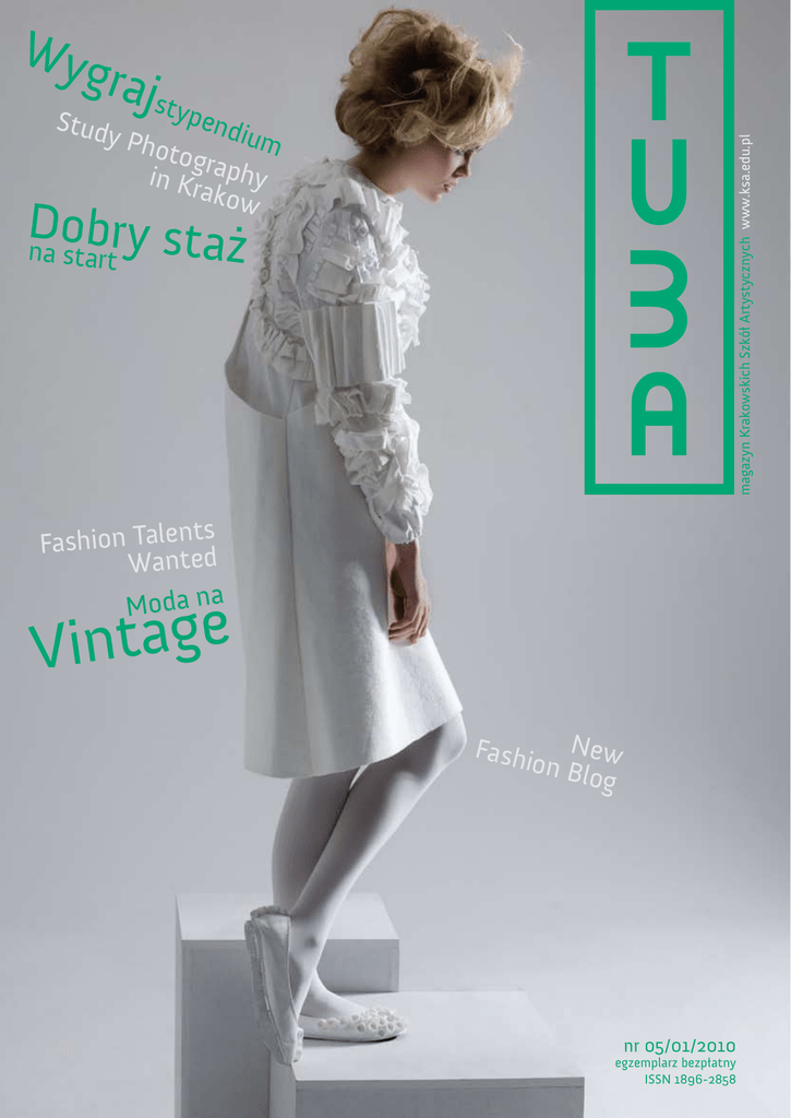 Wyg rajsty pen dium y Pho togra in Kr phy akow →magazyn Krakowskich Szkół Artystycznych www.ksa.edu.pl Stud D obry staż na start s Fashion Talentd Wante Moda na e g a t n Vi Fashi New on Bl og nr 05/01/2010 egzemplarz bezpłatny ISSN 1896-2858 telegram Rok 2009 w telegraficznym skrócie Telegram nr 4 / Telegram no 4 Telegram nr 1 / Telegram no 1 > Triumf Sapu na Międzynarodowym Konkursie dla Projektantów „Złota Nitka”. Stop. Nagrody Jury Kreatorów: Złota Nitka w kategorii prêt a porter: Małgorzata Grzywnowicz i Małgorzata Węgiel. Stop. Złota Nitka w kategorii premier vision: Magdalena Śmielak. Stop Wyróżnienie prêt a porter: Dąbrówka Szopa. Stop. Wyróżnienia premier vision: Magdalena Dąbrowska, Marta Mandla i Szymon Rychlik. Stop. Nagrody Jury Mediów: Pierwsze miejsce w kategorii prêt a porter: Małgorzata Grzywnowicz i Małgorzata Węgiel. Stop. Pierwsze miejsce w kategorii premier vision: Magdalena Dąbrowska. Stop Wyróżnienie prêt a porter: Dąbrówka Szopa. Stop. Wyróżnienie premier vision: Magdalena Śmielak, Grażyna Łoboda > The School’s Fashion Department (SAPU) success at International Contest for Clothes’Designers”Golden Thread”2009 The Designers’ Jury Awards Golden Thread in prêt a porter category: Małgorzata Grzywnowicz and Małgorzata Węgiel Golden Thread in premier vision category: Magdalena Śmielak Honorable mention in prêt a porter category: Dąbrówka Szopa Honorable mention in premier vision category: Magdalena Dąbrowska and duet Marta Mandla, Szymon Rychlik. > Krakowskie Szkoły Artystyczne bez granic. Stop. KSA otworzyło drzwi dla studentów z zagranicy. Stop. Naukę w Krakowskich Szkołach Artystycznych może rozpocząć każdy obcokrajowiec z pasją. Obecni słuchacze studiują dzięki programowi wymiany studentów Leonardo da Vinci oraz nawiązaniu współpracy partnerskiej ze szkołami o podobnym profilu w Niemczech, Włoszech, Hiszpanii i na Łotwie. Stop. Przyszli natomiast mogą zapisać się do szkoły bez pośredników. Wszelkie informacje o rekrutacji dostępne są na www.ksa.edu.pl. > Fashion and photography talents wanted. Cracow School of Art and Fashion Design - Fashion and Photography Departments open their doors to international students. Within the Leonardo da Vinci student exchange programme the school has started a successful co-operation with other schools from Germany, Italy, Spain and Latvia. For further admission information, please visit the school’s website www.ksa.edu.pl. Telegram nr 2 / Telegram no 2 > Nowa siedziba Krakowskich Szkół Artystycznych. Stop. Nowa siedziba KSA mieści się przy ulicy Zamoyskiego 52 w Krakowie. Stop. Nowoczesny dizajn i szerokie przestrzenie sprzyjają kreatywności. Stop. > New location This year students entered the new school building at Zamoyskiego 52 in Kraków. It’s modern design and large open spaces stimulate their creativity. Telegram nr 5 / Telegram no 5 > Cracow Fashion Week 2009- to dopiero początek. Stop. Pierwszy krakowski Fashion Week zaczął się pokazem dyplomowym absolwentów SAPU - Cracow Fashion Awards. Stop. Zakończył się natomiast pokazami mody w Galerii Kazimierz. Stop. Na obu imprezach triumfowała Grażyna Łoboda ze swoją kolekcją „Konstruując przestrzeń” Stop. Ponadto nagrody otrzymali: Magdalena Wielgosz - „Paź królowej” Małgorzata Grzywnowicz i Małgorzata Węgiel - „Phantas magoria” Telegram nr 5 Anita Grzyb - „Chromatyczne multiplikacje” / Telegram no 5 Izabela Płużek - „Fly away” Monika Czesak - „Szary Mary” Anna Parkitna - „Walk in the sky” Kamilla Woźniak - „Ocean wełny” Agnieszka Dydo - „Labirynt” Katarzyna Tarabuła - „Christmas in Tokio” Dominika Wolnicka - „Electrohead” Karolina Warszawa - „To be a woman” Magdalena Wasik - „Geometria cięć” Telegram nr 3 / Telegram no 3 > SAPU „The best School Habitus Baltija 2009”. Stop. Szkoła Artystycznego Projektowania Ubioru podczas konkursu w Rydze zdobyła statuetkę dla najlepszej uczelni. Stop. W tym samym konkursie Peggy Pawłowski zdobyła statuetkę Grand Prix w kategorii „Artistic prêt a porter”. Stop. Konkurs w kategorii „Avant-garde fashion of high artistic value” wygrała Magdalena Śmielak. Stop. > ”.The Best School Habitus Baltija 2009” During The International Fashion Competition „Habitus Baltija” in Riga, Latvia - Cracow School of Art and Fashion Design was awarded the title „The Best School 2009”. The competition’s Grand Prix winner was Peggy Pawłowski with her “Gavroche” collection. Magdalena Śmielak’s collection was awarded the main prize in the “Avant-garde fashion of high artistic value” category. Telegra m nr 3 / Telegra m no 3 Magdale na Śmie lak, Dąbrów ka Szop a 2 proj. Małgorzata Grzywnowicz i Małgorzata Węgiel The main prize was awarded to Grażyna Łoboda. Martyna Sobczak - „Eklekti” Agnieszka Gątkiewicz - „Floryzacja” Magdalena Śmielak - „Destrukcja” Ewa Muchajer - „Uliczny poligon” Bartosz Wcisło - „Vanilla sposa” Cracow Fashion Week odbił się oczywiście szerokim echem. Stop. A będzie jeszcze lepiej. Stop. Więcej informacji na www.cfa.ksa.edu.pl Stop. > Cracow Fashion Week 2009 First Cracow Fashion Week started with Cracow Fashion Awards - SAPU graduates’ Diploma Show and ended with fashion shows in Galeria Kazimierz. The winner was Grażyna Łoboda. Numerous prizes, internships and scholarships were given to the following designers: Magdalena Wielgosz, Małgorzata Grzywnowicz and Małgorzata Węgiel, Anita Grzyb, Izabela Płużek, Monika Czesak, Anna Parkitna, Kamilla Woźniak, Agnieszka Dydo, Katarzyna Tarabuła. Dominika Wolnicka, Karolina Warszawa, Magdalena Wasik, Martyna Sobczak, Agnieszka Gątkiewicz, Magdalena Śmielak, Ewa Muchajer, Bartosz Wcisło. For more info check at www.cfa.ksa.edu.pl Telegram nr 8 / Telegram no 8 > Ruszył blog Karkowskich Szkół Artystycznych. Stop. Pod adresem http://ksavery