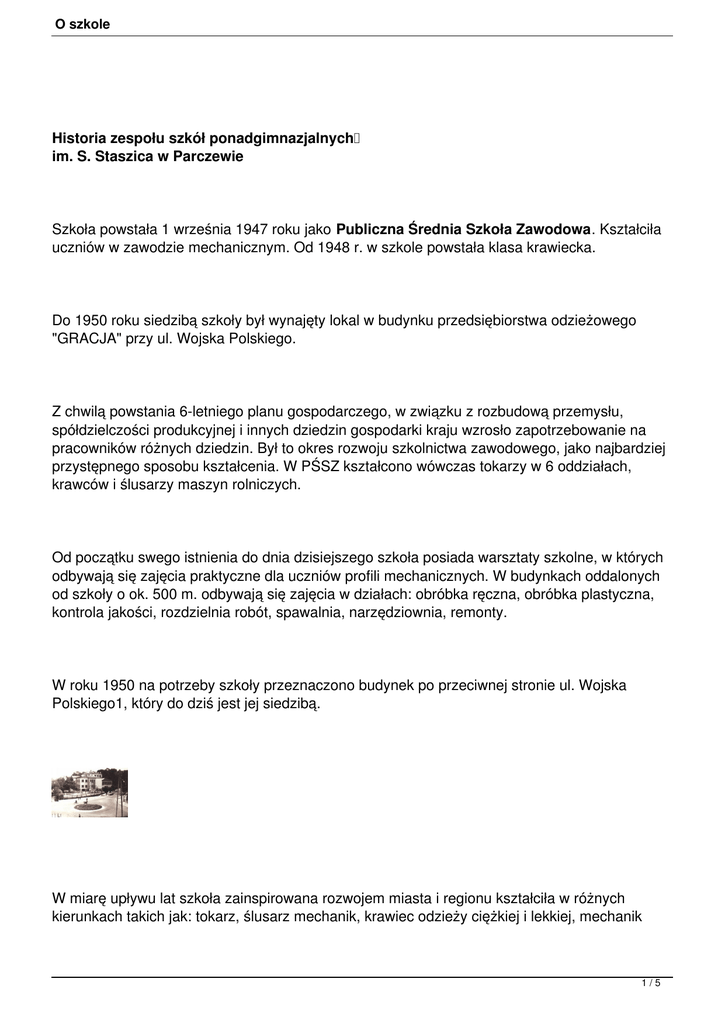 O szkole Historia zespołu szkół ponadgimnazjalnych im. S. Staszica w Parczewie Szkoła powstała 1 września 1947 roku jako Publiczna Średnia Szkoła Zawodowa. Kształciła uczniów w zawodzie mechanicznym. Od 1948 r. w szkole powstała klasa krawiecka. Do 1950 roku siedzibą szkoły był wynajęty lokal w budynku przedsiębiorstwa odzieżowego "GRACJA" przy ul. Wojska Polskiego. Z chwilą powstania 6-letniego planu gospodarczego, w związku z rozbudową przemysłu, spółdzielczości produkcyjnej i innych dziedzin gospodarki kraju wzrosło zapotrzebowanie na pracowników różnych dziedzin. Był to okres rozwoju szkolnictwa zawodowego, jako najbardziej przystępnego sposobu kształcenia. W PŚSZ kształcono wówczas tokarzy w 6 oddziałach, krawców i ślusarzy maszyn rolniczych. Od początku swego istnienia do dnia dzisiejszego szkoła posiada warsztaty szkolne, w których odbywają się zajęcia praktyczne dla uczniów profili mechanicznych. W budynkach oddalonych od szkoły o ok. 500 m. odbywają się zajęcia w działach: obróbka ręczna, obróbka plastyczna, kontrola jakości, rozdzielnia robót, spawalnia, narzędziownia, remonty. W roku 1950 na potrzeby szkoły przeznaczono budynek po przeciwnej stronie ul. Wojska Polskiego1, który do dziś jest jej siedzibą. W miarę upływu lat szkoła zainspirowana rozwojem miasta i regionu kształciła w różnych kierunkach takich jak: tokarz, ślusarz mechanik, krawiec odzieży ciężkiej i lekkiej, mechanik 1/5 O szkole pojazdów samochodowych, murarz, hutnik i zdobnik szkła. W latach 1968 - 69 dominują dwa zasadnicze kierunki kształcenia: krawiecki - trzy klasy dziewcząt i metalowy - siedem klas koedukacyjnych. W roku 1972 utworzono Technikum Mechaniczne na podbudowie zasadniczej szkoły zawodowej. Dało to dużej części absolwentów możliwość kontynuowania nauki na szczeblu szkoły średniej kończącej się dyplomem i świadectwem dojrzałości. 1 września 1974 roku decyzją kuratora Okręgu Szkolnego w Lublinie szkoła zmieniła nazwę na Zespół Szkół Zawodowych w Parczewie. W latach siedemdziesiątych, wraz z rozwojem przemysłu elektronicznego Zespół Szkół Zawodowych otworzył nowy kierunek kształcenia zawodowego - monter podzespołów radiowo - telewizyjnych. W roku 1984 - w rocznicę powołania Komisji Edukacji Narodowej, Zespół Szkół Zawodowych w Parczewie przyjmuje imię Stanisława Staszica. Akt nadania imienia, w obecności władz oświatowych i administracyjnych, przy udziale grona pedagogicznego i młodzieży szkolnej odczytała Inspektor Oświaty i Wychowania w Parczewie Jolanta Gajko. Szkoła otrzymała wówczas nowy sztandar ufundowany przez Warszawskie Zakłady Telewizyjne i Komitet Rodzicielski. W 1986 r. w miejsce trzyletniego Technikum Mechanicznego po Zasadniczej Szkole Zawodowej powstaje pięcioletnie Technikum Mechaniczne dla absolwentów szkół podstawowych. Następnie, w roku 1990 powstaje pięcioletnie Technikum Elektroniczne na podbudowie szkoły podstawowej a w rok później zostaje reaktywowane trzyletnie Technikum Mechaniczne na podbudowie ZSZ. Wraz z rozwojem szkoły oraz zwiększonym naborem uczniów dyrektor podjął decyzję o rozbudowie budynku ZSZ . Rozbudowa trwała dwa lata. W dniu 28 września 1992 r. odbyła się uroczystość otwarcia nowego skrzydła budynku dydaktycznego Zespołu Szkół Zawodowych im. Stanisława Staszica w Parczewie. Mieści się tam dziesięć nowoczesnych pomieszczeń dydaktycznych, gabinet lekarski i stomatologiczny. 2/5 O szkole W roku 1995 Zespół Szkół Zawodowych im. St. Staszica został przyjęty do Towarzystwa Szkół Staszicowskich. W tym okresie rozpoczęto budowę hali sportowo - widowiskowej przy ZSZ w Parczewie. Oddano ją do użytku w 2000 roku. 7 czerwca 1997 roku Zespół Szkół Zawodowych w Parczewie obchodził uroczystość pięćdziesięciolecia istnienia. W czasie tej uroczystości, z udziałem byłych dyrektorów, pedagogów i wychowanków, odsłonięto pamiątkową tablicę na frontowej ścianie budynku. Aktu odsłonięcia dokonali bialskopodlascy parlamentarzyści: senator Henryk Makarewicz i poseł Tadeusz Sławecki. W historii istnienia szkoły kolejnymi dyrektorami byli: 1. Stanisław Cholewa - 01.09.1947 - 31.08.1957 2. Amelia Cholewa - 01.09.1957 - 31.08.1958 3. Ignacy Misztal - 01.09.1958 - 31.08.1973 4. inż. Henryk Szych - 01.09.1973 - 18.01.1975 5. mgr Zbigniew Ziółkowski - 01.02.1975 - 31. 08.1980 6. mgr Jan Rzeżutka - 01.09.1980 - 31.12.2011 7. mgr inż. Mirosław Kowalski - 01.01.2012 - do dziś Od 1 września 2000r. do 1 września 2004r. szkoła nosiła nazwęCentrum Kształcenia Ustawicznego . Nazwa ta odzwierciedlała tendencje kształcenia szkoły, czyli obok kształcenia młodzieży, realizuje program kształcenia dorosłych. W chwili obecnej tj. od 1 września 2004r. nosi nazwę Zespół Szkół Ponadgimnazjalnych im. Stanisława Staszica w Parczewie. 3/5 O szkole W dniach 2 - 3 lipca 2005 roku odbył się I Zjazd Absolwentów Technikum i Zasadniczych Szkół Zawodowych w Parczewie Roczników Technikum 1972 - 1995 i Roczników Zasadniczej Szkoły Zawodowej 1947 - 1985. 5 marca 2007 r. zainaugurowano obchody 60 - lecia istnienia Zespołu Szkół Ponadgimnazjalnych im. Stanisława Staszica w Parczewie, które zakończyły się do II Zjazdem Absolwentów, klas Technikum rocznik 1972 - 2000 i Zasadniczej Szkoły Zawodowej 1947 1990 w dniach 30.06 - 01.07.2008 r. Mottem szkoły są słowa Staszica "Człowiek jest materią na każde dzieło mniej lub więcej zdatną , edukacja wszystko z niego zrobi". W swej działalności dydaktyczno - wychowawczej Szkoła godnie wypełnia motto, jakie mu przyświeca. Oferuje szeroki zakres kierunków kształcenia, utrzymując przy tym wysoki poziom nauczania. Dowodem na to jest wiele osiągnięć uczniów w wielu dziedzinach. Ponadto : szkoła realizuje zadania opiekuńcze, wychowawcze i dydaktyczne poprzez: -umożliwianie poznania rozumienia świata i jego kultury, - po