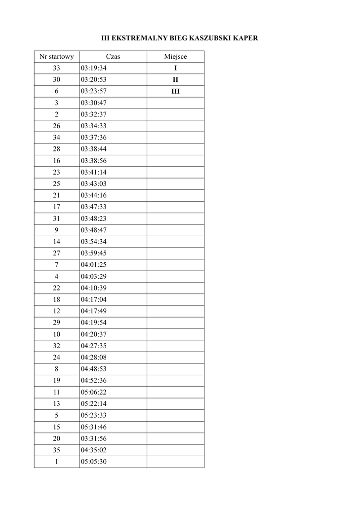 III EKSTREMALNY BIEG KASZUBSKI KAPER Nr startowy Czas Miejsce 33 03:19:34 I 30 03:20:53 II 6 03:23:57 III 3 03:30:47 2 03:32:37 26 03:34:33 34 03:37:36 28 03:38:44 16 03:38:56 23 03:41:14 25 03:43:03 21 03:44:16 17 03:47:33 31 03:48:23 9 03:48:47 14 03:54:34 27 03:59:45 7 04:01:25 4 04:03:29 22 04:10:39 18 04:17:04 12 04:17:49 29 04:19:54 10 04:20:37 32 04:27:35 24 04:28:08 8 04:48:53 19 04:52:36 11 05:06:22 13 05:22:14 5 05:23:33 15 05:31:46 20 03:31:56 35 04:35:02 1 05:05:30