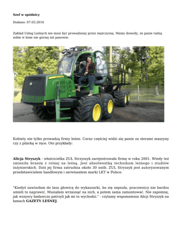 Szef w spódnicy Dodano: 07.03.2016 Zakład Usług Leśnych nie musi być prowadzony przez mężczyznę. Mamy dowody, że panie radzą sobie w lesie nie gorzej niż panowie. Kobiety nie tylko prowadzą firmy leśne. Coraz częściej widzi się panie za sterami maszyny czy z pilarką w ręce. Oto przykłady: Alicja Stryszyk - właścicielka ZUL Strzyszyk zarejestrowała firmę w roku 2001. Wtedy też zmieniła branżę z rolnej na leśną. Jest absolwentką technikum leśnego i studiów inżynierskich. Dziś jej firma zatrudnia około 30 osób. ZUL Stryszyk jest autoryzowanym przedstawicielem handlowym i serwisantem marki LKT w Polsce. "Kiedyś zawiozłam do lasu głowicę do wykaszarki, bo się zepsuła, pracownicy nie bardzo umieli to naprawić. Musiałam wrzasnąć na nich, a potem sama zamontować. Nie zapomnę, jak wszyscy badawczo patrzyli jak mi to wychodzi." - czytamy wspomnienia Alicji Stryszyk na łamach GAZETY LEŚNEJ. Kolejną bohaterką artykułu jest Elżbieta Jędrzejewska - zatrudniająca 20 osób w swoim zulu. "20 lat temu zatrudnialiśmy dwie osoby. Wtedy jeździło się do lasu rowerem albo komarkiem. Potem kupiliśmy ciągnik 30-tkę i tak powoli zbudowaliśmy dwie firmy" - mówi zadowolona właścicielka firmy. Zakładów usług leśnych prowadzonych przez kobiety jest coraz więcej. Kobiety mają w lesie takie same szanse, jak mężczyźni, choć dysponują innymi umiejętnościami. Zgodnie z opinią Alicji Stryszyk, chodzi głównie o komunikatywność i nastawienie do człowieka. Choć, jak zapewne większość z Was dobrze wie, praca w lesie nie ruszy jeśli od czasu do czasu nie rzuci się przysłowiowym mięsem. A i to panie potrafią - tyle, że z większą gracją. Komentarze (0) Nie dodano jeszcze żadnego komentarza.