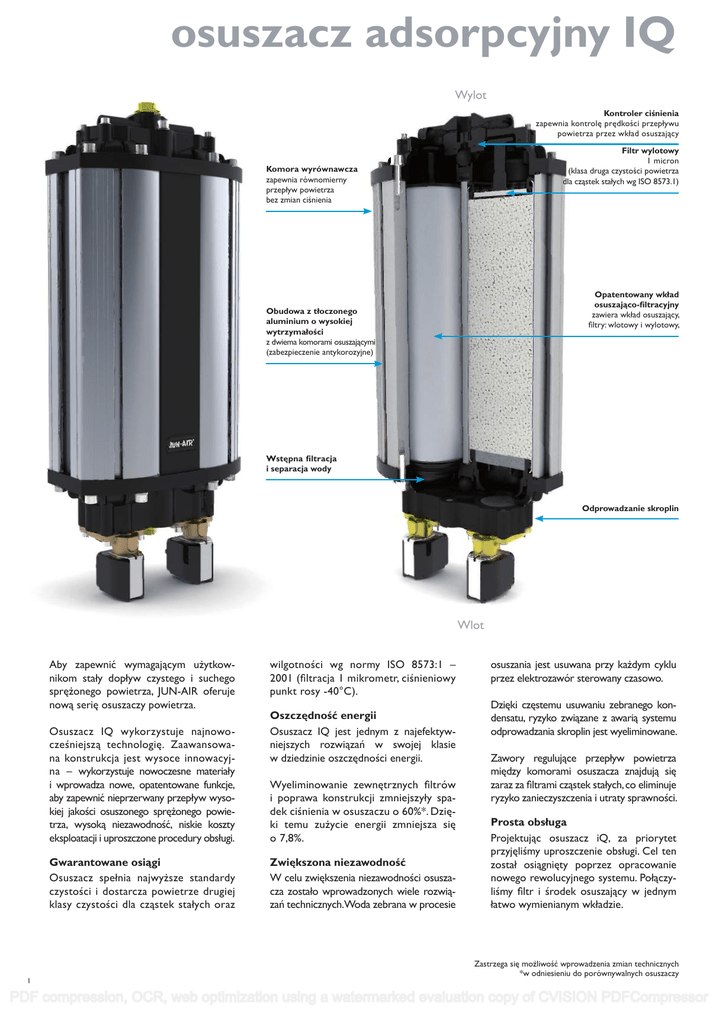 osuszacz adsorpcyjny IQ Wylot Kontroler ciśnienia zapewnia kontrolę prędkości przepływu powietrza przez wkład osuszający Filtr wylotowy 1 micron (klasa druga czystości powietrza dla cząstek stałych wg ISO 8573.1) Komora wyrównawcza zapewnia równomierny przepływ powietrza bez zmian ciśnienia Opatentowany wkład osuszająco-filtracyjny zawiera wkład osuszający, filtry: wlotowy i wylotowy, Obudowa z tłoczonego aluminium o wysokiej wytrzymałości z dwiema komorami osuszającymi (zabezpieczenie antykorozyjne) Wstępna filtracja i separacja wody Odprowadzanie skroplin Wlot Aby zapewnić wymagającym użytkownikom stały dopływ czystego i suchego sprężonego powietrza, JUN-AIR oferuje nową serię osuszaczy powietrza. Osuszacz IQ wykorzystuje najnowocześniejszą technologię. Zaawansowana konstrukcja jest wysoce innowacyjna – wykorzystuje nowoczesne materiały i wprowadza nowe, opatentowane funkcje, aby zapewnić nieprzerwany przepływ wysokiej jakości osuszonego sprężonego powietrza, wysoką niezawodność, niskie koszty eksploatacji i uproszczone procedury obsługi. Gwarantowane osiągi Osuszacz spełnia najwyższe standardy czystości i dostarcza powietrze drugiej klasy czystości dla cząstek stałych oraz 1 wilgotności wg normy ISO 8573:1 – 2001 (filtracja 1 mikrometr, ciśnieniowy punkt rosy -40°C). Oszczędność energii Osuszacz IQ jest jednym z najefektywniejszych rozwiązań w swojej klasie w dziedzinie oszczędności energii. Wyeliminowanie zewnętrznych filtrów i poprawa konstrukcji zmniejszyły spadek ciśnienia w osuszaczu o 60%*. Dzięki temu zużycie energii zmniejsza się o 7,8%. Zwiększona niezawodność W celu zwiększenia niezawodności osuszacza zostało wprowadzonych wiele rozwiązań technicznych.Woda zebrana w procesie osuszania jest usuwana przy każdym cyklu przez elektrozawór sterowany czasowo. Dzięki częstemu usuwaniu zebranego kondensatu, ryzyko związane z awarią systemu odprowadzania skroplin jest wyeliminowane. Zawory regulujące przepływ powietrza między komorami osuszacza znajdują się zaraz za filtrami cząstek stałych, co eliminuje ryzyko zanieczyszczenia i utraty sprawności. Prosta obsługa Projektując osuszacz iQ, za priorytet przyjęliśmy uproszczenie obsługi. Cel ten został osiągnięty poprzez opracowanie nowego rewolucyjnego systemu. Połączyliśmy filtr i środek osuszający w jednym łatwo wymienianym wkładzie. Zastrzega się możliwość wprowadzenia zmian technicznych *w odniesieniu do porównywalnych osuszaczy 2 PDF compression, OCR, web optimization using a watermarked evaluation copy of CVISION PDFCompressor nowoczesność i prostota Dodatkowo wprowadziliśmy nowe zestawy naprawcze zawierające wszystkie podzespoły niezbędne do prawidłowej obsługi serwisowej osuszacza. Filtr / wkład osuszający • Unikalna, opatentowana funkcja • Dwustopniowa wewnętrzna filtracja (eliminuje konieczność stosowania zewnętrznych filtrów) • •• Filtracja wstępna zapewnia równomierny przepływ i małe straty ciśnienia • Filtracja końcowa – klasa 2 czystości powietrza dla cząstek stałych według normy ISO 8573 • •• Łatwy do wymiany zintegrowany wkład filtrująco-osuszający – wymiana nie wymaga zastosowania specjalistycznych narzędzi • •• Wkład może być zamontowany tylko w jeden sposób, eliminując tym możliwość nieprawidłowego montażu • Łatwy do wymiany zintegrowany wkład filtrująco-osuszający wymiana nie wymaga zastosowania specjalistycznych narzędzi Specyfikacja iQ dryer Osuszacz iQ dostępny w sprężarkach JUN-AIR serii M Klasa czystości ISO 8573 – 1: 2001 Klasa 2: Cząstki stałe: 1μ Klasa 2: Wilgoć: -40°C (ciśnieniowy punkt rosy) Minimalne ciśnienie robocze 4 barg (58 psig) Maksymalne ciśnienie robocze 12 barg (174 psig) Zasilanie 230V AC Minimalna temperatura wlotowa 0°C (32°F) Maksymalna temperatura wlotowa 50°C (122°F) Temperatura otoczenia Max: 40°C (104°F) Zastrzega się możliwość wprowadzenia zmian technicznych 2 PDF compression, OCR, web optimization using a watermarked evaluation copy of CVISION PDFCompressor