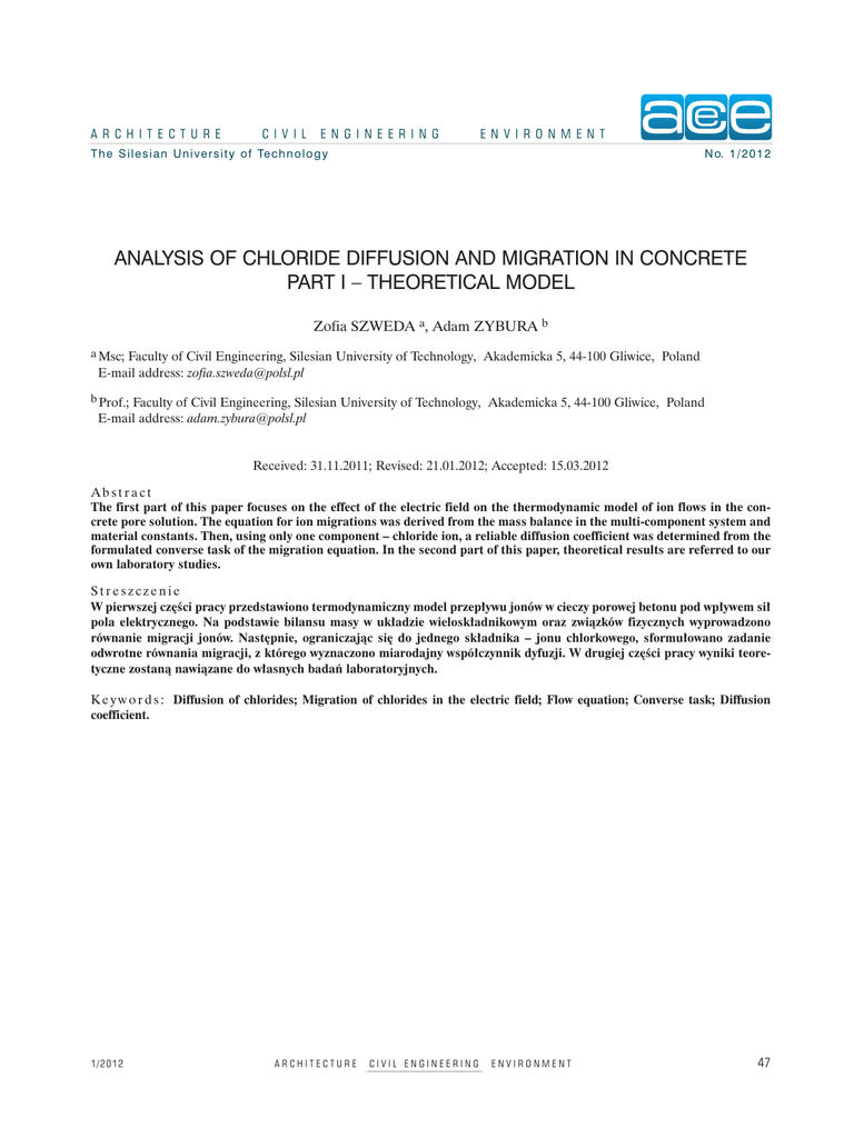 A R C H I T E C T U R E C I V I L E N G I N E E R I N G E N V I R O N M E N T T h e S i l e s i a n U n i v e r s i t y o f Te c h n o l o g y N o. 1 / 2 0 1 2 ANALYSIS OF CHLORIDE DIFFUSION AND MIGRATION IN CONCRETE PART I – THEORETICAL MODEL Zofia SZWEDA a, Adam ZYBURA b a Msc; Faculty of Civil Engineering, Silesian University of Technology, Akademicka 5, 44-100 Gliwice, Poland E-mail address: [email protected] b Prof.; Faculty of Civil Engineering, Silesian University of Technology, Akademicka 5, 44-100 Gliwice, Poland E-mail address: [email protected] Received: 31.11.2011; Revised: 21.01.2012; Accepted: 15.03.2012 Abstract The first part of this paper focuses on the effect of the electric field on the thermodynamic model of ion flows in the concrete pore solution. The equation for ion migrations was derived from the mass balance in the multi-component system and material constants. Then, using only one component – chloride ion, a reliable diffusion coefficient was determined from the formulated converse task of the migration equation. In the second part of this paper, theoretical results are referred to our own laboratory studies. Streszczenie W pierwszej części pracy przedstawiono termodynamiczny model przepływu jonów w cieczy porowej betonu pod wpływem sił pola elektrycznego. Na podstawie bilansu masy w układzie wieloskładnikowym oraz związków fizycznych wyprowadzono równanie migracji jonów. Następnie, ograniczając się do jednego składnika – jonu chlorkowego, sformułowano zadanie odwrotne równania migracji, z którego wyznaczono miarodajny współczynnik dyfuzji. W drugiej części pracy wyniki teoretyczne zostaną nawiązane do własnych badań laboratoryjnych. K e y w o r d s : Diffusion of chlorides; Migration of chlorides in the electric field; Flow equation; Converse task; Diffusion coefficient. 1/2012 ARCHITECTURE CIVIL ENGINEERING ENVIRONMENT 47