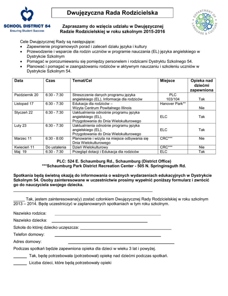 Dwujęzyczna Rada Rodzicielska Zapraszamy do wzięcia udziału w Dwujęzycznej Radzie Rodzicielskiej w roku szkolnym 2015-2016 Cele Dwujęzycznej Rady są następujące: Zapewnienie programowych porad i zaleceń działu języka i kultury Przewodzenie i wsparcie dla rodzin uczniów w programie nauczania (EL) języka angielskiego w Dystrykcie Szkolnym Pomagać w porozumiewaniu się pomiędzy personelem i rodzicami Dystryktu Szkolnego 54. Planować i pomagać w zaangażowaniu rodziców w aktywnym nauczaniu i szkoleniu uczniów w Dystrykcie Szkolnym 54. Data Czas Temat/Cel Miejsce Październik 20 6:30 - 7:30 Listopad 17 6:30 - 7:30 PLC 103/104 Hanover Park** Styczeń 22 6:30 - 7:30 Streszczenie danych programu języka angielskiego (EL), Informacje dla rodzicόw Edukacja dla rodzicόw – Wizyta Centrum Powitalnego Illinois Uaktualnienia odnośnie programu języka angielskiego (EL), Przygotowania do Dnia Wielokulturowego Uaktualnienia odnośnie programu języka angielskiego (EL), Przygotowania do Dnia Wielokulturowego Planowanie i wizyta na miejsce odbywania się Dnia Wielokulturowego Dzień Wielokulturowy Przegląd dotacji i Edukacja dla rodzicόw Luty 23 6:30 - 7:30 Marzec 11 6:30 - 8:00 Kwiecień 11 Maj 19 Do ustalenia 6:30 - 7:30 Opieka nad dziećmi zapewniona Tak Nie ELC Tak ELC Tak CRC*** Nie CRC*** ELC Nie Tak PLC: 524 E. Schaumburg Rd., Schaumburg (District Office) ***Schaumburg Park District Recreation Center - 505 N. Springinsguth Rd. Spotkania będą świetną okazją do informowania o ważnych wydarzeniach edukacyjnych w Dystrykcie Szkolnym 54. Osoby zainteresowane w uczestnictwie prosimy wypełnić poniższy formularz i zwrócić go do nauczyciela swojego dziecka. _____________________________________________________________ _____ Tak, jestem zainteresowana(y) zostać członkiem Dwujęzycznej Rady Rodzicielskiej w roku szkolnym 2013 – 2014. Będę uczestniczyć w zaplanowanych spotkaniach w tym roku szkolnym. Nazwisko rodzica: Nazwisko dziecka: Szkoła do ktόrej dziecko uczęszcza: ________________________________________ Telefon domowy: Adres domowy: Podczas spotkań będzie zapewniona opieka dla dzieci w wieku 3 lat i powyżej. Tak, będę potrzebowała (potrzebował) opiekę nad dziećmi podczas spotkań. Liczba dzieci, które będą potrzebowały opieki
