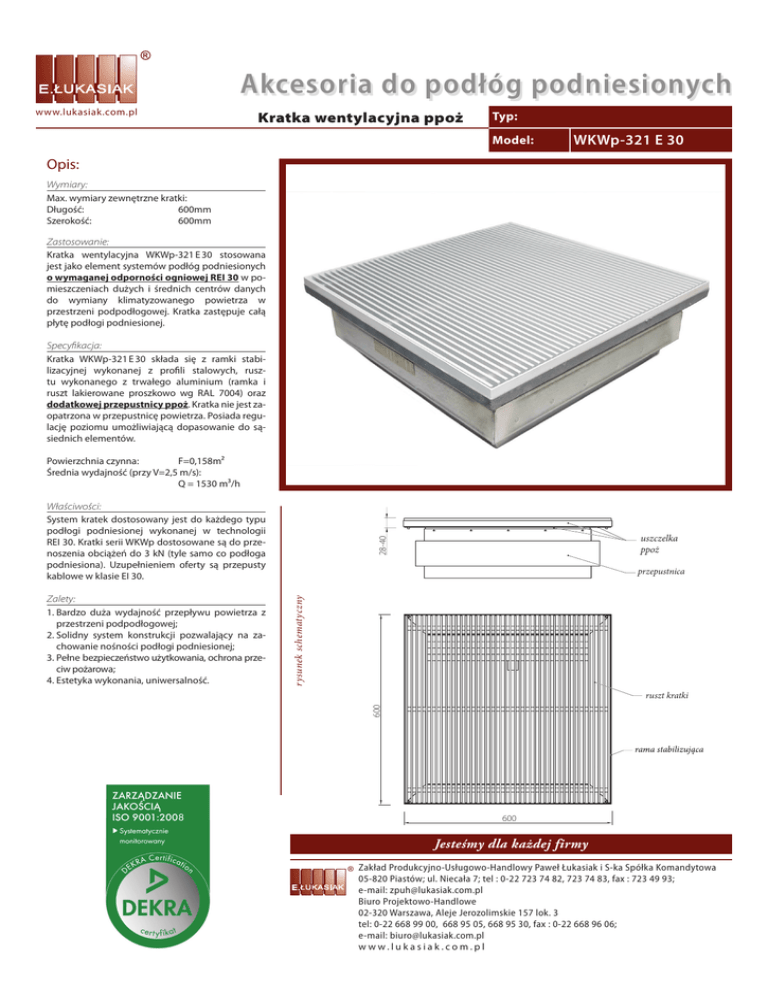 Akcesoria do podłóg podniesionych www.lukasiak.com.pl Kratka wentylacyjna ppoż Typ: Model: WKWp-321 E 30 Opis: Wymiary: Max. wymiary zewnętrzne kratki: Długość:600mm Szerokość:600mm Zastosowanie: Kratka wentylacyjna WKWp-321 E 30 stosowana jest jako element systemów podłóg podniesionych o wymaganej odporności ogniowej REI 30 w pomieszczeniach dużych i średnich centrów danych do wymiany klimatyzowanego powietrza w przestrzeni podpodłogowej. Kratka zastępuje całą płytę podłogi podniesionej. Specyfikacja: Kratka WKWp-321 E 30 składa się z ramki stabilizacyjnej wykonanej z profili stalowych, rusztu wykonanego z trwałego aluminium (ramka i ruszt lakierowane proszkowo wg RAL 7004) oraz dodatkowej przepustnicy ppoż. Kratka nie jest zaopatrzona w przepustnicę powietrza. Posiada regulację poziomu umożliwiającą dopasowanie do sąsiednich elementów. Powierzchnia czynna: F=0,158m2 Średnia wydajność (przy V=2,5 m/s): Q = 1530 m3/h przepustnica rysunek schematyczny ruszt kratki 600 Zalety: 1. Bardzo duża wydajność przepływu powietrza z przestrzeni podpodłogowej; 2. Solidny system konstrukcji pozwalający na zachowanie nośności podłogi podniesionej; 3. Pełne bezpieczeństwo użytkowania, ochrona przeciw pożarowa; 4. Estetyka wykonania, uniwersalność. uszczelka ppoż 28-40 Właściwości: System kratek dostosowany jest do każdego typu podłogi podniesionej wykonanej w technologii REI 30. Kratki serii WKWp dostosowane są do przenoszenia obciążeń do 3 kN (tyle samo co podłoga podniesiona). Uzupełnieniem oferty są przepusty kablowe w klasie EI 30. 600 Jesteśmy dla każdej firmy Zakład Produkcyjno-Usługowo-Handlowy Paweł Łukasiak i S-ka Spółka Komandytowa 05-820 Piastów; ul. Niecała 7; tel : 0-22 723 74 82, 723 74 83, fax : 723 49 93; e-mail: [email protected] Biuro Projektowo-Handlowe 02-320 Warszawa, Aleje Jerozolimskie 157 lok. 3 tel: 0-22 668 99 00, 668 95 05, 668 95 30, fax : 0-22 668 96 06; e-mail: [email protected] w w w.luk asiak .com.pl