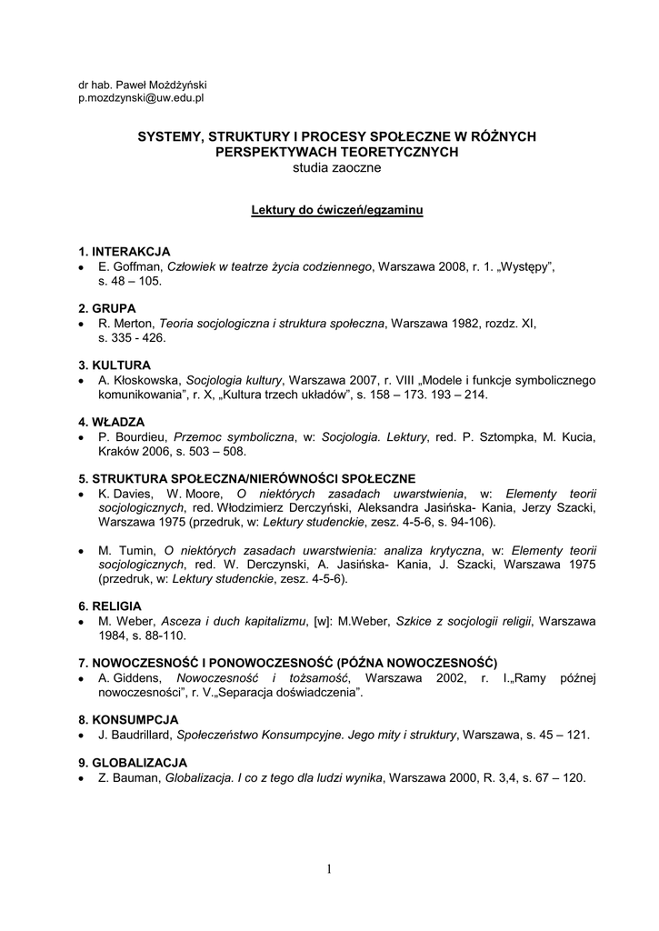 dr hab. Paweł Możdżyński [email protected] SYSTEMY, STRUKTURY I PROCESY SPOŁECZNE W RÓŻNYCH PERSPEKTYWACH TEORETYCZNYCH studia zaoczne Lektury do ćwiczeń/egzaminu 1. INTERAKCJA E. Goffman, Człowiek w teatrze życia codziennego, Warszawa 2008, r. 1. „Występy”, s. 48 – 105. 2. GRUPA R. Merton, Teoria socjologiczna i struktura społeczna, Warszawa 1982, rozdz. XI, s. 335 - 426. 3. KULTURA A. Kłoskowska, Socjologia kultury, Warszawa 2007, r. VIII „Modele i funkcje symbolicznego komunikowania”, r. X, „Kultura trzech układów”, s. 158 – 173. 193 – 214. 4. WŁADZA P. Bourdieu, Przemoc symboliczna, w: Socjologia. Lektury, red. P. Sztompka, M. Kucia, Kraków 2006, s. 503 – 508. 5. STRUKTURA SPOŁECZNA/NIERÓWNOŚCI SPOŁECZNE K. Davies, W. Moore, O niektórych zasadach uwarstwienia, w: Elementy teorii socjologicznych, red. Włodzimierz Derczyński, Aleksandra Jasińska- Kania, Jerzy Szacki, Warszawa 1975 (przedruk, w: Lektury studenckie, zesz. 4-5-6, s. 94-106). M. Tumin, O niektórych zasadach uwarstwienia: analiza krytyczna, w: Elementy teorii socjologicznych, red. W. Derczynski, A. Jasińska- Kania, J. Szacki, Warszawa 1975 (przedruk, w: Lektury studenckie, zesz. 4-5-6). 6. RELIGIA M. Weber, Asceza i duch kapitalizmu, [w]: M.Weber, Szkice z socjologii religii, Warszawa 1984, s. 88-110. 7. NOWOCZESNOŚĆ I PONOWOCZESNOŚĆ (PÓŹNA NOWOCZESNOŚĆ) A. Giddens, Nowoczesność i tożsamość, Warszawa 2002, r. I.„Ramy nowoczesności”, r. V.„Separacja doświadczenia”. późnej 8. KONSUMPCJA J. Baudrillard, Społeczeństwo Konsumpcyjne. Jego mity i struktury, Warszawa, s. 45 – 121. 9. GLOBALIZACJA Z. Bauman, Globalizacja. I co z tego dla ludzi wynika, Warszawa 2000, R. 3,4, s. 67 – 120. 1 Lektury do egzaminu (Egzamin będzie obejmował wiedzę z lektur omawianych na ćwiczeniach oraz poniżej przedstawionych) 1. Z. Bauman, Socjologia, Warszawa 1996, r. 8, „Natura i kultura”, s. 147 – 166. 2. S. Lukes, Władza i panowanie, w: Socjologia. Lektury, red. P. Sztompka, M. Kucia, Kraków 2006, s. 492 – 503. 3. E. Goffman, Charakterystyka instytucji totalnych, w: Elementy teorii socjologicznych, red. W. Derczyński, A. Jasińska-Kania, J. Szacki lub, w: Lektury Studenckie, SKN, zeszyt 45-6. 4. S. Ossowski, Struktura klasowa w społecznej świadomości, w: Dzieła, t. V, rozdz. 1-5 (przedruk [w]: tegoż: O strukturze społecznej, Warszawa 1982). 5. E. Durkheim, Elementarne formy życia religijnego. System totemiczny w Australii, Warszawa 2010, r. V, VI, VII, s. 147 – 207 6. D. Bell, Kulturowe sprzeczności kapitalizmu, w: D. Bell, Kulturowe sprzeczności kapitalizmu, Warszawa, s. 69 – 121. Lektury nadobowiązkowe – podręczniki 1. B. Szacka, Wstęp do socjologii, Warszawa 2003. 2. P. Sztompka, Socjologia, Analiza społeczeństwa, Kraków 2002. 3. A. Giddens, Socjologia, Warszawa 2004. 2