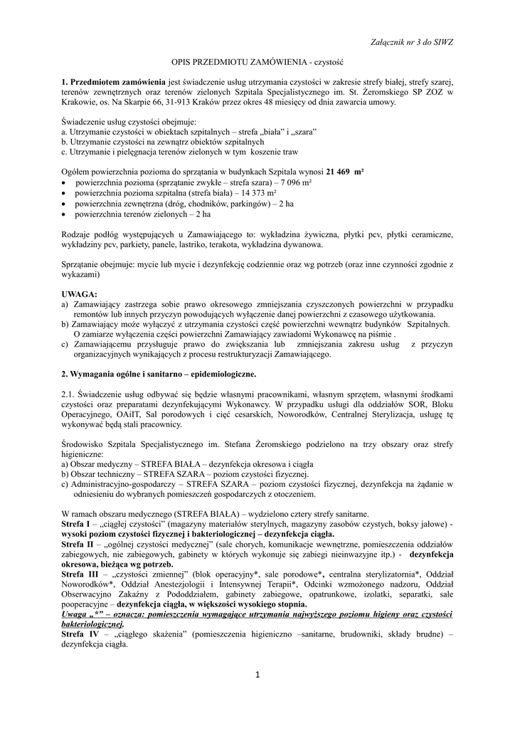 Załącznik nr 3 do SIWZ OPIS PRZEDMIOTU ZAMÓWIENIA - czystość 1. Przedmiotem zamówienia jest świadczenie usług utrzymania czystości w zakresie strefy białej, strefy szarej, terenów zewnętrznych oraz terenów zielonych Szpitala Specjalistycznego im. St. Żeromskiego SP ZOZ w Krakowie, os. Na Skarpie 66, 31-913 Kraków przez okres 48 miesięcy od dnia zawarcia umowy. Świadczenie usług czystości obejmuje: a. Utrzymanie czystości w obiektach szpitalnych – strefa „biała” i „szara” b. Utrzymanie czystości na zewnątrz obiektów szpitalnych c. Utrzymanie i pielęgnacja terenów zielonych w tym koszenie traw Ogółem powierzchnia pozioma do sprzątania w budynkach Szpitala wynosi 21 469 m² powierzchnia pozioma (sprzątanie zwykłe – strefa szara) – 7 096 m² powierzchnia pozioma szpitalna (strefa biała) – 14 373 m² powierzchnia zewnętrzna (dróg, chodników, parkingów) – 2 ha powierzchnia terenów zielonych – 2 ha Rodzaje podłóg występujących u Zamawiającego to: wykładzina żywiczna, płytki pcv, płytki ceramiczne, wykładziny pcv, parkiety, panele, lastriko, terakota, wykładzina dywanowa. Sprzątanie obejmuje: mycie lub mycie i dezynfekcję codziennie oraz wg potrzeb (oraz inne czynności zgodnie z wykazami) UWAGA: a) Zamawiający zastrzega sobie prawo okresowego zmniejszania czyszczonych powierzchni w przypadku remontów lub innych przyczyn powodujących wyłączenie danej powierzchni z czasowego użytkowania. b) Zamawiający może wyłączyć z utrzymania czystości część powierzchni wewnątrz budynków Szpitalnych. O zamiarze wyłączenia części powierzchni Zamawiający zawiadomi Wykonawcę na piśmie . c) Zamawiającemu przysługuje prawo do zwiększania lub zmniejszania zakresu usług z przyczyn organizacyjnych wynikających z procesu restrukturyzacji Zamawiającego. 2. Wymagania ogólne i sanitarno – epidemiologiczne. 2.1. Świadczenie usług odbywać się będzie własnymi pracownikami, własnym sprzętem, własnymi środkami czystości oraz preparatami dezynfekującymi Wykonawcy. W przypadku usługi dla oddziałów SOR, Bloku Operacyjnego, OAiIT, Sal porodowych i cięć cesarskich, Noworodków, Centralnej Sterylizacja, usługę tę wykonywać będą stali pracownicy. Środowisko Szpitala Specjalistycznego im. Stefana Żeromskiego podzielono na trzy obszary oraz strefy higieniczne: a) Obszar medyczny – STREFA BIAŁA – dezynfekcja okresowa i ciągła b) Obszar techniczny – STREFA SZARA – poziom czystości fizycznej. c) Administracyjno-gospodarczy – STREFA SZARA – poziom czystości fizycznej, dezynfekcja na żądanie w odniesieniu do wybranych pomieszczeń gospodarczych z otoczeniem. W ramach obszaru medycznego (STREFA BIAŁA) – wydzielono cztery strefy sanitarne. Strefa I – „ciągłej czystości” (magazyny materiałów sterylnych, magazyny zasobów czystych, boksy jałowe) wysoki poziom czystości fizycznej i bakteriologicznej – dezynfekcja ciągła. Strefa II – „ogólnej czystości medycznej” (sale chorych, komunikacje wewnętrzne, pomieszczenia oddziałów zabiegowych, nie zabiegowych, gabinety w których wykonuje się zabiegi nieinwazyjne itp.) - dezynfekcja okresowa, bieżąca wg potrzeb. Strefa III – „czystości zmiennej” (blok operacyjny*, sale porodowe*, centralna sterylizatornia*, Oddział Noworodków*, Oddział Anestezjologii i Intensywnej Terapii*, Odcinki wzmożonego nadzoru, Oddział Obserwacyjno Zakaźny z Pododdziałem, gabinety zabiegowe, opatrunkowe, izolatki, separatki, sale pooperacyjne – dezynfekcja ciągła, w większości wysokiego stopnia. Uwaga „*” – oznacza: pomieszczenia wymagające utrzymania najwyższego poziomu higieny oraz czystości bakteriologicznej. Strefa IV – „ciągłego skażenia” (pomieszczenia higieniczno –sanitarne, brudowniki, składy brudne) – dezynfekcja ciągła. 1 Szczegółowy sposób utrzymania czystości zawiera : a) Załącznik nr 3.1. do SIWZ - Wykaz czynności wchodzących w skład kompleksowego utrzymania czystości w Szpitalu - STREFA BIAŁA wraz z planem mycia i dezynfekcji Bloków Operacyjnych i sal zabiegowych. b) Załącznik nr 3.2. do SIWZ - wykaz obiektów do sprzątania w STREFIE BIAŁEJ z podziałem na odcinki. c) Załącznik nr 3.3. do SIWZ - Wykaz czynności wchodzących w skład kompleksowego utrzymania czystości – STREFA SZARA. d) Załącznik nr 3.4. do SIWZ – wykaz pomieszczeń do sprzątania w STREFIE SZAREJ. e) Załącznik nr 3.5. do SIWZ – Wykaz terenów i utrzymanie czystości na zewnątrz obiektów. f) Załącznik nr 3.6. do SIWZ – Pielęgnacja terenów zielonych. g) Załącznik nr 1.1. do SIWZ – Plan terenu Szpitala z zaznaczeniem obiektów i terenów zielonych. 2.2. Preparaty dezynfekujące muszą posiadać wpis/zgłoszenie/powiadomienie do Rejestru prowadzonego przez Prezesa Urzędu Rejestracji Produktów Leczniczych, Wyrobów Medycznych i Produktów Biobójczych, zgodnie z wymogami sanitarno – epidemiologicznymi obowiązującymi w podmiocie leczniczym. Emulsja/ mydło w płynie musi posiadać potwierdzenie przekazania informacji o kosmetyku do Portalu Zgłoszenia Produktów Kosmetycznych CPNP. Środki czystości i higieny, preparaty dezynfekcyjne używane do świadczenia usługi we wszystkich oddziałach/komórkach Szpitala winny być zatwierdzone przez Zespół ds. Zakażeń Szpitalnych Szpitala Specjalistycznego im. Stefana Żeromskiego SP ZOZ w Krakowie. Wykonawca zobowiązany jest przedłożyć Zamawiającemu zestawienie preparatów i środków, które będzie używał do mycia i dezynfekcji. Wykaz ten należy sporządzić wg. wzoru stanowiącego załącznik nr 9 do SIWZ. 2.3. Oferent musi być wyposażony w dostateczną ilość i odpowiedni rodzaj sprzętu niezbędnego do wykonywania przedmiotu zamówienia, między innymi: a) Dotyczy utrzymania czystości w Szpitalu (strefa „biała” i „szara”): 1/ Wózki do mycia i dezynfekcji (specjalistyczne dla strefy III preferowane w systemie zam
