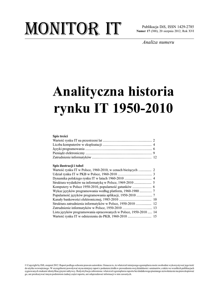 Monitor it Publikacja DiS, ISSN 1429-2785 Numer 17 (388), 20 sierpnia 2012, Rok XVI Analiza numeru Analityczna historia rynku IT 1950-2010 Spis treci Wartoæ rynku IT na przestrzeni lat ........................................................ 2 Liczba komputerów w eksploatacji ........................................................ 4 Jêzyki programowania ............................................................................ 6 Pieni¹dz elektroniczny ............................................................................ 9 Zatrudnienie informatyków .................................................................... 12 Spis ilustracji i tabel Wartoæ rynku IT w Polsce, 1960-2010, w cenach bie¿¹cych ............... 2 Udzia³ rynku IT w PKB w Polsce, 1960-2010 ....................................... 3 Dynamika polskiego rynku IT w latach 1960-2010 ............................... 4 Struktura wydatków na informatykê w Polsce, 1969-2010 .................... 5 Komputery w Polsce 1950-2010, popularnoæ gatunków ...................... 6 Wykaz jêzyków programowania wed³ug platform, 1960-1980 .............. 7 Popularnoæ jêzyków programowania aplikacji, 1950-2010 .................. 7 Kana³y bankowoci elektronicznej, 1985-2010 ..................................... 10 Struktura zatrudnienia informatyków w Polsce, 1950-2010 .................. 12 Zatrudnienie informatyków w Polsce, 1950-2010 .................................. 13 Lista jêzyków programowania opracowanych w Polsce, 1950-2010 ..... 14 Wartoæ rynku IT w odniesieniu do PKB, 1960-2010 ........................... 15 © Copyright by DiS, sierpieñ 2012. Raport podlega ochronie prawem autorskim. Oznacza to, ¿e w³aciciel niniejszego egzemplarza mo¿e swobodnie wykorzystywaæ jego treæ do u¿ytku wewnêtrznego. W szczególnoci powo³ywaæ siê na niniejszy raport z podaniem ród³a w prowadzeniu swej dzia³alnoci: seminariów, a tak¿e we wszelkich publikacjach sygnowanych znakami identyfikacyjnymi nabywcy. Redystrybucja zabroniona: w³aciciel egzemplarza raportu bez dodatkowego pisemnego zezwolenia nie ma prawa kopiowaæ go, ani przekazywaæ innym podmiotom ¿adnej czêci raportu, ani odsprzedawaæ informacji w nim zawartych. DiS, Monitor IT, numer 17 (388), 20 sierpnia 2012 1