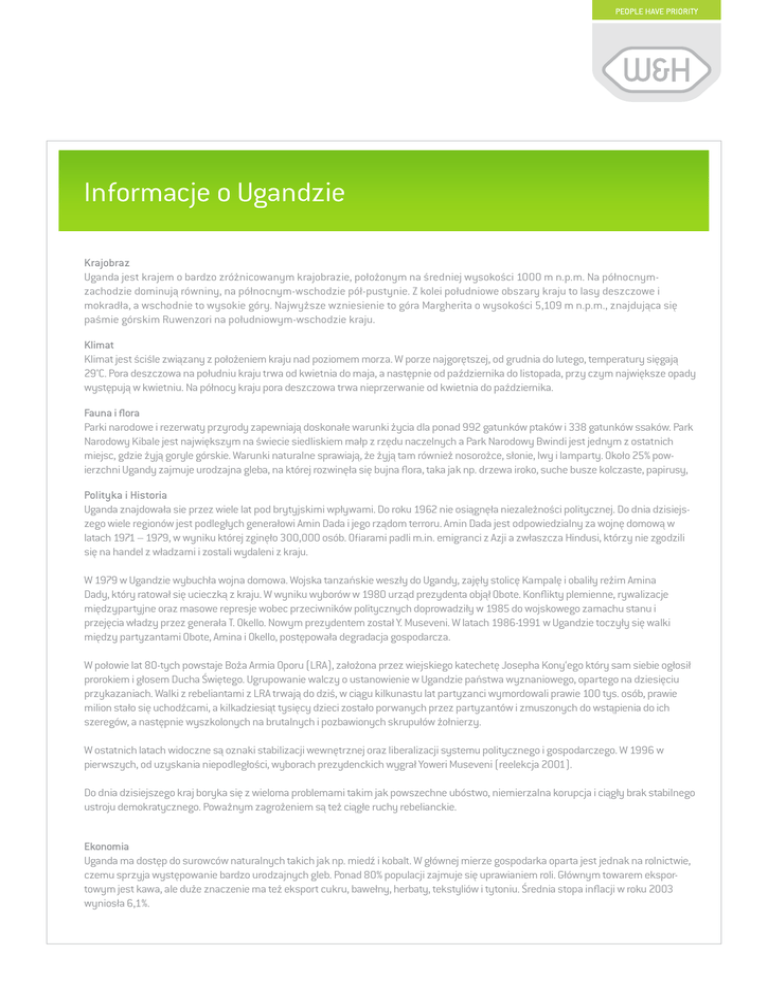 Informacje o Ugandzie Krajobraz Uganda jest krajem o bardzo zróżnicowanym krajobrazie, położonym na średniej wysokości 1000 m n.p.m. Na północnymzachodzie dominują równiny, na północnym-wschodzie pół-pustynie. Z kolei południowe obszary kraju to lasy deszczowe i mokradła, a wschodnie to wysokie góry. Najwyższe wzniesienie to góra Margherita o wysokości 5,109 m n.p.m., znajdująca się paśmie górskim Ruwenzori na południowym-wschodzie kraju. Klimat Klimat jest ściśle związany z położeniem kraju nad poziomem morza. W porze najgorętszej, od grudnia do lutego, temperatury sięgają 29°C. Pora deszczowa na południu kraju trwa od kwietnia do maja, a następnie od października do listopada, przy czym największe opady występują w kwietniu. Na północy kraju pora deszczowa trwa nieprzerwanie od kwietnia do października. Fauna i flora Parki narodowe i rezerwaty przyrody zapewniają doskonałe warunki życia dla ponad 992 gatunków ptaków i 338 gatunków ssaków. Park Narodowy Kibale jest największym na świecie siedliskiem małp z rzędu naczelnych a Park Narodowy Bwindi jest jednym z ostatnich miejsc, gdzie żyją goryle górskie. Warunki naturalne sprawiają, że żyją tam również nosorożce, słonie, lwy i lamparty. Około 25% powierzchni Ugandy zajmuje urodzajna gleba, na której rozwinęła się bujna flora, taka jak np. drzewa iroko, suche busze kolczaste, papirusy, Polityka i Historia Uganda znajdowała sie przez wiele lat pod brytyjskimi wpływami. Do roku 1962 nie osiągnęła niezależności politycznej. Do dnia dzisiejszego wiele regionów jest podległych generałowi Amin Dada i jego rządom terroru. Amin Dada jest odpowiedzialny za wojnę domową w latach 1971 – 1979, w wyniku której zginęło 300,000 osób. Ofiarami padli m.in. emigranci z Azji a zwłaszcza Hindusi, którzy nie zgodzili się na handel z władzami i zostali wydaleni z kraju. W 1979 w Ugandzie wybuchła wojna domowa. Wojska tanzańskie weszły do Ugandy, zajęły stolicę Kampalę i obaliły reżim Amina Dady, który ratował się ucieczką z kraju. W wyniku wyborów w 1980 urząd prezydenta objął Obote. Konflikty plemienne, rywalizacje międzypartyjne oraz masowe represje wobec przeciwników politycznych doprowadziły w 1985 do wojskowego zamachu stanu i przejęcia władzy przez generała T. Okello. Nowym prezydentem został Y. Museveni. W latach 1986-1991 w Ugandzie toczyły się walki między partyzantami Obote, Amina i Okello, postępowała degradacja gospodarcza. W połowie lat 80-tych powstaje Boża Armia Oporu (LRA), założona przez wiejskiego katechetę Josepha Kony‘ego który sam siebie ogłosił prorokiem i głosem Ducha Świętego. Ugrupowanie walczy o ustanowienie w Ugandzie państwa wyznaniowego, opartego na dziesięciu przykazaniach. Walki z rebeliantami z LRA trwają do dziś, w ciągu kilkunastu lat partyzanci wymordowali prawie 100 tys. osób, prawie milion stało się uchodźcami, a kilkadziesiąt tysięcy dzieci zostało porwanych przez partyzantów i zmuszonych do wstąpienia do ich szeregów, a następnie wyszkolonych na brutalnych i pozbawionych skrupułów żołnierzy. W ostatnich latach widoczne są oznaki stabilizacji wewnętrznej oraz liberalizacji systemu politycznego i gospodarczego. W 1996 w pierwszych, od uzyskania niepodległości, wyborach prezydenckich wygrał Yoweri Museveni (reelekcja 2001). Do dnia dzisiejszego kraj boryka się z wieloma problemami takim jak powszechne ubóstwo, niemierzalna korupcja i ciągły brak stabilnego ustroju demokratycznego. Poważnym zagrożeniem są też ciągłe ruchy rebelianckie. Ekonomia Uganda ma dostęp do surowców naturalnych takich jak np. miedź i kobalt. W głównej mierze gospodarka oparta jest jednak na rolnictwie, czemu sprzyja występowanie bardzo urodzajnych gleb. Ponad 80% populacji zajmuje się uprawianiem roli. Głównym towarem eksportowym jest kawa, ale duże znaczenie ma też eksport cukru, bawełny, herbaty, tekstyliów i tytoniu. Średnia stopa inflacji w roku 2003 wyniosła 6,1%.