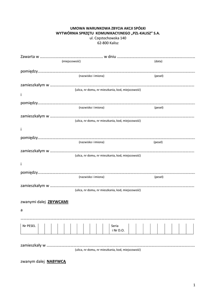 UMOWA WARUNKOWA ZBYCIA AKCJI SPÓŁKI WYTWÓRNIA SPRZĘTU KOMUNIKACYJNEGO „PZL-KALISZ” S.A. ul. Częstochowska 140 62-800 Kalisz Zawarta w ……………………………………………………… w dniu …………………………………………………………………… (miejscowość) (data) pomiędzy…………………………………………………………………………………………………………………………………………. (nazwisko i imiona) (pesel) zamieszkałym w ……………………………………………………………………………………………………………………………… (ulica, nr domu, nr mieszkania, kod, miejscowość) i pomiędzy…………………………………………………………………………………………………………………………………………. (nazwisko i imiona) (pesel) zamieszkałym w ……………………………………………………………………………………………………………………………… (ulica, nr domu, nr mieszkania, kod, miejscowość) i pomiędzy…………………………………………………………………………………………………………………………………………. (nazwisko i imiona) (pesel) zamieszkałym w ……………………………………………………………………………………………………………………………… (ulica, nr domu, nr mieszkania, kod, miejscowość) i pomiędzy…………………………………………………………………………………………………………………………………………. (nazwisko i imiona) (pesel) zamieszkałym w ……………………………………………………………………………………………………………………………… (ulica, nr domu, nr mieszkania, kod, miejscowość) zwanymi dalej ZBYWCAMI a ………………………………………………………………………………………………………………………………………………………… Nr PESEL Seria i Nr D.O. zamieszkały w …………………………………………………………………………………………………………………………………. (ulica, nr domu, nr mieszkania, kod, miejscowość) zwanym dalej NABYWCĄ 1 Oświadczenie ZBYWCY §1 Zbywca oświadcza, że zgodnie z wpisem w Księdze Akcyjnej Spółki działającej pod firmą Wytwórnia Sprzętu Komunikacyjnego „PZL-KALISZ” S.A., z siedzibą w Kaliszu, adres ul. Częstochowska 140, 62-800 Kalisz, wpisanej do rejestru przedsiębiorców prowadzonego przez Sąd Rejonowy Poznań Nowe Miasto i Wilda w Poznaniu, IX Wydział Gospodarczy Krajowego Rejestru Sądowego pod nr KRS 0000071223, zwanej dalej „Spółką”, jest akcjonariuszem Spółki posiadającym …………………………………… akcji imiennych serii A o numerach kolejnych: od do o wartości nominalnej 10 (słownie: dziesięć) złotych każda. ZBYCIE AKCJI §2 Zbywca sprzedaje, a Nabywca kupuje …………………………… słownie: ………………………………………………………………………….. akcji imiennych serii A o numerach kolejnych: od do za łączną cenę …………………………………………………………………….zł., słownie:………………………………………….………………………………………………………………, tj. po………………zł., słownie: …………………………………………………………………………………………………………, za każdą akcję. Zbywca oświadcza, że jemu wyłącznie przysługuje prawo rozporządzania akcjami, o których mowa w ust. 1, akcje są opłacone, są wolne od wszelkich wad prawnych, nie są obciążone prawami osób trzecich, a ponadto, że na zbycie tych akcji jest wymagana zgoda Spółki, którą Zbywca uzyskał. §3 Nabywca oświadcza, że akcje nabywa ze środków pochodzących z majątku odrębnego*/ z majątku wspólnego* i on będzie akcjonariuszem Spółki. §4 Zbywca wydaje Nabywcy dokument akcji (odcinek zbiorowy akcji), o których mowa w § 2 a Nabywca niniejszym kwituje ich odbiór. Zbywca niniejszym kwituje odbiór kwoty, o której mowa w § 2. Wraz z wydaniem akcji na Nabywcę przechodzą wszelkie prawa i obowiązki z tych akcji. §5 Strony zgodnie wnoszą do Zarządu Spółki o dokonanie zmiany w Księdze akcyjnej i wykreślenie Zbywcy jako akcjonariusza z akcji, o których mowa w § 2 umowy i wpisanie w jego miejsce Nabywcy. „Wniosek o dokonanie wpisu w Księdze akcyjnej Wytwórni Sprzętu Komunikacyjnego „PZL-KALISZ” S.A. stanowi załącznik do niniejszej umowy. 2 §6 Koszty związane z zawarciem niniejszej umowy ponosi Nabywca*/Zbywca*. §7 Wszelkie zmiany niniejszej umowy wymagają zachowania formy pisemnej pod rygorem nieważności. §8 Umowa wchodzi w życie w przypadku nie skorzystania przez Spółkę z prawem pierwokupu lub wyrażenia zgody przez Zarząd Spółki na zbycie akcji. §9 Umowę sporządzono w trzech jednobrzmiących egzemplarzach, z których po jednym egzemplarzu otrzymuje każda ze stron, a jeden egzemplarz przeznaczony jest dla Spółki. …………………………………………. ……………………………………….. …………………………………………. ……………………………………….. ……………………………………… Nabywca Zbywca(y) ________________________________ *niepotrzebne skreślić 3