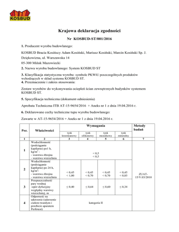Krajowa deklaracja zgodności Nr KOSBUD-ST/001/2016 1. Producent wyrobu budowlanego: KOSBUD Bracia Kosińscy Adam Kosiński, Mariusz Kosiński, Marcin Kosiński Sp. J. Dziękowizna, ul. Warszawska 14 05-300 Mińsk Mazowiecki 2. Nazwa wyrobu budowlanego: System KOSBUD ST 3. Klasyfikacja statystyczna wyrobu: symbole PKWiU poszczególnych produktów wchodzących w skład systemu KOSBUD ST. 4. Przeznaczenie i zakres stosowania: Zestaw wyrobów do wykonywania ociepleń ścian zewnętrznych budynków systemem KOSBUD ST. 5. Specyfikacja techniczna (dokument odniesienia) Aprobata Techniczna ITB AT-15-9654/2016 + Aneks nr 1 z dnia 19.04.2016 r. 6. Deklarowane cechy techniczne tupu wyrobu budowlanego: Zawarte w AT-15-9654/2016 + Aneks nr 1 z dnia 19.04.2016 r. Wymagania Poz. Właściwości 1 2 Wodochłonność (podciąganie kapilarne) po1 h, kg/m2 : - warstwa zbrojna - warstwa wierzchnia Wodochłonność (podciąganie kapilarne) po 24 h, kg/m2: - warstwa zbrojna - warstwa wierzchnia Przepuszczalność pary wodnej -opór dyfuzyjny względny warstwy wierzchniej, m Odporność na uderzenie (uderzenie ciałem twardym i przebicie aparatem Perfotest) 1 2 3 4 Metody badań tynk krzemianowy tynk silikonowy tynk mozaikowy tynk mineralny 3 4 5 6 7 < 0,5 < 0,5 < 0,45 < 1,00 < 0,45 < 0,70 < 0,45 < 0,70 < 0,45 < 0,85 ≤ 0,40 ≤ 0,64 ≤ 0,60 ≤ 0,34 kategoria II ZUAT15/V.03/2010 5 6 7* 8 Mrozoodporność warstwy wierzchniej brak zniszczeń: rys, uszkodzeń, odspojeń i spęcherzeń Przyczepność warstwy wierzchniej do styropianu, MPa, po badaniu na próbkach: - w warunkach laboratoryjnych - po cyklach mrozoodporności - po starzeniu Klasyfikacja w zakresie rozprzestrzeniania ognia przez ściany przy działaniu ognia od strony elewacji Odporność na obciążenie wiatrem ZUAT15/V.03/2010 ≥ 0,08 ≥ 0,08 ≥ 0,08 Nierozprzestrzeniające ognia – NRO PN-B02867:1990 ETAG 004 ETAG 004 *) Klasyfikacja ogniowa dotyczy układów ociepleniowych na podłożach niepalnych (co najmniej klasy A2-s3, d0 reakcji na ogień według normy PN-EN 13501-1+A1 2010) 7. Nazwa i numer akredytowanej jednostki certyfikującej i/lub laboratorium oraz numer certyfikatu i/lub raportu z badań typu (jeżeli taka jednostka brała udział w zastosowanym systemie oceny zgodności): Instytut Ceramiki i Materiałów Budowlanych Oddział Szkła i Materiałów Budowlanych w Krakowie AC 086 przeprowadził certyfikację w systemie 2+ i wydał certyfikat ZKP NR 76/10-ZKP-072-03. Deklarujemy z pełną odpowiedzialnością, że zestaw wyrobów budowlanych wchodzących w skład systemu KOSBUD ST jest zgodny ze specyfikacją techniczną wykazaną w pkt.5 Dziękowizna, dnia 18.05.2016 r. (miejsce i data wystawienia) .