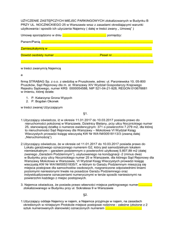 UŻYCZENIE ZASTĘPCZYCH MIEJSC PARKINGOWYCH zlokalizowanych w Budynku B PRZY UL. NOCZNICKIEGO 25 w Warszawie wraz z zasadami określającymi warunki użytkowania i sposób ich użyczenia Najemcy ( dalej w treści zwany „ Umową” ) Umowę sporządzono w dniu ………………………………….. pomiędzy: Panem/Panią ………………………………………………………………………………………….. Zamieszkałym/ą w …………………………………………………………………………………… Dowód osobisty numer ……………………………………Pesel nr………………………………., …………………………………………………………………………………………………………… w treści zwanym/ą Najemcą a firmą STRABAG Sp. z o.o. z siedzibą w Pruszkowie, adres: ul. Parzniewska 10, 05-800 Pruszków, Sąd Rejonowy dla m. st. Warszawy XIV Wydział Gospodarczy Krajowego Rejestru Sądowego, numer KRS 0000054588, NIP 521-04-21-928, REGON 010676681 w imieniu, której działa: 1. P. Katarzyna Grona Wypych 2. P. Bogdan Okonek w treści zwanej Użyczającym §1. 1.Użyczający oświadcza, iż w okresie 11.01.2017 do 10.03.2017 posiada prawo do nieruchomości położonej w Warszawie, Dzielnicy Bielany, przy ulicy Nocznickiego numer 25, stanowiącej działkę o numerze ewidencyjnym: 371 o powierzchni 7.279 m2, dla której to nieruchomości Sąd Rejonowy dla Warszawy – Mokotowa VI Wydział Ksiąg Wieczystych prowadzi księgę wieczystą KW Nr WA1M/00518113/3 (zwaną dalej „Nieruchomością”). 2.Użyczający oświadcza, że w okresie od 11.01.2017 do 10.03.2017 posiada prawo do Lokalu garażowego oznaczonego numerem G2, który jest samodzielnym lokalem niemieszkalnym – garażem podziemnym o powierzchni użytkowej 5.807,89 m2 (dalej zwanego „Garażem Podziemnym”), usytuowanego na kondygnacji -2 (minus dwa) w Budynku przy ulicy Nocznickiego numer 25 w Warszawie, dla którego Sąd Rejonowy dla Warszawy Mokotowa w Warszawie, VI Wydział Ksiąg Wieczystych prowadzi księgę wieczystą KW Nr WA1M/00531835/7, w którym to Garażu Podziemnym mieszczą się miejsca postojowe dla samochodów osobowych, rozgraniczone odpowiednimi liniami poziomymi naniesionymi trwale na posadzce Garażu Podziemnego oraz indywidualizowane oznaczeniami numerycznymi w tenże sposób naniesionymi na powierzchni każdego z miejsc postojowych. 3. Najemca oświadcza, że posiada prawo własności miejsca parkingowego numer…………. zlokalizowanego w Budynku przy ul. Sokratesa 9 w Warszawie §2. 1.Użyczający oddaje Najemcy w najem, a Najemca przyjmuje w najem, na zasadach określonych w niniejszym Protokole miejsce postojowe rodzinne - zależne (złożone z 2 sztuk numerowanych stanowisk) oznaczonych numerem ……………………………. położone w Garażu Podziemnym (dalej zwane łącznie „Miejscem Parkingowym”), zaznaczone na rzucie kondygnacji stanowiącym Załącznik nr 1 do Protokołu. 2. Użyczający zapewnia Najemcy swobodny dostęp do Przedmiotu Najmu. 3.Najemca oświadcza, że nie wnosi zastrzeżeń, co do stanu technicznego Przedmiotu użyczenia. §3. Umowa sporządzona została na czas oznaczony, tj. od dnia 11/01/2017 roku do dnia 10/03/2017 roku. §4. Prawo do korzystania z Przedmiotu użyczenia przysługuje Najemcy w okresie od dnia 11.01.2017 do 10.03.2017 r. §5. Najemca zobowiązany jest do zwrotu Użyczającemu Miejsca parkingowego najpóźniej na jeden dzień przed upływem terminu obowiązywania Umowy Najmu obowiązywania Umowy Najmu, w stanie niepogorszonym, z uwzględnieniem zużycia będącego następstwem prawidłowego użytkowania Najemcy. Ponadto, Najemca zobowiązuje się zwrócić Wynajmującemu koszty wszelkich napraw, koniecznych z powodu działalności Najemcy w Przedmiocie Najmu. Ze zwrotu Przedmiotu użyczenia strony sporządzą protokół zdawczo-odbiorczy, zawierający opis napraw, jakie Najemca zobowiązany będzie przeprowadzić w celu doprowadzenia go do odpowiedniego stanu. Najemca powinien przeprowadzić naprawy wynikające z protokołu we własnym zakresie i na własny koszt, w terminie określonym w protokole. §6. Użyczający zastrzega sobie możliwość rozwiązania Umowy Najmu w trybie natychmiastowym, tj. bez zachowania terminów wypowiedzenia, jeżeli Najemca: a) używa Przedmiotu Najmu w sposób niezgodny z jego przeznaczeniem, zwłaszcza powodując jego zniszczenie lub uszkodzenie, w tym jego wyposażenia, urządzeń technicznych i instalacji, b) używa Przedmiotu Najmu w sposób niezgodny z obowiązującymi przepisami prawa, c) oddaje Przedmiot Najmu w podnajem lub do bezpłatnego używania osobom trzecim bez pisemnej zgody Użyczającego, d) zakłóca swoją działalnością normy współżycia z innymi najemcami i współwłaścicielami Garażu Podziemnego, e) §7. 1.Użyczający przekaże Przedmiot Najmu Najemcy w terminie do dnia ……………………… z tym jednak zastrzeżeniem, że nie może to nastąpić później jak do dnia 12.01.2017r. Przez datę przekazania Przedmiotu Najmu rozumie się datę podpisania przez obie strony protokołu zdawczo-odbiorczego. 2.Strony postanawiają, iż wraz z przekazaniem Przedmiotu Najmu Użyczający przekaże Najemcy 1 chip umożliwiający dostępu do budynku oraz 1 pilot do bramy wjazdowej do Garażu Podziemnego. 3.Strony postanawiają, iż w przypadku zniszczenia lub utraty któregokolwiek z wymienionych w ust. 2 powyżej pilotów, lub chipów, Najemca zobowiązany będzie do zapłaty na rzecz Użyczającego następujących kwot: 22 zł – w przypadku utraty jednego chipa , 173 zł – w przypadku utraty jednego pilota, na co Najemca niniejszym wyraża zgodę. 4.W przypadku rozwiązania niniejszej Umowy, Najemca wraz ze zwrotem Przedmiotu Najmu zobowiązany jest do zwrotu Wynajmującemu pilotów oraz chipów w ilości określonej w ust. 2 powyżej w stanie niepogorszonym. §8. 1.Najemca zobowiązuje się prz