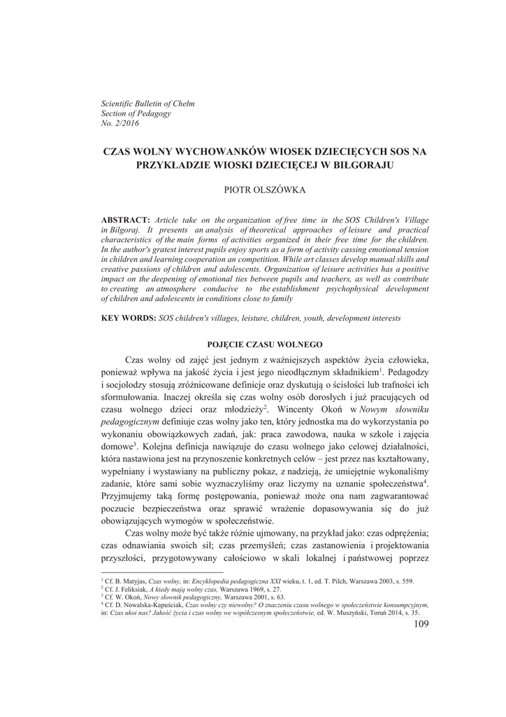 Scientific Bulletin of Chełm Section of Pedagogy No. 2/2016 CZAS WOLNY WYCHOWANKÓW WIOSEK DZIECIĘCYCH SOS NA PRZYKŁADZIE WIOSKI DZIECIĘCEJ W BIŁGORAJU PIOTR OLSZÓWKA ABSTRACT: Article take on the organization of free time in the SOS Children's Village in Bilgoraj. It presents an analysis of theoretical approaches of leisure and practical characteristics of the main forms of activities organized in their free time for the children. In the author's gratest interest pupils enjoy sports as a form of activity cassing emotional tension in children and learning cooperation an competition. While art classes develop manual skills and creative passions of children and adolescents. Organization of leisure activities has a positive impact on the deepening of emotional ties between pupils and teachers, as well as contribute to creating an atmosphere conducive to the establishment psychophysical development of children and adolescents in conditions close to family KEY WORDS: SOS children's villages, leisture, children, youth, development interests POJĘCIE CZASU WOLNEGO Czas wolny od zajęć jest jednym z ważniejszych aspektów życia człowieka, ponieważ wpływa na jakość życia i jest jego nieodłącznym składnikiem1. Pedagodzy i socjolodzy stosują zróżnicowane definicje oraz dyskutują o ścisłości lub trafności ich sformułowania. Inaczej określa się czas wolny osób dorosłych i już pracujących od czasu wolnego dzieci oraz młodzieży2. Wincenty Okoń w Nowym słowniku pedagogicznym definiuje czas wolny jako ten, który jednostka ma do wykorzystania po wykonaniu obowiązkowych zadań, jak: praca zawodowa, nauka w szkole i zajęcia domowe3. Kolejna definicja nawiązuje do czasu wolnego jako celowej działalności, która nastawiona jest na przynoszenie konkretnych celów – jest przez nas kształtowany, wypełniany i wystawiany na publiczny pokaz, z nadzieją, że umiejętnie wykonaliśmy zadanie, które sami sobie wyznaczyliśmy oraz liczymy na uznanie społeczeństwa4. Przyjmujemy taką formę postępowania, ponieważ może ona nam zagwarantować poczucie bezpieczeństwa oraz sprawić wrażenie dopasowywania się do już obowiązujących wymogów w społeczeństwie. Czas wolny może być także różnie ujmowany, na przykład jako: czas odprężenia; czas odnawiania swoich sił; czas przemyśleń; czas zastanowienia i projektowania przyszłości, przygotowywany całościowo w skali lokalnej i państwowej poprzez 1 Cf. B. Matyjas, Czas wolny, in: Encyklopedia pedagogiczna XXI wieku, t. 1, ed. T. Pilch, Warszawa 2003, s. 559. Cf. J. Feliksiak, A kiedy mają wolny czas, Warszawa 1969, s. 27. 3 Cf. W. Okoń, Nowy słownik pedagogiczny, Warszawa 2001, s. 63. 4 Cf. D. Nowalska-Kapuściak, Czas wolny czy niewolny? O znaczeniu czasu wolnego w społeczeństwie konsumpcyjnym, in: Czas ukoi nas? Jakość życia i czas wolny we współczesnym społeczeństwie, ed. W. Muszyński, Toruń 2014, s. 35. 2 109 zakłady i instytucje mające za celu dobro jednostki jak też ogółu; czas gromadzenia siły do ciągłego postępu oraz czynności ideowych wraz z obywatelskimi5. Już od najmłodszych lat, kiedy dziecko uczy się życia i funkcjonowania w społeczeństwie, ważne jest prezentowanie wzorów i form takiego spędzania czasu wolnego, które stałoby się istotną częścią życia. Wówczas dziecko najszybciej przyswaja i stosuje docierające do niego komunikaty, a także reaguje na przeróżne bodźce6. Wincenty Okoń w Nowym Słowniku Pedagogicznym wymienia następujące formy wykorzystania czasu wolnego: wypoczynek, czyli regeneracja sił fizycznych i psychicznych; rozrywka sprawiająca przyjemność; działalność społeczna mająca charakter bezinteresowny i dobrowolny; rozwój zainteresowań i uzdolnień; zdobywanie wiedzy oraz amatorska działalność artystyczna, naukowa, techniczna, sportowa7. Z kolei Krzysztof Przecławski podzielił sposoby spędzania czasu wolnego na sześć kategorii: 1. „Związane z przyjętymi na siebie obowiązkami: dokształcania, pomocy rodzinie, działalności organizacyjno-społecznej i religijnej; 2. Związane z aktywnością podmiotu w dziedzinie: artystycznej, technicznej, sportu i rekreacji fizycznej, turystyki; 3. Związane z uczestnictwem w kulturze: w formie odbioru środków masowego przekazu (TV, radio, prasa, książki, kino), w formie korzystania z teatru, koncertów, imprez artystycznych itd.; 4. Związane z uczestnictwem w życiu społecznym (przede wszystkim w grupach nieformalnych): przebywanie z sympatią (współmałżonkiem), spacery z kolegami, uczęszczanie do kawiarni, spotkania towarzyskie itp., oglądanie imprez sportowych; 5. Związane z realizacją indywidualnych zamiłowań: różnego rodzaju hobby, uprawianie działki itp., bierny odpoczynek; 6. Zachowania o charakterze patologii społecznej (nałogowe picie alkoholu, narkomania, nadużycia seksualne, przestępczość)”8. Podczas planowania czasu wolnego ważne jest zwrócenie uwagi na jego racjonalne i rozsądne wykorzystanie. To szczególnie istotne w relacjach z dziećmi, które powinny otrzymywać pozytywne wzorce do naśladowania. Jest wiele możliwości, w jaki sposób urozmaicić czas wolny – od wszelkiego rodzaju zabaw, samokształcenia, aż do rozwijania swoich pasji. Formy organizowania czasu wolnego mają służyć przede wszystkim zapewnieniu wypoczynku i rozrywki9. 5 Cf. J. Z. Górnikiewicz, Atrakcyjność form spędzania czasu wolnego- opcje młodzieży studiującej, in: Czas ukoi nas? Jakość życia i czas wolny we współczesnym społeczeństwie,ed. W. Muszyński, Toruń 2014, s. 138. 6 Ibidem, s. 123. 7 Cf. W. Okoń, op. cit., s. 63. 8 K. Przecławski, Czas wolny młodzieży miejskiej, in: Czas wolny dzieci i młodzieży w Polsce, ed. K. Przecławski, Warszawa 1978, s. 54. 9 Cf. P. Mazur, Pedagogika wobec problemów socjalnych i patologii społecznych – z doświadczeń ośrodka „Oratorium św. Jana Bosco” w Soli, w: Rodziny problemowe i moż