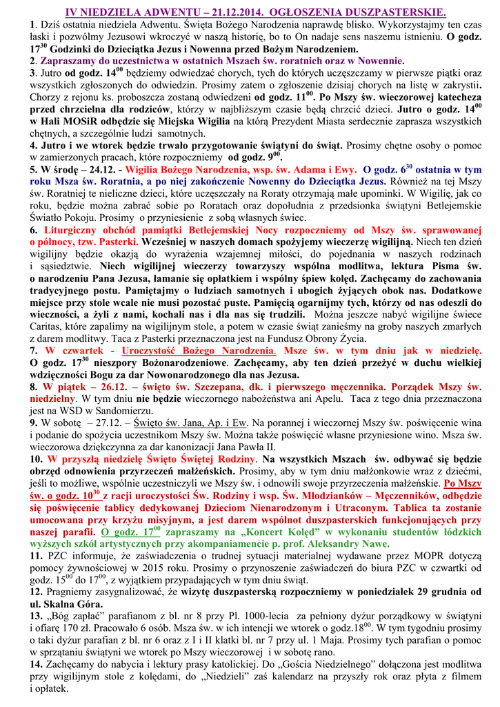 iv niedziela adwentu – 21.12.2014. ogłoszenia duszpasterskie.