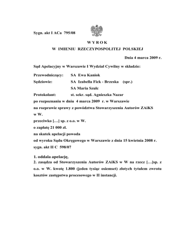 Sygn. akt I ACa 795/08 WYROK W IMIENIU RZECZYPOSPOLITEJ POLSKIEJ Dnia 4 marca 2009 r. Sąd Apelacyjny w Warszawie I Wydział Cywilny w składzie: Przewodniczący: SA Ewa Kaniok Sędziowie: SA Izabella Fick - Brzeska (spr.) SA Maria Szulc Protokolant: st. sekr. sąd. Agnieszka Nazar po rozpoznaniu w dniu 4 marca 2009 r. w Warszawie na rozprawie sprawy z powództwa Stowarzyszenia Autorów ZAiKS w W. przeciwko […] sp. z o.o. w W. o zapłatę 21 000 zł. na skutek apelacji powoda od wyroku Sądu Okręgowego w Warszawie z dnia 15 kwietnia 2008 r. sygn. akt II C 598/07 1. oddala apelację, 2. zasądza od Stowarzyszenia Autorów ZAiKS w W na rzecz […]sp. z o.o. w W. kwotę 1.800 (jeden tysiąc osiemset) złotych tytułem zwrotu kosztów zastępstwa procesowego w II instancji. 2 I A Ca 795/08 Uzasadnienie Powód Stowarzyszenie Autorów Zaiks wniósł o zasądzenie od pozwanego […] Spółki z ograniczona odpowiedzialnością w W. o zasądzenie na swoją rzecz kwoty 21 000 zł tytułem zapłaty tantiem za wystawienie w dniu […] sierpnia 2006 r. przedstawienie plenerowe utworu „[…]”, do którego choreografię opracował J. J. Wskazano, że pozwany naruszył autorskie prawa majątkowe wystawiając przedstawienie bez licencji. W oparciu o zatwierdzone tabele stawka za 1 minutę choreografii w utworze wynosi 0,1 % dochodu brutto, a czas jej trwania wynosił 20 minut i w takim zakresie zostało ustalone wynagrodzenie. Pozwany wniósł o oddalenie powództwa zarzucając wadliwe wyliczenie dochodzonego roszczenia, gdyż łączny przychód brutto wyniósł 638 000 zł., a z tego żądane 2 % wynosi 12 770 zł. Podniesiono także, że powód nie mógł udzielić wcześniej licencji, gdyż utwór powstał jako całość dopiero w dniu jego prezentacji, a ochrona powinna obejmować całość praw do utworu, bez podziału i wyodrębniania oddzielnie należności za choreografię. W dniu 25 stycznia 2008 r. powód ograniczył żądanie do kwoty 12 770 zł i cofnął powództwo w pozostałej części, na co wyraziła zgodę strona pozwana. Wyrokiem z dnia 15 kwietnia 2008 r. Sąd Okręgowy w Warszawie umorzył postępowanie w części dotyczącej zasądzenia kwoty 8 300 zł, oddalił powództwo w pozostałej części oraz zasądził od powoda na rzecz pozwanego 2 400 zł tytułem zwrotu kosztów zastępstwa procesowego. 3 Powyższy wyrok zapadł po dokonaniu przez Sąd następujących ustaleń i rozważań: W dniu […] sierpnia 2006 r. w P. pozwany był organizatorem widowiska plenerowego pod tytułem „[…]”, którego autorem muzyki był R. W., a autorem libretta E. R.-G. Choreografia w całości powstała na zamówienie pozwanego, na podstawie umowy zawartej z J. J. i została ona ukończona w dniu premiery. Umowa zawarta została w dniu […] listopada 2005 r. i zawierała szczegółowy zakres czynności oraz terminy wykonania. J. J. w dniu […] marca 1998 r. podpisał zobowiązanie organizacyjne, oddając pod ochronę powoda ochronę swych autorskich praw majątkowych już istniejących oraz powstałych w przyszłości w okresie jego przynależności do stowarzyszenia. Przed wystawieniem widowiska plenerowego pozwany poinformował powoda o zamiarze wystawienia widowiska oraz wniósł o udzielenie licencji. Zgodnie z ustaleniami z przedstawicielami kompozytora opery, miała być podpisana umowa określająca wysokość należnych tantiem za wystawienie całego widowiska. Wszelkie płatności na rzecz kompozytora i autora libretta miały być płatne za pośrednictwem polskiej organizacji. Wysokość stawki za tzw. wielkie prawa do wystawienia opery została określona na 15 % uzyskiwanych z tego tytułu wpływów. Zgodnie z zatwierdzoną tabelą Zaiks, wysokość tantiemy za tzw. prawa do opery wynosi 11 %. Powód nie ma podpisanej umowy o reprezentacji w ramach tzw. wielkich praw z Wielką Brytania, skąd pochodzą autorzy muzyki i libretta. Po wystawieniu widowiska w P. z choreografią J. J. powód wezwał pozwanego do zapłaty tantiem w wysokości 0,1 % wpływów za każdą 4 minutę, łącznie 2 %. Strony nie porozumiały się w tym zakresie. Pozwany proponował zapłatę całej kwoty 15 %. Roszczenie powoda oparte jest o treść przepisu art. 79 ustawy z dnia 4 lutego 1994 r. o prawie autorskim i prawach pokrewnych ( Dz. U. Nr 90 z 2006 r., poz. 631 ze zm.), z którego brzmienia wynika obowiązek naprawienia szkody, który może być realizowany przez zapłatę stosownego wynagrodzenia w wypadku naruszenia autorskich praw majątkowych. Kwestią więc zasadniczą w niniejszym sporze pozostawało czy pozwany swoim działaniem naruszył autorskie prawa majątkowe uzasadniające wyrównanie uszczerbku przez zapłatę co najmniej stosownego wynagrodzenia. Ustawa o prawie autorskim wymaga od korzystającego z utworu zawarcia umowy na korzystanie z autorskich praw twórców (licencji) a eksploatacja jest dopuszczalna na polach eksploatacji wyraźnie w umowie wskazanych (art. 41 ust. 2). W ocenie Sadu z przedstawionego przez strony materiału dowodowego wynika, że pozwany jako producent widowiska plenerowego, opartego na napisanej przez R. W. operze „[…]” zawarł z J. J. umowę o dzieło, której przedmiotem było zaangażowanie go jako autora reżyserii i choreografii widowiska plenerowego. Umowa precyzowała zakres obowiązków wykonawcy, jego wynagrodzenie oraz terminy oddania dzieła. Z treści umowy nie wynikają wprost uzgodnienia stron w zakresie korzystania z autorskich praw majątkowych J. J. do zamówionej choreografii. Była to umowa producencka i całość praw do powstałego utworu jako całości przysługuje pozwanemu, natomiast J. J. jest na podstawie tej umowy współtwórcą dzieła. Brak wyraźnych postanowień w zakresie udzielenia pozwanemu licencji na publiczne wystawienie spektaklu z dniu […] sierpnia wymaga dokonania 5 wykładni zawartej umowy zgodnie z regułami przewidzianymi art. 65 kc. Z treści tej umowy oraz z ustalonych okoliczności faktycznych wynika,
