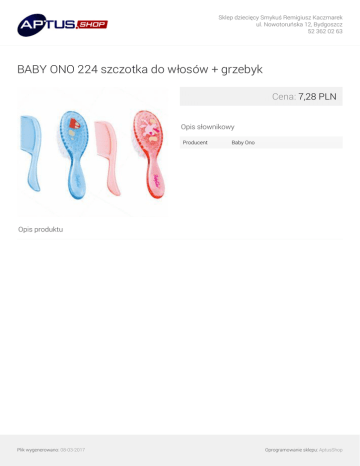 Sklep dziecięcy Smykuś Remigiusz Kaczmarek ul. Nowotoruńska 12, Bydgoszcz 52 362 02 63 BABY ONO 224 szczotka do włosów + grzebyk Cena: 7,28 PLN Opis słownikowy Producent Baby Ono Opis produktu Plik wygenerowano: 08-03-2017 Powered by TCPDF (www.tcpdf.org) Oprogramowanie sklepu: AptusShop