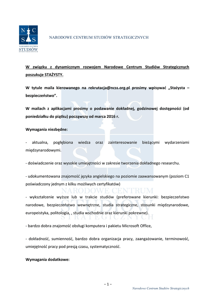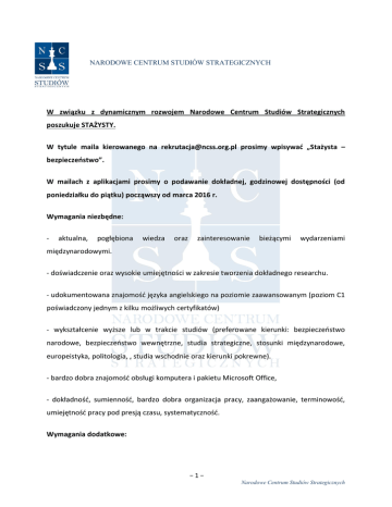 NARODOWE CENTRUM STUDIÓW STRATEGICZNYCH W związku z dynamicznym rozwojem Narodowe Centrum Studiów Strategicznych poszukuje STAŻYSTY. W tytule maila kierowanego na [email protected] prosimy wpisywać „Stażysta – bezpieczeństwo”. W mailach z aplikacjami prosimy o podawanie dokładnej, godzinowej dostępności (od poniedziałku do piątku) począwszy od marca 2016 r. Wymagania niezbędne: - aktualna, pogłębiona wiedza oraz zainteresowanie bieżącymi wydarzeniami międzynarodowymi. - doświadczenie oraz wysokie umiejętności w zakresie tworzenia dokładnego researchu. - udokumentowana znajomość języka angielskiego na poziomie zaawansowanym (poziom C1 poświadczony jednym z kilku możliwych certyfikatów) - wykształcenie wyższe lub w trakcie studiów (preferowane kierunki: bezpieczeństwo narodowe, bezpieczeństwo wewnętrzne, studia strategiczne, stosunki międzynarodowe, europeistyka, politologia, , studia wschodnie oraz kierunki pokrewne). - bardzo dobra znajomość obsługi komputera i pakietu Microsoft Office, - dokładność, sumienność, bardzo dobra organizacja pracy, zaangażowanie, terminowość, umiejętność pracy pod presją czasu, systematyczność. Wymagania dodatkowe: −1− Narodowe Centrum Studiów Strategicznych - pierwsze doświadczenia w pomocy przy realizowacji projektów (pomoc asystencka i organizacyjna). - osiągnięcia naukowe (wystąpienia na konferencja, publikacje) oraz pierwsze teksty i komentarze analityczne czy publicystyczne mile widziane (prosimy o dołączenie ich do maila). - pierwsze doświadczenia w tworzeniu tekstów (lekkie pióro). - wiedza w zakresie związanym ze wspólną polityką zagraniczną i bezpieczeństwa (WPZiB) UE oraz europejską polityką bezpieczeństwa i obrony (EPBiO); wiedza w obszarze związanym z bezpieczeństwem Afryki. Dyspozycyjność: - min. 30 godzin w tygodniu (konkretne dni i godziny do ustalenia) od poniedziałku do piątku w godzinach od 8:00 do 20:00. Do zadań stażysty należało będzie: - wspieranie NCSS przy bieżących działaniach. - pomoc w realizacji projektów oraz wydarzeń. - research analityczny (także po angielsku). - kontakt z podmiotami zewnętrznymi (także po angielsku). - bieżące wspieranie pionu analitycznego. Oferujemy: -symboliczne wynagrodzenie. - staż w jednym w Polsce think tanku zajmującym się obronnością i twardym bezpieczeństwem RP. −2− Narodowe Centrum Studiów Strategicznych - możliwość rozwoju osobistego oraz zebrania doświadczeń w zakresie pomocy przy polskich oraz międzynarodowych projektach. Listy polecające (jeśli je Państwo posiadacie), prosimy o dołączanie skanem do maili z aplikacjami. Pragniemy poinformować, że skontaktujemy się tylko z wybranymi kandydatami. −3− Narodowe Centrum Studiów Strategicznych