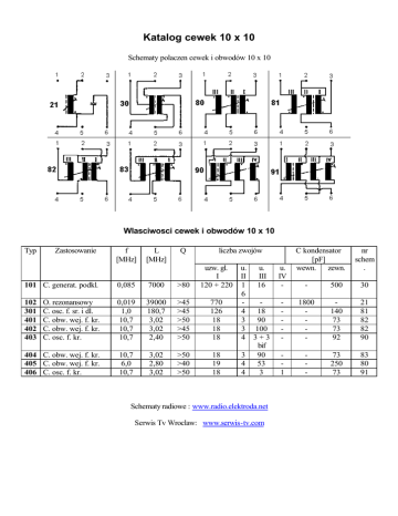 Katalog cewek 10 x 10 Schematy polaczen cewek i obwodów 10 x 10 Wlasciwosci cewek i obwodów 10 x 10 Typ Zastosowanie f [MHz] L [MHz] Q 101 C. generat. podkl. 0,085 7000 >80 102 301 401 402 403 O. rezonansowy C. osc. f. sr. i dl. C. obw. wej. f. kr. C. obw. wej. f. kr. C. osc. f. kr. 0,019 1,0 10,7 10,7 10,7 39000 180,7 3,02 3,02 2,40 >45 >45 >50 >45 >50 404 C. obw. wej. f. kr. 405 C. obw. wej. f. kr. 406 C. osc. f. kr. 10,7 6,0 10,7 3,02 2,80 3,02 >50 >40 >50 liczba zwojów uzw. gl. u. u. I II III 120 + 220 1 16 6 770 126 4 18 18 3 90 18 3 100 18 4 3+3 bif 18 3 90 19 4 53 18 4 3 Schematy radiowe : www.radio.elektroda.net Serwis Tv Wroclaw: www.serwis-tv.com u. IV - C kondensator [pF] wewn. zewn. nr schem . - 500 30 - 1800 - 140 73 73 92 21 81 82 82 90 1 - 73 250 73 83 80 91