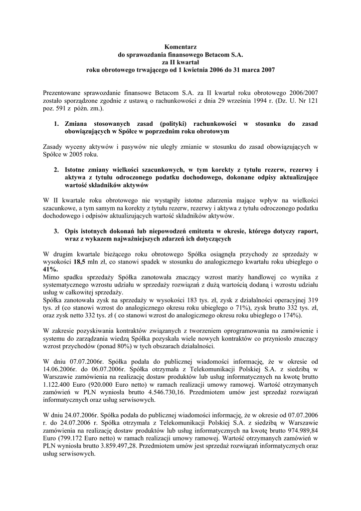 Komentarz do sprawozdania finansowego Betacom S.A. za II kwartał roku obrotowego trwającego od 1 kwietnia 2006 do 31 marca 2007 Prezentowane sprawozdanie finansowe Betacom S.A. za II kwartał roku obrotowego 2006/2007 zostało sporządzone zgodnie z ustawą o rachunkowości z dnia 29 września 1994 r. (Dz. U. Nr 121 poz. 591 z późn. zm.). 1. Zmiana stosowanych zasad (polityki) rachunkowości obowiązujących w Spółce w poprzednim roku obrotowym w stosunku do zasad Zasady wyceny aktywów i pasywów nie uległy zmianie w stosunku do zasad obowiązujących w Spółce w 2005 roku. 2. Istotne zmiany wielkości szacunkowych, w tym korekty z tytułu rezerw, rezerwy i aktywa z tytułu odroczonego podatku dochodowego, dokonane odpisy aktualizujące wartość składników aktywów W II kwartale roku obrotowego nie wystąpiły istotne zdarzenia mające wpływ na wielkości szacunkowe, a tym samym na korekty z tytułu rezerw, rezerwy i aktywa z tytułu odroczonego podatku dochodowego i odpisów aktualizujących wartość składników aktywów. 3. Opis istotnych dokonań lub niepowodzeń emitenta w okresie, którego dotyczy raport, wraz z wykazem najważniejszych zdarzeń ich dotyczących W drugim kwartale bieżącego roku obrotowego Spółka osiągnęła przychody ze sprzedaży w wysokości 18,5 mln zł, co stanowi spadek w stosunku do analogicznego kwartału roku ubiegłego o 41%. Mimo spadku sprzedaży Spółka zanotowała znaczący wzrost marży handlowej co wynika z systematycznego wzrostu udziału w sprzedaży rozwiązań z dużą wartością dodaną i wzrostu udziału usług w całkowitej sprzedaży. Spółka zanotowała zysk na sprzedaży w wysokości 183 tys. zł, zysk z działalności operacyjnej 319 tys. zł (co stanowi wzrost do analogicznego okresu roku ubiegłego o 71%), zysk brutto 332 tys. zł, oraz zysk netto 332 tys. zł ( co stanowi wzrost do analogicznego okresu roku ubiegłego o 174%). W zakresie pozyskiwania kontraktów związanych z tworzeniem oprogramowania na zamówienie i systemu do zarządzania wiedzą Spółka pozyskała wiele nowych kontraktów co przyniosło znaczący wzrost przychodów (ponad 80%) w tych obszarach działalności. W dniu 07.07.2006r. Spółka podała do publicznej wiadomości informację, że w okresie od 14.06.2006r. do 06.07.2006r. Spółka otrzymała z Telekomunikacji Polskiej S.A. z siedzibą w Warszawie zamówienia na realizację dostaw produktów lub usług informatycznych na kwotę brutto 1.122.400 Euro (920.000 Euro netto) w ramach realizacji umowy ramowej. Wartość otrzymanych zamówień w PLN wyniosła brutto 4.546.730,16. Przedmiotem umów jest sprzedaż rozwiązań informatycznych oraz usług serwisowych. W dniu 24.07.2006r. Spółka podała do publicznej wiadomości informację, że w okresie od 07.07.2006 r. do 24.07.2006 r. Spółka otrzymała z Telekomunikacji Polskiej S.A. z siedzibą w Warszawie zamówienia na realizację dostaw produktów lub usług informatycznych na kwotę brutto 974.989,84 Euro (799.172 Euro netto) w ramach realizacji umowy ramowej. Wartość otrzymanych zamówień w PLN wyniosła brutto 3.859.497,28. Przedmiotem umów jest sprzedaż rozwiązań informatycznych oraz usług serwisowych. W dniu 11.08.2006r. Spółka podała do publicznej wiadomości informację, o podpisaniu w dniu 10 sierpnia 2006r.umowy z Kancelarią Sejmu z siedzibą w Warszawie. Przedmiotem umowy jest świadczenie usług informatycznych dla biur poselskich przez okres 4 lat na łączną kwotę brutto wynoszącą 9.026.780,00 zł. Zabezpieczeniem należytego wykonania umowy jest gwarancja bankowa w wysokości 5% łącznego wynagrodzenia brutto Betacom S.A. tj. w kwocie 451.339,00 zł. W dniu 21.08.2006r. Spółka podała do publicznej wiadomości informację, o podpisaniu w dniu 18 sierpnia 2006r. umowy przez „Konsorcjum Betacom S.A. (partner Konsorcjum) i Instytutu Edukacji Interaktywnej estakada.pl sp. z o.o. (lider Konsorcjum).” z Polską Agencją Rozwoju Przedsiębiorczości (Zamawiający) z siedzibą w Warszawie. Przedmiotem umowy jest realizacja projektu Akademia PARP polegającego na realizacji usług szkoleniowych tradycyjnych i elearningowych dla małych i średnich przedsiębiorców. Łączna wartość umowy wynosi brutto 14.200.000 zł, z czego na Betacom S.A. przypada kwota brutto 4.018.503,40 zł. Termin realizacji umowy określony został do 31 grudnia 2007r. Zabezpieczeniem należytego wykonania umowy jest gwarancja ubezpieczeniowa bankowa wniesiona przez Betacom S.A. w wysokości 2% łącznego wynagrodzenia brutto w kwocie 284.000 zł. W dniu 05.09.2006r. Spółka podała do publicznej wiadomości informację, o zawarciu umowy z Bankiem BPH z siedzibą w Warszawie na udzielanie gwarancji bankowej na kwotę 4.260.000 PLN z terminem ważności do 31 grudnia 2007r. Beneficjentem gwarancji jest Polska Agencja Rozwoju Przedsiębiorczości a gwarancja stanowi zabezpieczenia zwrotu pierwszej płatności z tytułu zapłaty 30% wartości umowy podpisanej w dniu 18 sierpnia 2006r. przez Konsorcjum Betacom S.A. (partner Konsorcjum) i Instytut Edukacji Interaktywnej estakada pl (lider Konsorcjum) z Polską Agencją Rozwoju Przedsiębiorczości z siedzibą w Warszawie, o której Betacom informował w raporcie bieżącym nr 30/2006. Zabezpieczenie gwarancji stanowi przelew środków pieniężnych i założenie lokaty terminowej na rachunek i własność Banku w wysokości 2.982.000,00 PLN. Zwolnienie zabezpieczeń nastąpi nie wcześniej niż po 15 dniach od terminu ważności gwarancji. W dniu 14.09.2006r. Spółka podała do publicznej wiadomości informację, że otrzymała z Telekomunikacji Polskiej S.A. z siedzibą w Warszawie aneks nr 2 z dnia 14 września 2006 r. do Umowy ramowej z dnia 12 września 2005r.. Aneks zwiększa wartość Umowy ramowej brutto z 9.760.000,00 Euro do kwoty brutto 10.980.000,00 Euro. Wartość brutto zwiększonego wynagrodzenia, przewidzianego w aneksie nr 2 do Umowy ramowej, w PLN wynosi 43.519.230,00 i