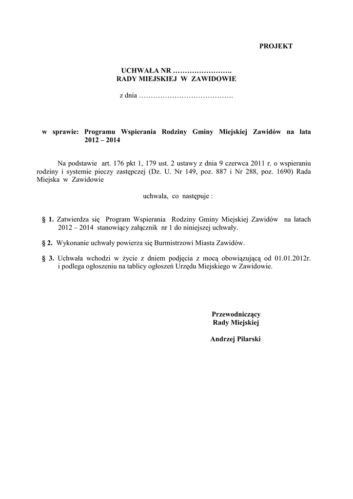 PROJEKT UCHWAŁA NR ……………………. RADY MIEJSKIEJ W ZAWIDOWIE z dnia …………………………………. w sprawie: Programu Wspierania Rodziny Gminy Miejskiej Zawidów na lata 2012 – 2014 Na podstawie art. 176 pkt 1, 179 ust. 2 ustawy z dnia 9 czerwca 2011 r. o wspieraniu rodziny i systemie pieczy zastępczej (Dz. U. Nr 149, poz. 887 i Nr 288, poz. 1690) Rada Miejska w Zawidowie uchwala, co następuje : § 1. Zatwierdza się Program Wspierania Rodziny Gminy Miejskiej Zawidów na latach 2012 – 2014 stanowiący załącznik nr 1 do niniejszej uchwały. § 2. Wykonanie uchwały powierza się Burmistrzowi Miasta Zawidów. § 3. Uchwała wchodzi w życie z dniem podjęcia z mocą obowiązującą od 01.01.2012r. i podlega ogłoszeniu na tablicy ogłoszeń Urzędu Miejskiego w Zawidowie. Przewodniczący Rady Miejskiej Andrzej Pilarski UZASADNIENIE Zgodnie z treścią art. 176 pkt 1 i art. 180 pkt 1 ustawy z dnia 9 czerwca 2011 roku o wspieraniu rodziny i systemie pieczy zastępczej (Dz.U. Nr 149, poz. 887 i Nr 288, poz. 1690) do zadań własnych gminy należy m.in. opracowanie i realizacja trzyletniego gminnego programu wspierania rodziny. Przyjęcie Programu Wspierania Rodziny Gminy Miejskiej Zawidów na lata 2012 – 2014 przewiduje rozwój działań profilaktycznych mających na celu wzmocnienie rodzin z grupy ryzyka, zapobieganie narastania kryzysu poprzez pracę z rodziną naturalną oraz zapewnienie każdemu dziecku prawa do stabilnego, trwałego i rodzinnego środowiska wychowawczego. Zakłada się, iż realizacja programu w kilkuletniej perspektywie ograniczy liczbę dzieci umieszczanych w pieczy zastępczej. Biorąc pod uwagę powyższe, podjęcie niniejszej uchwały jest zasadne. Przewodniczący Rady Miejskiej Andrzej Pilarski Załącznik nr 1 do Uchwały nr …. Rady Miejskiej w Zawidowie z dnia……….. PROGRAM WSPIERANIA RODZINY GMINY MIEJSKIEJ ZAWIDÓW NA LATA 2012 - 2014 I. WSTĘP Rodzina, jako instytucja społeczna jest w kręgu ciągłego zainteresowania wielu naukowców i specjalistów: socjologów, psychologów, pracowników socjalnych, pedagogów oraz wielu innych dziedzin nauki i praktyki. Wszystkie nauki w nieustannych badaniach nad rodziną wypracowały liczne, mniej lub bardziej szczegółowe, definicje określające rodzinę i jej charakter. RODZINA w socjologii rozumiana jako grupa społeczna lub instytucja społeczna. Rodzina, zdaniem socjologów i najprostszych jej definicji, to najważniejsza, podstawowa grupa społeczna, na której opiera się całe społeczeństwo. Każde dziecko do prawidłowego rozwoju potrzebuje rodziny, która zaspokaja jego potrzeby, otacza miłością i zapewnia poczucie bezpieczeństwa. Rodzina oddziałuje na dzieci wg określonych reguł, wg ustalonego planu lub też najzwyczajniej nieświadomie podczas codziennego życia. Efekty dobrego rozwoju dziecka zależą zatem od prawidłowo funkcjonującej rodziny. W przypadku gdy rodzina staje się dysfunkcyjna to dziecko i inni jej członkowie mają prawo do specjalnej ochrony i pomocy państwa. Czynności podejmowane przez instytucje na rzecz dobra dziecka i rodziny muszą być zintegrowane dla osiągnięcia jak najlepszych efektów terapeutycznych. Dziecko powinno mieć możliwość do zachowania swojej tożsamości i do utrzymywania kontaktów z rodzicami. Działania na rzecz rodziny wynikają bezpośrednio z aktów prawnych, m.in.: - ustawa z dnia 12 marca 2004r o pomocy społecznej (Dz. U. z 2009 r Nr 175, poz. 1362 ze zm.), - ustawa z dnia 29 lipca 2005r o przeciwdziałaniu przemocy w rodzinie (Dz. U. z 2009 r., Nr 180, poz. 1493 ze zm.), - ustawa z dnia 9 czerwca 2011r o wspieraniu rodziny i systemie pieczy zastępczej (Dz. U. Nr 149, poz. 887 ze zm.), - ustawa z dnia 28 listopada 2003r o świadczeniach rodzinnych (Dz. U. z 2006 r., Nr 139, poz. 992 ze zm.), - ustawa z dnia 7 września 2007r o pomocy osobom uprawnionym do alimentów (Dz. U z 2009 r., Nr 1, poz. 7 ze zm.), - ustawa z dnia 26 października 1982r o wychowaniu w trzeźwości i przeciwdziałaniu alkoholizmowi (Dz. U. z 2007 r., Nr 70, poz. 473 ze zm.). Miejski Ośrodek Pomocy Społecznej w Zawidowie w ramach pracy socjalnej udziela swoim klientom pomocy w realizacji podstawowych funkcji rodziny i wspiera w wypełnianiu zadań wychowawczych mając zawsze na względzie dobro dzieci. Do tego celu na początku roku 2012 powołano stanowisko asystenta rodziny, którego zadaniem jest praca z rodziną za jej zgodą i z jej aktywnym udziałem wg wcześniej ustalonego planu pracy z rodziną. Praca z rodziną jest prowadzona także w przypadku czasowego umieszczenia dziecka poza rodziną w pieczy zastępczej. Praca asystenta z wybraną rodziną jest prowadzona do momentu osiągnięcia przez tę rodzinę stabilizacji życiowej umożliwiającej podstawowe wypełnianie obowiązków wobec małoletnich dzieci. W momencie gdy pomoc instytucjonalna w danym środowisku rodzinnym nie daje zadawalających efektów decyzją sądu dziecko umieszczane jest w pieczy zastępczej, powiat (PCPR w Zgorzelcu) koordynuje poszukiwania dla dziecka form pieczy zastępczej, a gmina Zawidów jest obowiązana pokrywać część kosztów na utrzymanie dziecka w tej pieczy. Od kwietnia 2012 roku na terenie gminy działa Zespół Interdyscyplinarny, którego członkami są przedstawiciele różnych instytucji m.in.: MOPS, policji, ochrony zdrowia, oświaty, prokurator, kuratorzy sądowi. Zespół ma za zadanie m.in. diagnozowanie problemu przemocy w rodzinie, następnie podejmowanie działań w środowisku zagrożonym przemocą w celach zapobiegawczych bądź podejmowanie interwencji w środowisku dotkniętym przemocą. II. DIAGNOZA DEMOGRAFICZNA I SPOŁECZNA W GMINIE MIEJSKIEJ ZAWIDÓW Na dzień 31 grudnia 2011r. Gmina Miejska Zawidów liczyła 4350 mieszkańców, zameldowanych na pobyt stały: 785 dzieci do 18 roku życia, 1883 kobiety i 1682 mężczyzn. Na dzień 31 grudnia 2011r. w Powiatowym Urzędzie Pracy w Zgorzelcu zarejestrowanych by