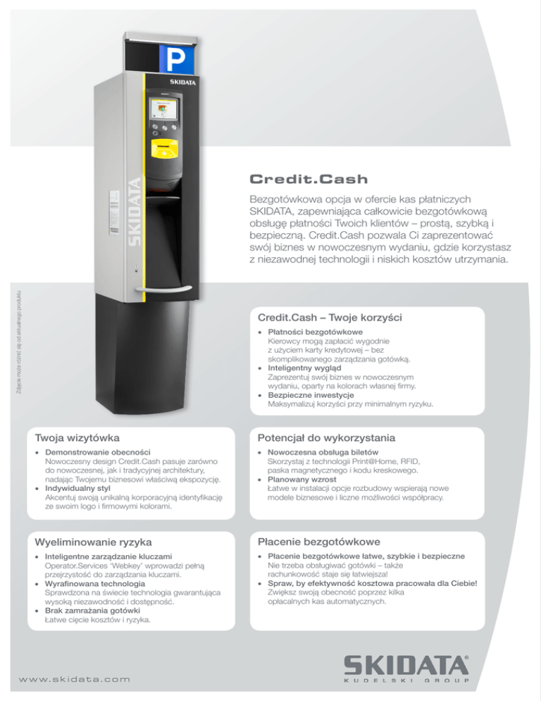 C r edit.C a s h Zdjęcie może różnić się od aktualnego produktu Bezgotówkowa opcja w ofercie kas płatniczych SKIDATA, zapewniająca całkowicie bezgotówkową obsługę płatności Twoich klientów – prostą, szybką i bezpieczną. Credit.Cash pozwala Ci zaprezentować swój biznes w nowoczesnym wydaniu, gdzie korzystasz z niezawodnej technologii i niskich kosztów utrzymania. Credit.Cash – Twoje korzyści • Płatności bezgotówkowe Kierowcy mogą zapłacić wygodnie z użyciem karty kredytowej – bez skomplikowanego zarządzania gotówką. • Inteligentny wygląd Zaprezentuj swój biznes w nowoczesnym wydaniu, oparty na kolorach własnej firmy. • Bezpieczne inwestycje Maksymalizuj korzyści przy minimalnym ryzyku. Twoja wizytówka Potencjał do wykorzystania • Demonstrowanie obecności Nowoczesny design Credit.Cash pasuje zarówno do nowoczesnej, jak i tradycyjnej architektury, nadając Twojemu biznesowi właściwą ekspozycję. • Indywidualny styl Akcentuj swoją unikalną korporacyjną identyfikację ze swoim logo i firmowymi kolorami. • Nowoczesna obsługa biletów Skorzystaj z technologii Print@Home, RFID, paska magnetycznego i kodu kreskowego. • Planowany wzrost Łatwe w instalacji opcje rozbudowy wspierają nowe modele biznesowe i liczne możliwości współpracy. Wyeliminowanie ryzyka Płacenie bezgotówkowe • Inteligentne zarządzanie kluczami Operator.Services ‘Webkey’ wprowadzi pełną przejrzystość do zarządzania kluczami. • Wyrafinowana technologia Sprawdzona na świecie technologia gwarantująca wysoką niezawodność i dostępność. • Brak zamrażania gotówki Łatwe cięcie kosztów i ryzyka. • Płacenie bezgotówkowe łatwe, szybkie i bezpieczne Nie trzeba obsługiwać gotówki – także rachunkowość staje się łatwiejsza! • Spraw, by efektywność kosztowa pracowała dla Ciebie! Zwiększ swoją obecność poprzez kilka opłacalnych kas automatycznych. w w w. s k i d a t a . c o m 724 (28.504'') 340 (13.386'') 346 (13.071'') (13.622'') <50 (1.969'') 518 (20.394'') 455 (17.913'') 423 (16.654'') 110° 554 (21.811'') 1045 (41.142'') 332 554 (21.811'') Wszystkie wymiary w mm 724 (28.504'') 185 (7.283'') 313 (12.323'') 332 346 158 (13.071'') (13.622'') (6.220'') Cechy Opcje Design/Budowa • Kompaktowy, nowoczesny design • Obudowa ze stali malowanej proszkowo oraz elementy wykonane z poliwęglanu • Strefy pod rozbudowę o dodatkowe komponenty, jak PIN-Pad, terminal kart kredytowych, drukarka fiskalna • Analogowy interkom, funkcja alarmu, przycisk wywołania i 3 programowalne klawisze • Bufor pamięci (zapewnia prawidłowe zarządzanie transakcjami na wypadek awarii zasilania, do 10 min.) • Ogrzewanie, chłodzenie i zasilacz • Wydawanie do 3000 paragonów • Jednostka sterująca w komplecie z twardym dyskiem Działanie • Kolorowy wyświetlacz TFT 14.5 cm (5.7''), odporny na rozbicie ekran monitora • Ergonomiczne rozmieszczenie elementów wymagających interakcji ze strony użytkownika • Poradnik dla użytkownika na kolorowym wyświetlaczu i podświetlanych piktogramach • Użytkownik może zmienić język obsługi na ekranie w dowolnym momencie • Urządzenie wyjątkowo łatwe w obsłudze przed administratorów Design/Budowa • Podświetlane dodatki (zintegrowany znak “Parking”, symbole monety i banknotu, przestrzeń na logo Klienta) • Podstawa (opcjonalnie z otwieranymi drzwiami przednimi lub bez nich) • Podstawa ‘podwyższona’ (opcjonalnie z otwieranymi drzwiami przednimi lub bez nich) • Konsola do mocowania na ścianie • System zamków z elektronicznymi i mechanicznymi zamkami (obsługujące konfigurowalne uprawnienia dostępu) Technologia koder/bilet • Koder Unlimited (obsługujący różne nośniki danych zależnie od wybranych modułów) • Koder Basic (do poprzecznych kodów kreskowych i walidacji ze stemplem walidacyjnym) • Moduł RFID (do czytania i zapisywania/kodowania kart Keycards) • Skaner Print@Home Specyfikacja techniczna Wymiary 340 mm × 1045 mm × 455 mm / 13.39" × 41.14" × 17.91" (Szer. × Wys. × Głębo.) – bez podstawy Wysokość z podstawą ‘podwyższoną’ 1769 mm / 69.65" Napięcie 230 V AC / 50 Hz; 120 V AC / 60 Hz Zużycie energii 600 W (z włączonym ogrzewaniem) Temperatury pracy podczas działania −25 °C do +50 °C (−13 °F do +122 °F) temperatury otoczenia; urządzenie nienarażone na bezpośrednie działanie promieni słonecznych Kolor obudowy i dodatkowego oświetlenia RAL 9007 (szary aluminiowy) Kolor plastikowych elementów na froncie RAL 9005 (głęboki czarny) Kolor panelu frontowego RAL 9007 (szary aluminiowy), RAL 7021 (szaro-czarny) Kolor podstawy RAL 7021 (szaro-czarny) Slot biletu Pantone 114 U (żółty) Obsługiwane format nośników danych Bilety SKIDATA do nadruku termicznego, z/bez paska magnetycznego, SKIDATA ThermoPlast oraz z paskiem magnetycznym w standardzie ISO, zgodnie ze smart card ISO 7816, bezstykowe ISO 14443, zgodne z ISO 15693 Opcje dla terminali płatniczych: smar cards, karty EC, karty kredytowe Funkcjonalność zintegrowanych nośników danych jest przedmiotem indywidualnej konfiguracji systemu. Deklaracje / Certyfikaty CE, FCC, IC, CNRTLUS (tylko opcja 120 V), Ukr-Sepro Stopień zabezpieczenia bazujący na IEC 60529 IP43, jeśli kasa zainstalowana w bezpiecznym miejscu, zgodnie z opisem w instrukcji montażu SKIDATA AG • Untersbergstraße 40 • A-5083 Grödig/Salzburg [t] +43 6246 888-0 • [f] +43 6246 888-7 • [e] [email protected] [w] www.skidata.com • Version 4.9 • 03.12.2015 © 2015 SKIDATA AG. All rights reserved. The content provided herein is subject to change and possible editorial errors. Country-specific versions may vary. SKIDATA® is a registered trademark of SKIDATA AG in the USA, the European Union and other countries. Terms and conditions of the authorized SKIDATA distributor apply. The operator is fully responsible for compliance with any legal provisions applicable to the operation 