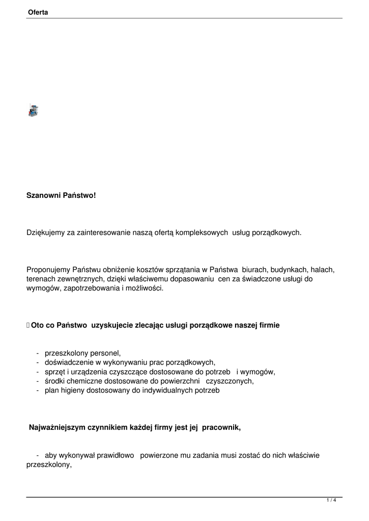 Oferta Szanowni Państwo! Dziękujemy za zainteresowanie naszą ofertą kompleksowych usług porządkowych. Proponujemy Państwu obniżenie kosztów sprzątania w Państwa biurach, budynkach, halach, terenach zewnętrznych, dzięki właściwemu dopasowaniu cen za świadczone usługi do wymogów, zapotrzebowania i możliwości. Oto co Państwo uzyskujecie zlecając usługi porządkowe naszej firmie - przeszkolony personel, doświadczenie w wykonywaniu prac porządkowych, sprzęt i urządzenia czyszczące dostosowane do potrzeb i wymogów, środki chemiczne dostosowane do powierzchni czyszczonych, plan higieny dostosowany do indywidualnych potrzeb Najważniejszym czynnikiem każdej firmy jest jej pracownik, - aby wykonywał prawidłowo powierzone mu zadania musi zostać do nich właściwie przeszkolony, 1/4 Oferta ( dzięki naszej firmie redukujecie Państwo koszty związane ze szkoleniem swoich pracowników, ponieważ to my zapewniamy odpowiednio wyszkolony personel ) - aby miał odpowiednią motywację do pracy musi otrzymywać stosowne wynagrodzenie, oraz świadczenia socjalne ( redukujecie Państwo koszty związane z zatrudnieniem dodatkowego pracownika do wykonywania usług porządkowych, nasza firma dzięki prawidłowej polityce delegowania zadań jest w stanie zagwarantować wynagrodzenie swoim pracownikom adekwatne do wykonywanych prac ) - każdy z nas jest narażony na utratę zdrowia, każdy z nas musi odpoczywać, również personel sprzątający ( dzięki zleceniu usług porządkowych naszej firmie zachowujecie Państwo ciągłość w wykonywaniu tych usług w swoich obiektach, zapewniamy zawsze zastępstwo w przypadku choroby pracownika, lub okresu urlopowego ) - bardzo ważne jest doświadczenie, które nabywane jest wraz z ilością wykonywanych zadań, oraz różnorodnym ich zakresem ( dzięki naszej firmie nie narażacie Państwo swoich lokali na nie właściwe wykonanie usług porządkowych, doświadczenie nabyte na różnych obiektach pozwala nam na prawidłowe wykonanie powierzonych prac ) Aby prawidłowo wykonać powierzone zadania, pracownik musi posiadać odpowiedni sprzęt do ich realizacji - istotnym elementem jest właściwy dobór sprzętu do wykonywanych czynności ( redukujecie Państwo koszty związane z zakupem sprzętu i urządzeń niezbędnych do prawidłowego utrzymania czystości, ten sprzęt my dostarczamy mając na uwadze właściwy dobór do zadań jakie nam Państwo powierzycie ) - każdy sprzęt, urządzenia należy okresowo konserwować, a w przypadku awarii zlecić ich naprawę ( zapewniamy pełne zaplecze techniczne, oraz zamienne urządzenia w przypadku awarii, redukujecie Państwo w tym przypadku koszty związane z okresową konserwacją i naprawami lub wymianą zużytych urządzeń ) Właściwy dobór środków chemicznych - należy pamiętać że nie ma uniwersalnych środków czyszczących do każdej powierzchni ( dzięki doświadczeniu i niezbędnej wiedzy dostosujemy właściwe środki chemiczne do czyszczonej powierzchni tak aby nie narażać jej na uszkodzenia, a efekt czyszczenia został osiągnięty ) 2/4 Oferta Harmonogram sprzątania - każdy wie, że aby osiągnąć jak najlepsze wyniki swojej pracy, należy prawidłowo zaplanować wszystkie działania ( dzięki nabytemu doświadczeniu możemy Państwu zaproponować najbardziej optymalny plan utrzymania higieny w powierzonym obiekcie, dostosowując go do potrzeb i wymogów ) Ponadto możemy Państwu zaproponować specjalistyczne usługi związane z utrzymaniem czystości, oraz serwis konserwatorsko - naprawczy w Państwa lokalach ( np. prace hydrauliczne, remontowo budowlane, serwis instalacji elektrycznych, oraz inne prace związane z właściwym utrzymaniem obiektu. Dzięki możliwości zaoferowania kompleksowo wielu usług dla naszych Klientów, jesteśmy w stanie obniżyć ich koszt bez straty na jakości ich wykonania. Niektóre nasze usługi: - bieżące utrzymanie czystości w powierzonych obiektach ( biurowych, usługowych, magazynowych, produkcyjnych, mieszkalnych, i innych ) - serwis dzienny, zarówno ekip sprzątających jak i opiekę konserwacyjno naprawczą - serwis "24 godzinny na dobę", zapewniamy Państwu cało dobową opiekę interwencyjną w przypadku awarii, nie przewidzianych zdarzeń, etc. - mycie okien zarówno metodami tradycyjnymi jak i specjalistyczne mycie z użyciem podnośników i metod alpinistycznych, - mycie witryn, przeszkleń, reklam, banerów, - mycie i czyszczenie elewacji, pokryć dachowych, usuwanie graffiti, - polimeryzacja, krystalizacja posadzek i podłóg, - konserwacja podłóg drewnianych, drewnopochodnych, - pranie wykładzin, dywanów, tapicerki meblowej oraz samochodowej, - sprzątanie antyalergiczne z wykorzystaniem pary wodnej, - czyszczenie basenów publicznych, oraz przydomowych, - kompleksowe sprzątanie i doczyszczanie lokali po budowlanych, po remontowych, - sprzątanie podjazdów, placów, parkingów, terenów zewnętrznych, - utrzymanie terenów zieleni, koszenie trawy, wycinka drzew, 3/4 Oferta Mamy nadzieję że nasza oferta spotka się z Państwa zainteresowaniem i przyczyni się do owocnej współpracy 4/4
