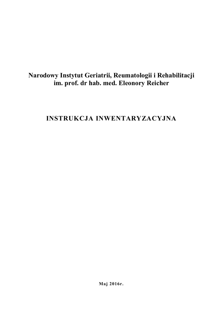Narodowy Instytut Geriatrii, Reumatologii i Rehabilitacji im. prof. dr hab. med. Eleonory Reicher INSTRUKCJA INWENTARYZACYJNA Maj 2016r. I. POSTANOWIENIA OGÓLNE §1 Instrukcja inwentaryzacyjna została opracowana o rachunkowości z dnia 29 września 1994 r. na podstawie przepisów ustawy §2 Zasady przeprowadzenia inwentaryzacji określone niniejszą instrukcją mają zastosowanie i dotyczą majątku Narodowego Instytutu Geriatrii, Reumatologii i Rehabilitacji im. prof. dr hab. med. Eleonory Reicher lub dóbr pozostających w Użytkowaniu, zarządzaniu albo ewidencji Instytutu. §3 Podstawowym celem instrukcji inwentaryzacyjnej jest określenie zasad, trybu i metod przeprowadzenia inwentaryzacji aktywów i pasywów w jednostce. II. POJĘCIE, CEL I ZAKRES INWENTARYZACJI §4 Inwentaryzacja to zespół czynności zmierzających do ustalenia w sposób udokumentowany rzeczywistego stanu składników aktywów i pasywów jednostki na określony dzień. Inwentaryzacja jest jedną z metod i jednym z głównych elementów kontroli wewnętrznej stanowiącej niezbędne ogniwo procesu zarządzania jednostką. §5 Celem inwentaryzacji jest okresowe sprawdzanie stanu aktywów i pasywów wykazanych w księgach rachunkowych ze stanem faktycznym i na tej podstawie: 1) doprowadzenie danych wynikających z ksiąg rachunkowych do zgodności ze stanem faktycznym, 2) rozliczenia osób materialnie odpowiedzialnych (współodpowiedzialnych) za powierzone im mienie, 3) dokonanie oceny gospodarczej przydatności składników majątku jednostki, 4) przeciwdziałanie nieprawidłowościom w gospodarce majątkiem jednostki. §6 Inwentaryzacja obejmuje wszystkie aktywa i pasywa ujęte w ewidencji jednostki, a w szczególności: 1) rzeczowe składniki majątkowe jednostki, 2) pieniężne składniki majątkowe tj. gotówka w kasie, czeki, weksle, 3) obce składniki środków trwałych i obrotowych, będące na przechowaniu jednostki, 4) rozrachunki finansowe, w tym między innymi: a) salda rachunków bankowych i kredytów oraz pożyczek, b) salda rozrachunków z dostawcami i odbiorcami, c) salda innych należności i zobowiązań. 5) inne aktywa i pasywa, a mianowicie między innymi: a) składniki środków trwałych i obrotowych, przejściowo znajdujących się poza jednostką a stanowiących jej własność, b) wartości niematerialne i prawne. III. TERMINY I CZĘSTOTLIWOŚĆ PRZEPROWADZANIA INWENTARYZACJI §7 Terminy i częstotliwość przeprowadzania inwentaryzacji: 1) na ostatni dzień każdego roku obrotowego należy przeprowadzić inwentaryzację: a) środków pieniężnych krajowych i zagranicznych w kasie, akcji, obligacji, bonów i innych papierów wartościowych, rzeczowych składników aktywów obrotowych, druków ścisłego zarachowania, a także środków trwałych w budowie, znajdujących się na terenie niestrzeżonym - drogą spisu z natury ilości, porównania wartości z danymi ksiąg rachunkowych i rozliczania ewentualnych różnic, b) środków pieniężnych krajowych i zagranicznych, zgromadzonych na rachunkach bankowych lub przechowywanych przez inne jednostki, należności, w tym udzielonych pożyczek - drogą uzyskania od banków i kontrahentów potwierdzeń pisemnych prawidłowości wykazanego w księgach rachunkowych jednostki stanu tych aktywów lub pasywów oraz wyjaśnienia i rozliczenia ewentualnych różnic, c) aktywów i pasywów nieobjętych spisem z natury lub uzgodnieniem, tj. gruntów stanowiących mienie jednostki, środków trwałych trudno dostępnych oglądowi, należności spornych i wątpliwych, należności i zobowiązań wobec pracowników, należności i zobowiązań z tytułów publicznoprawnych, należności i zobowiązań wobec osób nieprowadzących ksiąg rachunkowych, środków trwałych w budowie, których spis z natury jest niemożliwy przeprowadza się przez porównanie danych ewidencyjnych ze stanem wynikającym z dowodów księgowych, d) inwentaryzacją należy objąć również znajdujące się w jednostce składniki majątkowe ujęte wyłącznie w ewidencji ilościowej a także te będące własnością innych jednostek. 2) raz wciągu dwóch lat: a) zapasów materiałów i towarów znajdujących się w strzeżonych składowiskach i objętych ewidencją ilościowo-wartościową 3) raz w ciągu czterech lat: a) nieruchomości zaliczonych do środków trwałych oraz inwestycji, jak też znajdujących się na terenie strzeżonym innych środków trwałych oraz maszyn i urządzeń wchodzących w skład środków trwałych w budowie. §8 Terminy i częstotliwość inwentaryzacji określone w § 7 uważa się za dotrzymane, jeżeli inwentaryzację składników aktywów z wyłączeniem środków pieniężnych, papierów wartościowych, materiałów, rozpoczęto nie wcześniej niż trzy miesiące przed końcem roku obrotowego i zakończono do 15 dnia następnego roku (styczeń), ustalenie zaś stanu nastąpiło przez dopisanie lub odpisanie od stanu stwierdzonego droga spisu z natury lub potwierdzenia salda (zwiększenia lub zmniejszenia), jakie nastąpiły między datą spisu lub potwierdzenia a dniem ustalenia stanu wynikającego z ksiąg rachunkowych, przy czym stan wynikający z ksiąg rachunkowych może być ustalony po dniu bilansowym. §9 Oprócz inwentaryzacji wynikających z § 7 należy przeprowadzić inwentaryzację doraźną na dzień zmiany osoby materialnie odpowiedzialnej, a także na dzień, w którym wystąpiły wypadki losowe lub inne przyczyny, w wyniku których naruszony został stan składników majątkowych (pożar, kradzież, powódź itp.), na dzień zakończenia działalności przez komórkę organizacyjną, jednostkę oraz na dzień poprzedzający postawienie jej w stan likwidacji lub ogłoszenia upadłości. IV. ODPOWIEDZIALNOŚĆ ZA SKŁADNIKI MIENIA §10 Odpowiedzialność za właściwą eksploatację i ochronę składników majątkowych ponoszą pracownicy, którym powierzono nadzór nad tymi składnikami w związku z zajmowanym stanowiskie