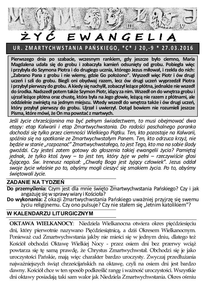 U R . Z M A R T Y C H W S T A N I A P AŃ S K I E G O , * C * J 2 0 , - 9 * 2 7 . 0 3 . 2 0 1 6 Pierwszego dnia po szabacie, wczesnym rankiem, gdy jeszcze było ciemno, Maria Magdalena udała się do grobu i zobaczyła kamień odsunięty od grobu. Pobiegła więc i przybyła do Szymona Piotra i do drugiego ucznia, którego Jezus miłował, i rzekła do nich: „Zabrano Pana z grobu i nie wiemy, gdzie Go położono”. Wyszedł więc Piotr i ów drugi uczeń i szli do grobu. Biegli oni obydwaj razem, lecz ów drugi uczeń wyprzedził Piotra i przybył pierwszy do grobu. A kiedy się nachylił, zobaczył leżące płótna, jednakże nie wszedł do środka. Nadszedł potem także Szymon Piotr, idący za nim. Wszedł on do wnętrza grobu i ujrzał leżące płótna oraz chustę, która była na Jego głowie, leżącą nie razem z płótnami, ale oddzielnie zwiniętą na jednym miejscu. Wtedy wszedł do wnętrza także i ów drugi uczeń, który przybył pierwszy do grobu. Ujrzał i uwierzył. Dotąd bowiem nie rozumieli jeszcze Pisma, które mówi, że On ma powstać z martwych. Jeśli życie chrześcijanina ma być pełnym świadectwem, to musi obejmować dwa etapy: etap Kalwarii i etap Zmartwychwstania. Do radości paschalnego poranka dochodzi się tylko przez ciemności Wielkiego Piątku. Ten, kto pozostaje na Kalwarii, spóźnia się na spotkanie ze Zmartwychwstałym Panem. Ten, kto odrzuca krzyż, nie będzie w stanie „rozpoznać” Zmartwychwstałego, to jest Tego, kto ma na sobie ślady gwoździ. Czy jesteś zatem gotowy do głoszenia takiej ewangelii życia? Pamiętaj jednak, że tylko ktoś żywy – to jest ten, który żyje w pełni – rzeczywiście głosi Żyjącego. Św. Ireneusz napisał: „Chwałą Boga jest żyjący człowiek”. Jezus oddał swoje życie właśnie po to, abyśmy mogli cieszyć się smakiem życia. Po to, abyśmy świętowali życie. ZADANIE NA TYDZIEŃ Do przemyślenia: Czym jest dla mnie święto Zmartwychwstania Pańskiego? Czy i jak angażuję się w sprawy wiary i Kościoła? Do wykonania: Z okazji Zmartwychwstania Pańskiego uważniej przyjrzę się swemu życiu religijnemu. Czy ono pulsuje? Czy nie stałem się „letnim katolikiem”? W KALENDARZU LITURGICZNYM OKTAWA WIELKANOCY: Niedziela Wielkanocna otwiera okres pięćdziesięciu dni, który pierwotnie nazywano Pięćdziesiątnicą, a dziś Okresem Wielkanocnym. PoniewaŜ cud Zmartwychwstania jakby nie mieści się w jednym dniu, dlatego teŜ Kościół obchodzi Oktawę Wielkiej Nocy - przez osiem dni bez przerwy wciąŜ powtarza się tę samą prawdę, Ŝe Chrystus Zmartwychwstał. Obchodzi się je jako uroczystości Pańskie, mają więc charakter bardzo uroczysty. Zwyczaj przedłuŜania najwaŜniejszych świąt chrześcijańskich na oktawę, czyli na osiem dni jest bardzo dawny. Kościół chce w ten sposób podkreślić rangę i waŜność uroczystości. Wszystkie dni oktawy posiadają taki sam walor jak Niedziela Zmartwychwstania. Okres ośmiu dni traktowany jest jak jeden dzień, jako jedno święto, jako dzień najradośniejszy. Dlatego np., w oktawie Wielkanocy nie obowiązuje post w piątek. Teksty liturgiczne i biblijne wszystkich dni oktawy Wielkanocy nawiązują bezpośrednio do wydarzenia zmartwychwstania Jezusa i jego konsekwencji dla nas. Znajdujemy takŜe wyraźne odniesienia do sakramentu chrztu i tego co staje się udziałem kaŜdego ochrzczonego. Ostatnim dniem oktawy jest Biała Niedziela, nazywana obecnie takŜe Niedzielą Miłosierdzia BoŜego. W ten dzień w Rzymie ochrzczeni podczas Wigilii Paschalnej neofici, odziani w białe szaty podarowane im przez gminę chrześcijańską, szli w procesji do kościoła św. Pankracego, by tam uczestniczyć w Mszy św. Jan Paweł II ustanowił ten dzień świętem Miłosierdzia BoŜego, którego wielką orędowniczką była św. Faustyna Kowalska. Wielkanoc jest pierwszym i najwaŜniejszym świętem chrześcijańskim. Apostołowie świętowali tylko Wielkanoc i kaŜdą niedzielę, która jest właśnie pamiątką Nocy Paschalnej. Dopiero z upływem wieków zaczęły pojawiać się inne święta i okresy przygotowania aŜ ukształtował się obecny rok liturgiczny, który jednak przechodzi zmiany. Nie znamy dokładnej daty powstania oktawy Paschy. Wspomina o niej w IV stuleciu Asteriusz Sofista z Kapadocji. Była ona traktowana wyjątkowo przez nowo ochrzczonych. Cały tydzień chodzili oni bowiem w białych szatach i uczestniczyli w codziennej Eucharystii ze specjalną mistagogiczną katechezą (miała ona na celu wprowadzenie w tajemnicę obecności Chrystusa we wspólnocie wierzących). WARTO WIEDZIEĆ NOWENNA DO MIŁOSIERDZIA BOZEGO – w Wielki Piątek rozpoczęliśmy nowennę, która ma nas przygotować do Święta Miłosierdzia Bożego (3 kwietnia). Przez dziewięć dni codziennie odmawiamy Koronkę do Miłosierdzia Bożego w specjalnych intencjaach, które Pan Jezus podyktował św. s. Faustynie w sierpniu 1937 roku. Mówił: „pragnę, abyś przez te dziewięć dni sprowadzała dusze do zdroju mojego miłosierdzia, by zaczerpnęły siły i ochłody, i wszelkiej łaski, jakiej potrzebują na trudy życia, a szczególnie w śmierci godzinie. W każdym dniu przyprowadzisz do serca mego odmienną grupę dusz i zanurzysz je w tym morzu miłosierdzia mojego. A ja te wszystkie dusze wprowadzę w dom Ojca mojego. Czynić to będziesz w tym życiu i w przyszłym. I nie odmówię żadnej duszy niczego, którą wprowadzisz do źródła miłosierdzia mojego. W każdym dniu prosić będziesz Ojca mojego przez gorzką mękę moją o łaski dla tych dusz. INTENCJE - dz. 1.: dusze wszystkich grzeszników (zob. 1210); dz.2: dusze kapłańskie i dusze zakonne (zob. 1212); dz. 3: dusze pobożne i wierne (zob. 1214); dz. 4: dusze pogan i tych, którzy mnie jeszcze nie znają (zob. 1216); dz. 5: dusze heretyków i odszczepieńców (zob. 1218); dz. 6: dusze ciche i pokorne, i dusze małych dzieci (zob. 1220); dz. 7: dusze, które szczególnie czcz
